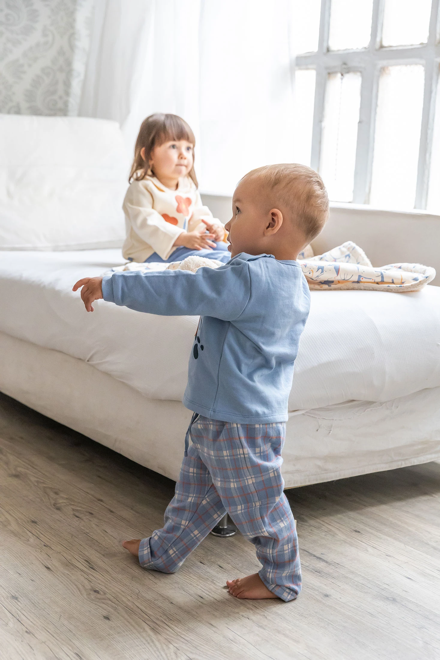 Strickset für Babys in Blau mit einem Design aus Tieren und Karos, ideal für Herbst- und Wintersaison. Hergestellt aus weichem Strickstoff, garantiert es maximalen Komfort und Wärme für dein Kleines an kühleren Tagen. Die Zusammensetzung des Stoffes bietet eine hervorragende Atmungsaktivität und sorgt dafür, dass das Baby den ganzen Tag über bequem bleibt. Erhältlich in Größen von 1 bis 24 Monaten, lässt es sich leicht mit anderen neutralen oder ergänzenden Artikeln aus der Kinderkleidung kombinieren. Dieses Set verleiht dem Alltag deines Babys einen charmanten Stil.