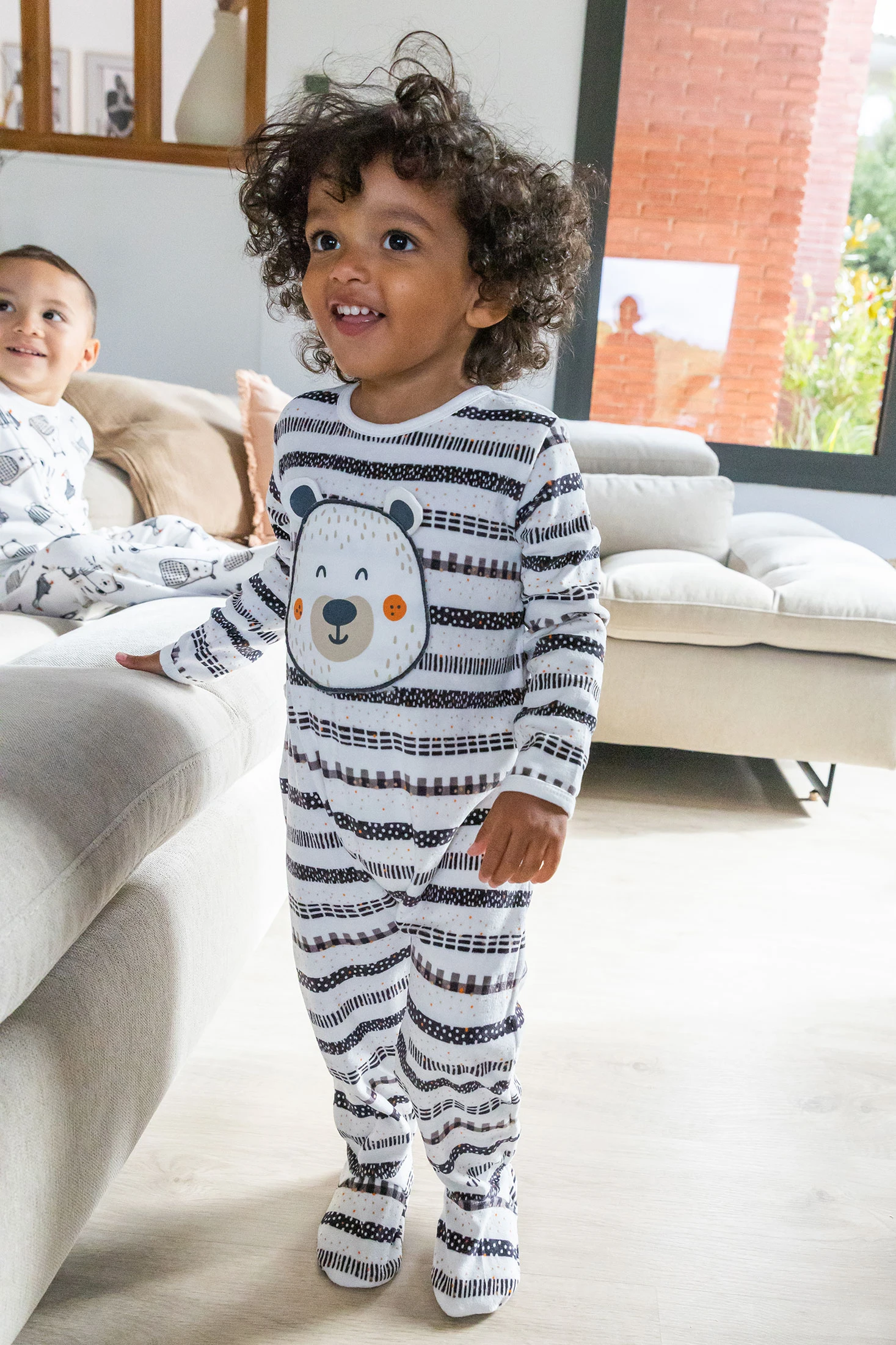 Strickstrampler für Babys, langärmelig, ideal für die kälteren Monate, um sicherzustellen, dass Ihr Kleiner warm und bequem bleibt. Hergestellt aus einem hochwertigen Strickgewebe, bietet er den ganzen Tag über Weichheit und Komfort. Sein Design zeigt einen niedlichen Print in Weiß und Dunkelgrau mit einem Tiermotiv auf der Vorderseite, der einen lustigen und modernen Akzent setzt. Erhältlich in Größen von 0 Monaten bis 2 Jahren, ist er eine ideale Wahl, um ihn an Wintertagen mit Mützen zu kombinieren.