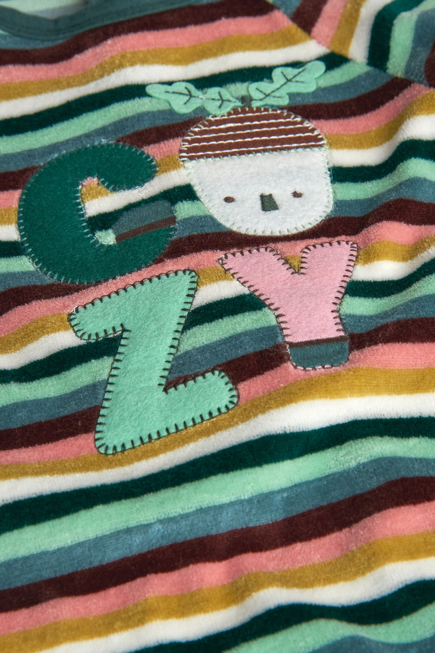 Gestreifter Samt-Baby-Strampler, perfekt, um Ihr Kleines in den kalten Monaten warm und gemütlich zu halten. Hergestellt aus weichem Samtstoff, ist er in Größen von 0 Monaten bis 2 Jahren erhältlich und sorgt für eine bequeme Passform, während Ihr Baby wächst. Sein buntes Design sorgt für einen lustigen und lebhaften Stil, während die langen Ärmel und die bedeckten Füße maximalen Schutz vor Kälte bieten. Ideal, um es allein oder in Kombination mit einer Mütze und einer Decke zu tragen, ist dieser Strampler ein Muss in der Garderobe jedes Babys.