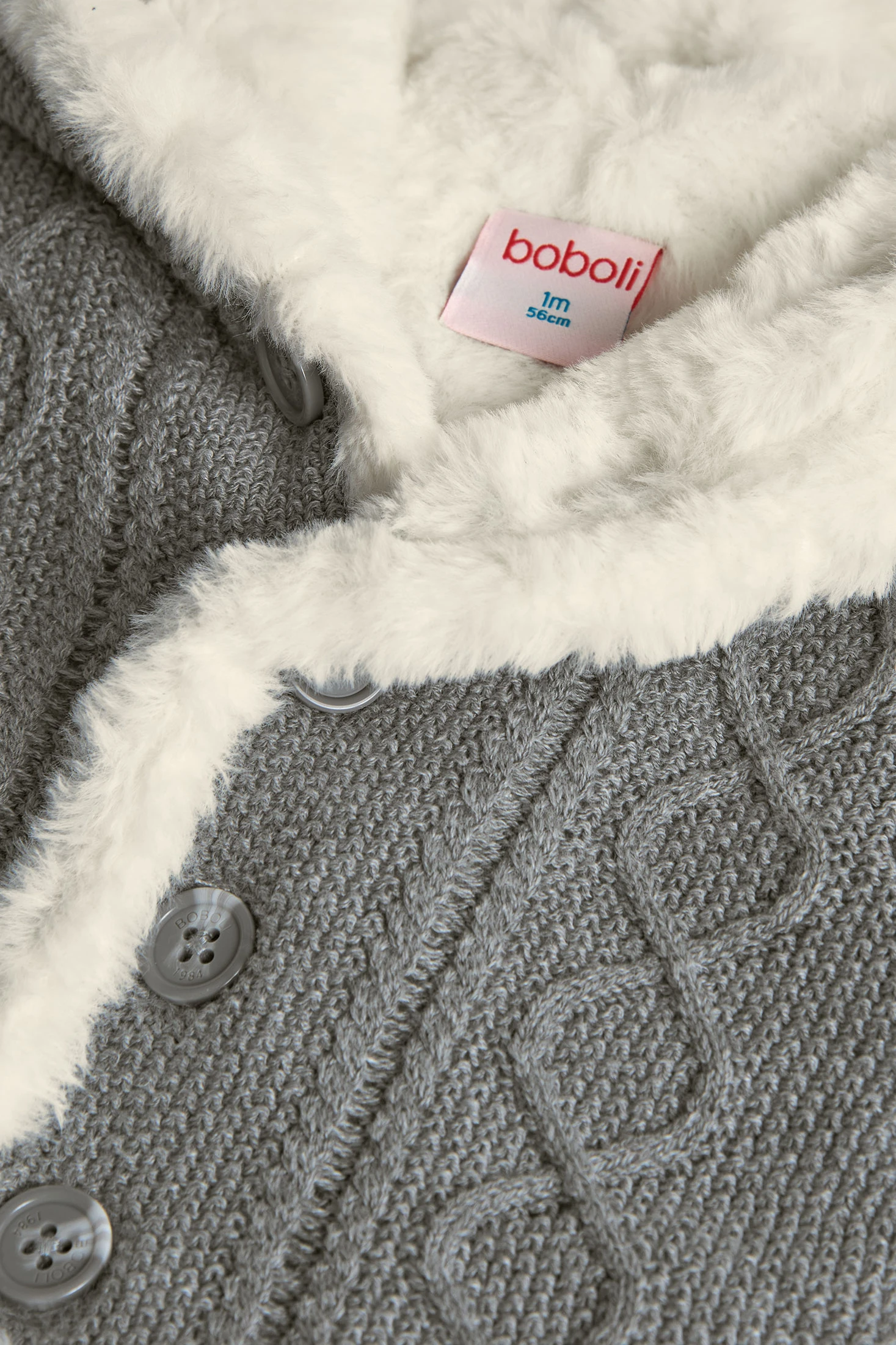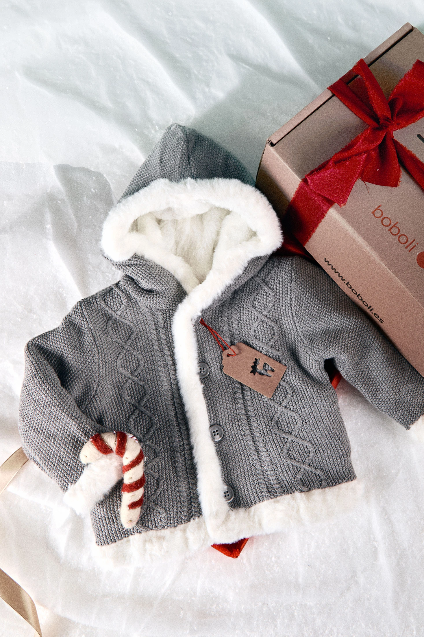 Strickjacke für Babys in meliertem Grau, dieses wendbare Kleidungsstück ist für die Herbst- und Wintersaison konzipiert und bietet Vielseitigkeit und Stil. Hergestellt aus Strickstoff, bietet sie Wärme und Weichheit für die Kleinen und gewährleistet den ganzen Tag Komfort. Ihr Design umfasst einen praktischen Knopfverschluss und sie ist in Größen von 1 Monat bis 2 Jahre erhältlich. Die Kombination aus meliertem Grau mit der Rückseite ermöglicht eine einfache Anpassung an verschiedene Outfits und Anlässe. Ideal für Eltern, die Funktionalität suchen, ohne auf Stil bei der Kleidung ihrer Babys zu verzichten.