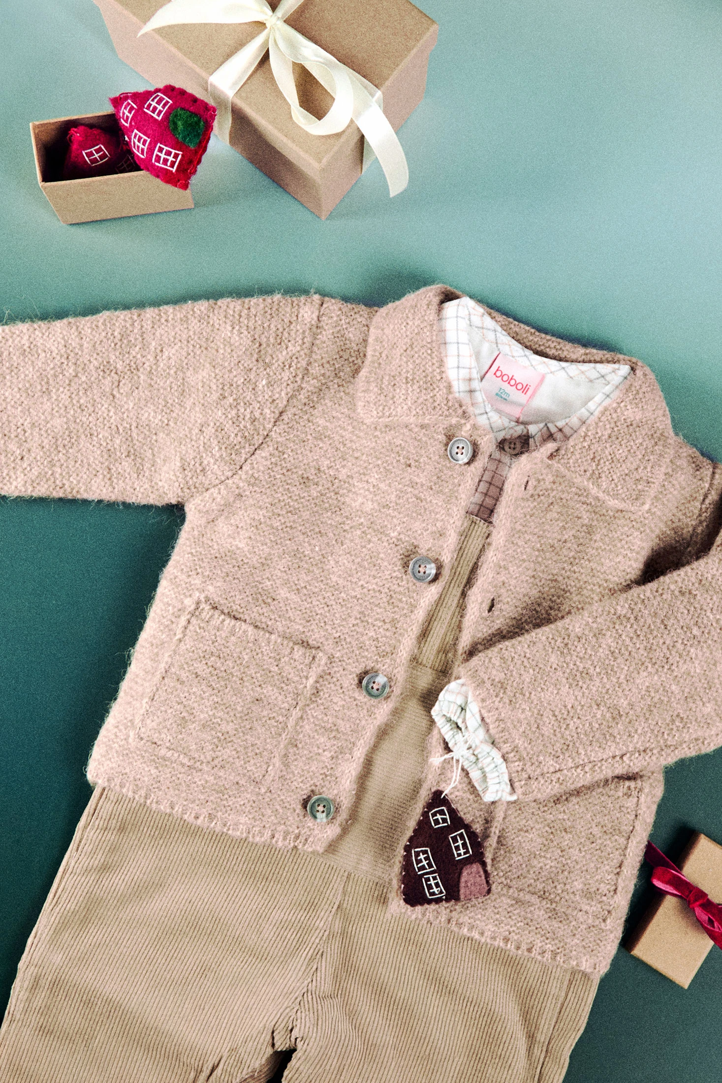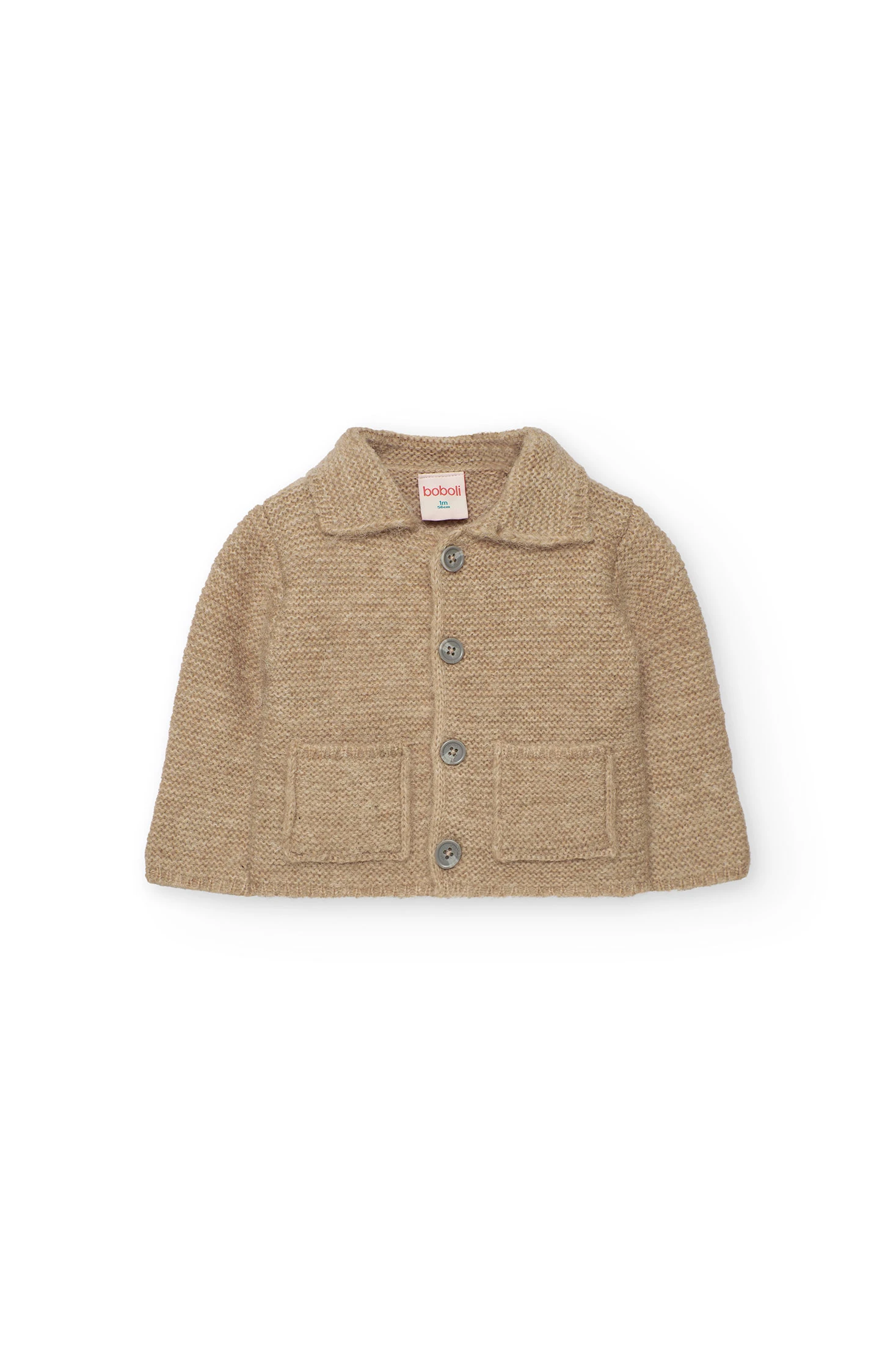 Beige Strickjacke für Babys, entworfen für Komfort und Wärme in den Herbst- und Wintermonaten. Hergestellt aus einem weichen und zarten Strickstoff, ist sie ideal, um Ihr Kleines vor der Kälte zu schützen. Das klassische und schlichte Design in Beige verleiht einen Hauch von Raffinesse und lässt sich leicht mit Hosen oder formellen Outfits für besondere Anlässe kombinieren. Erhältlich in den Größen von 1 Monat bis 2 Jahre, wird diese Jacke zu einem vielseitigen Bestandteil der Garderobe Ihres Babys.