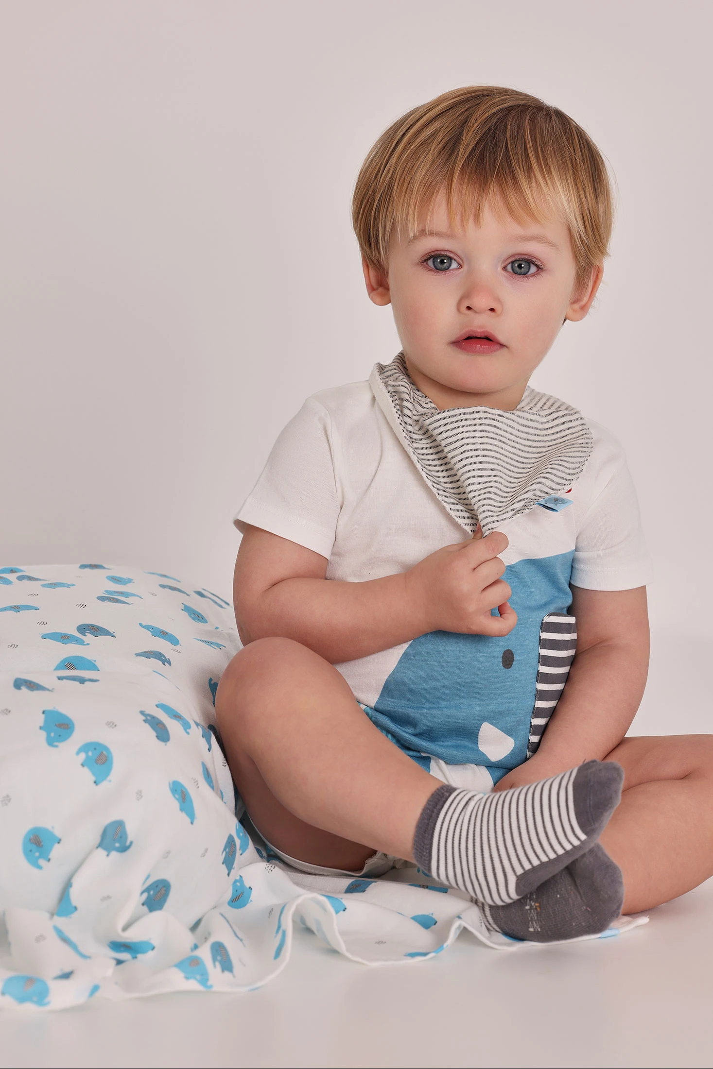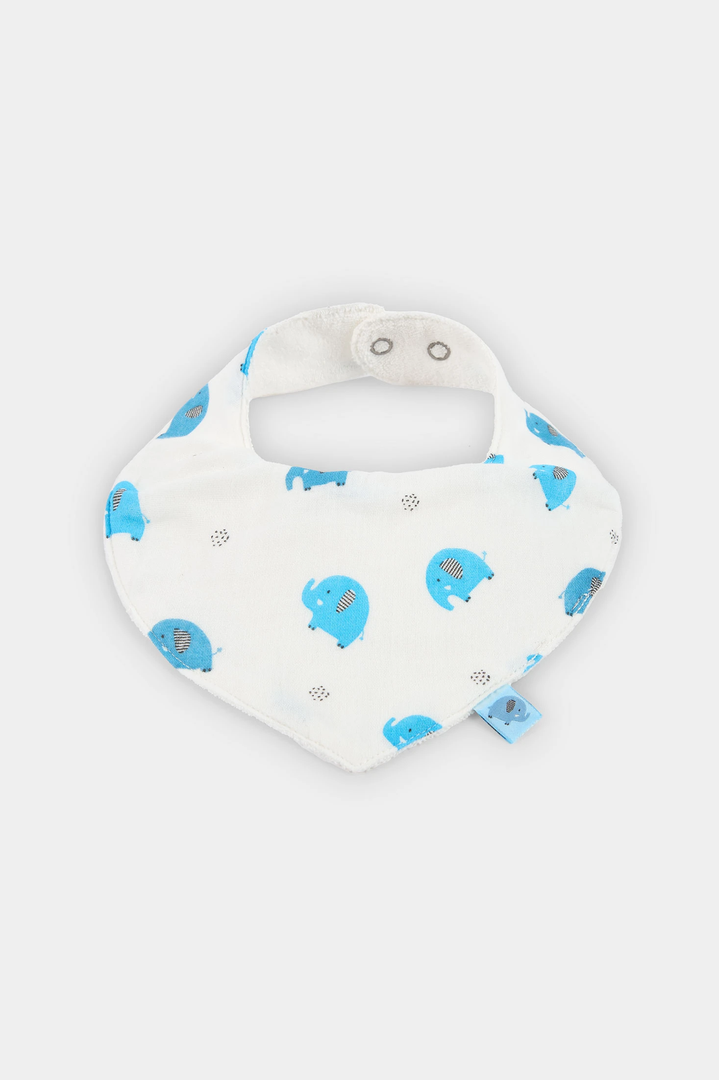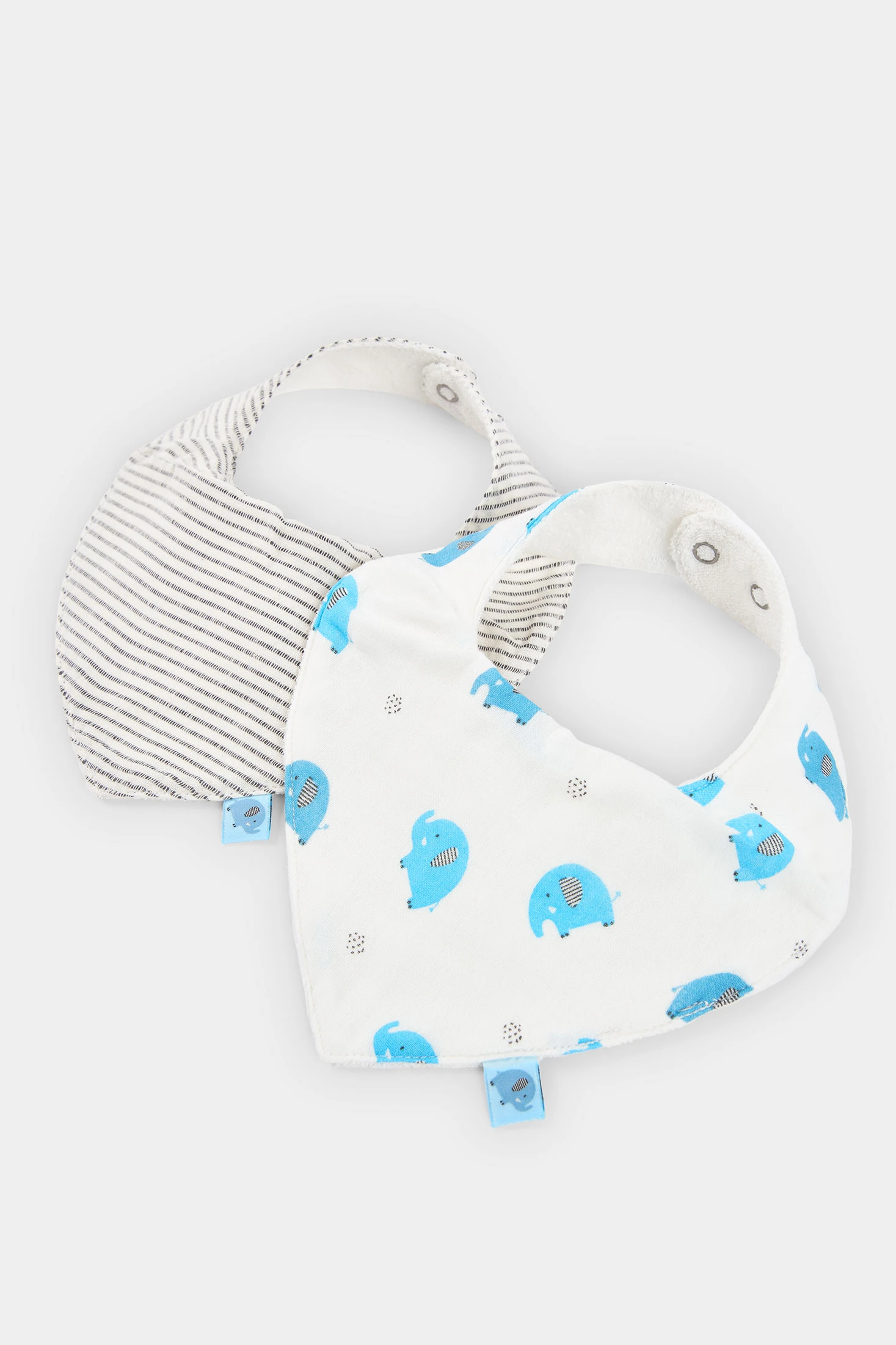 2er-Pack Baby-Baumwolltücher bietet ideale Weichheit und Komfort für die Kleinsten. Das Design umfasst eines mit Streifenmuster und ein weiteres mit lustigen blauen Elefanten auf weißem Hintergrund. Sie sind praktisch, um die Kleidung Ihres Babys beim Essen oder Spielen zu schützen. Geeignet für Babys von 0 bis 12 Monaten. Ihre neutralen Farben und freundlichen Muster machen sie perfekt, um mit jedem Kinderoutfit kombiniert zu werden und gleichzeitig Funktionalität und Stil zu gewährleisten.
