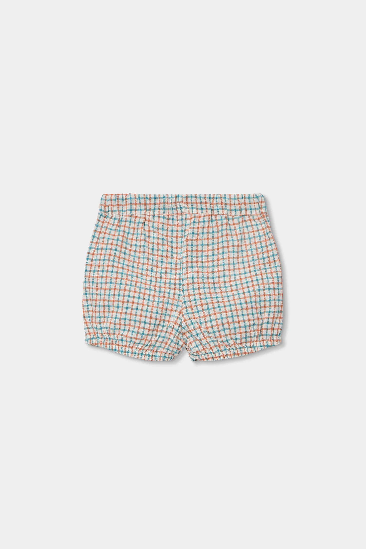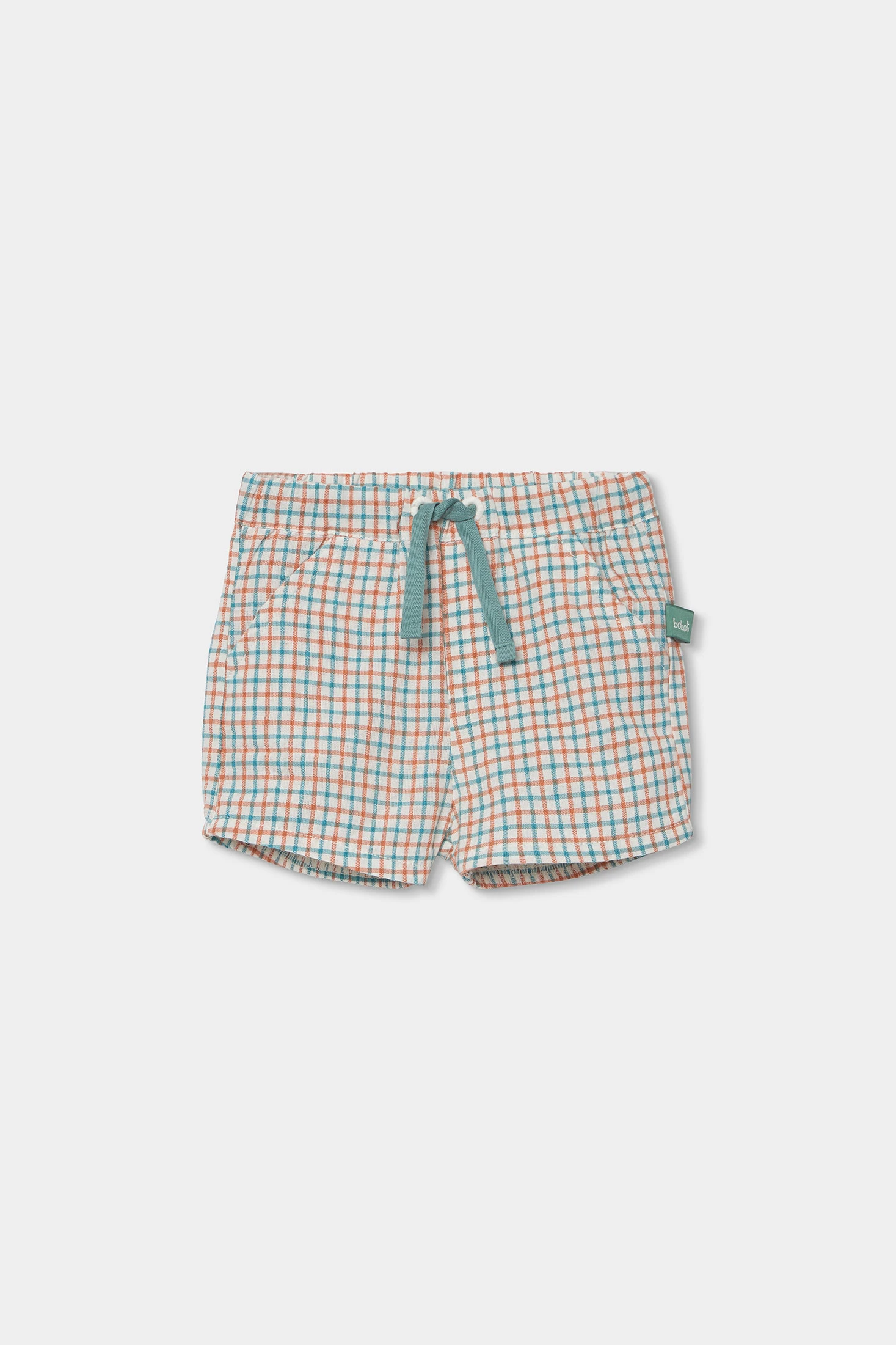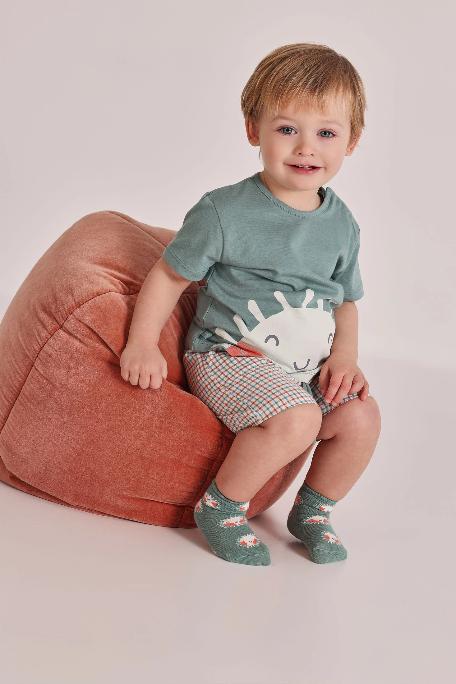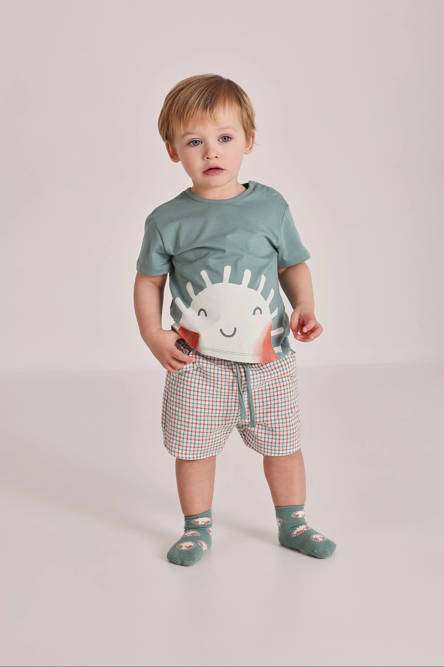 Baumwoll-Kinderset in Grün, ideal für warmes Klima. Das T-Shirt hat ein fröhliches Design mit einer lächelnden Sonne, das einen fröhlichen Touch verleiht. Kurze Hose mit einem Karomuster, das den Stil ergänzt. Erhältlich in Größen von 1 Monat bis 24 Monaten, ist es perfekt für den täglichen Komfort der Kleinen, bietet Weichheit und Frische. Sein vielseitiges Design ermöglicht es, es leicht mit anderen Kleidungsstücken für einen lässigen und bequemen Look zu kombinieren.