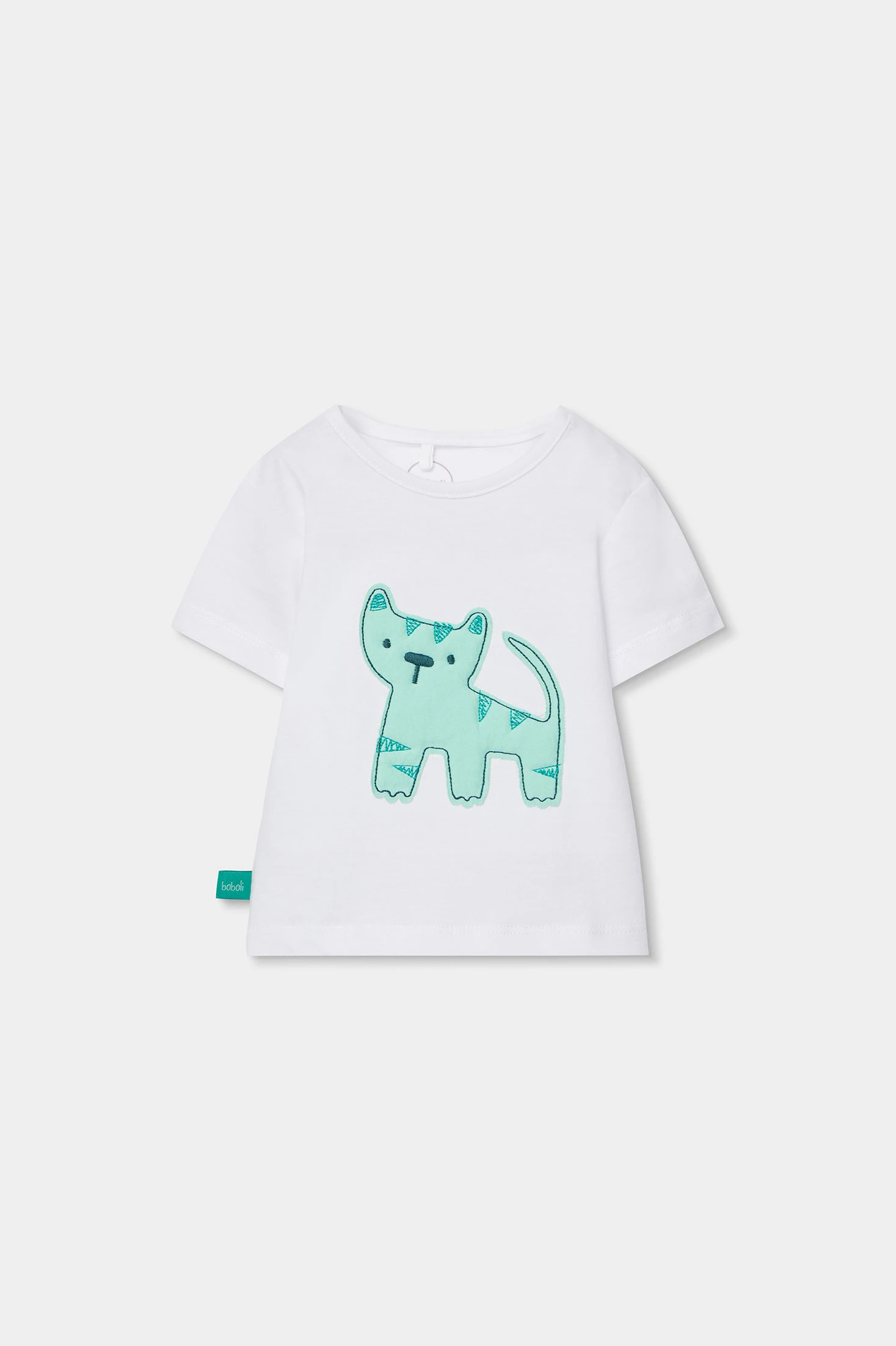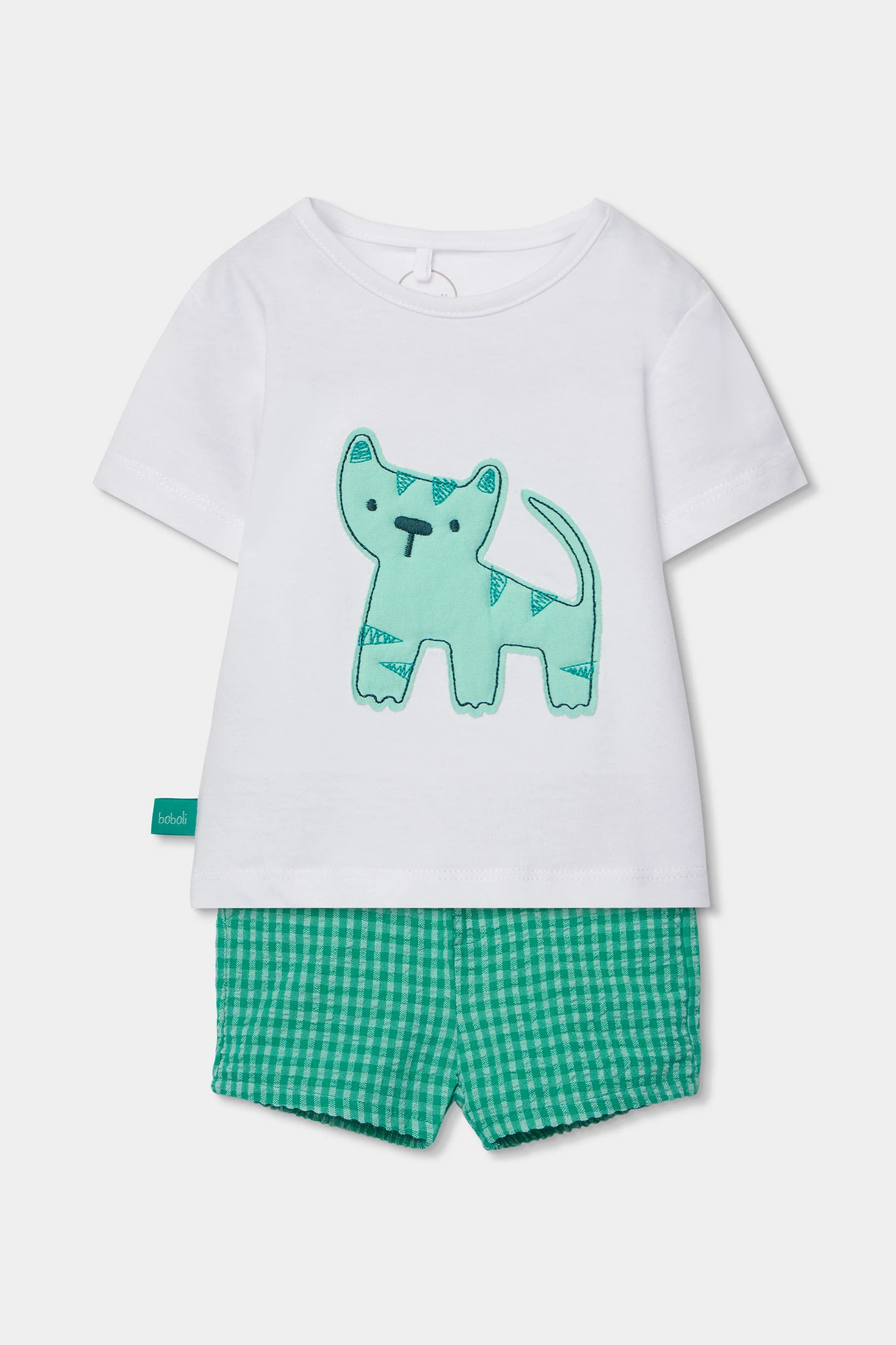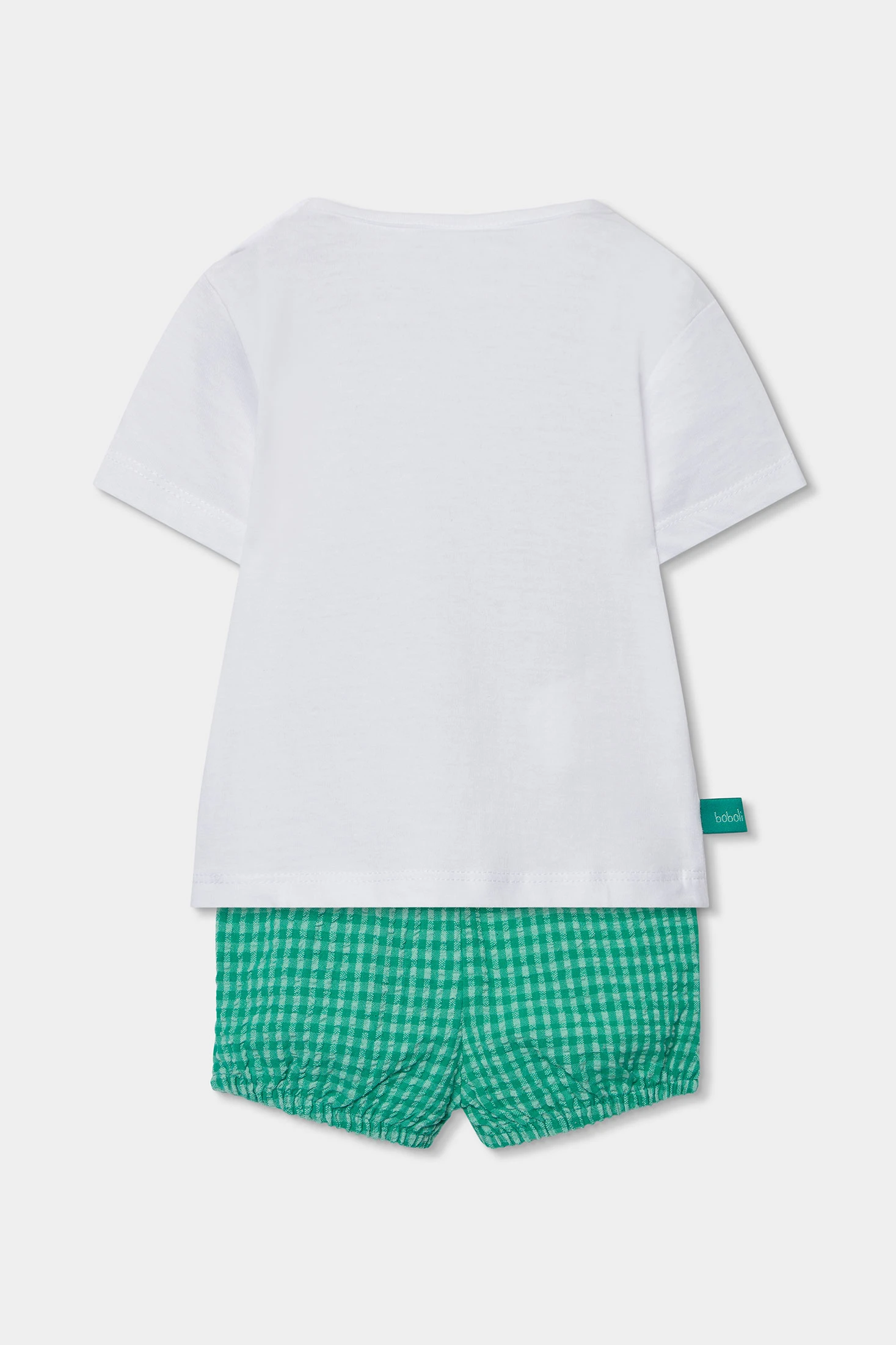 Baumwollset für Babys, perfekt für Alter von 1 bis 24 Monaten, bestehend aus einem weißen T-Shirt. Das Design beinhaltet eine Tierzeichnung in Grün, die dem Ensemble der grün karierten Bermudashorts einen lustigen und farbenfrohen Touch verleiht. Das Baumwollmaterial gewährleistet Weichheit und Komfort, ideal für die empfindliche Babyhaut. Mit einem runden Ausschnitt ist es einfach an- und auszuziehen. Die kurzen Ärmel machen es für den täglichen Gebrauch in wärmeren Klimazonen geeignet. Ein vielseitiges Kleidungsstück, das sich gut mit verschiedenen Outfits kombinieren lässt und einen praktischen und niedlichen Stil bietet.