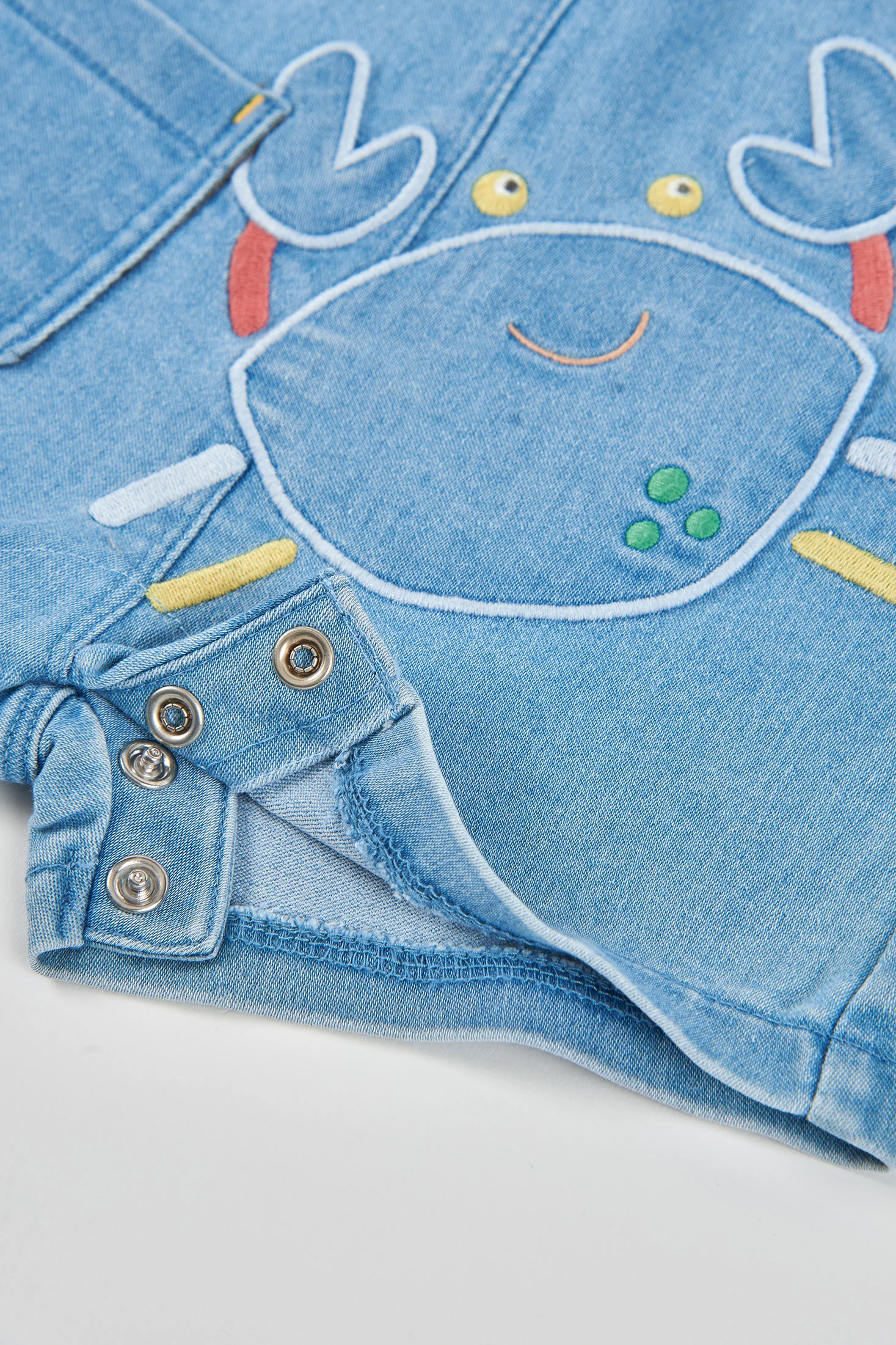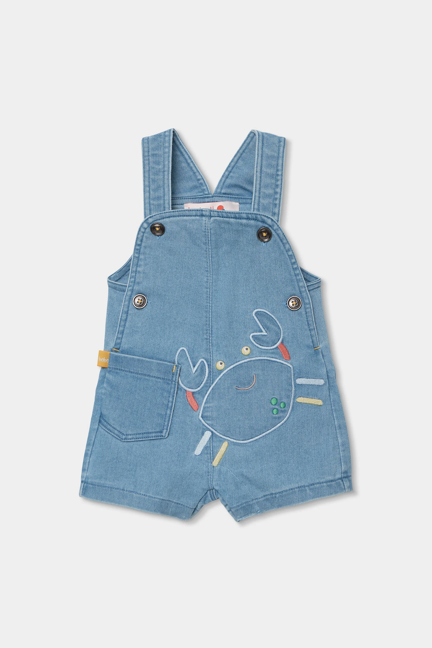 Set für Jungenbaby, das ein bedrucktes Baumwoll-T-Shirt mit einer kurzen Latzhose aus Denim kombiniert. Das T-Shirt zeigt bunte Zeichnungen auf weißem Hintergrund, während die Latzhose ein lustiges eingesticktes Krabbendesign hat. Hergestellt für höchsten Komfort, ideal für das Alter von 1M bis 24M. Perfekt für den täglichen Gebrauch, kombiniert Stil und Funktionalität, und zeichnet sich durch sein frisches und weiches Gewebe für Babys aus.
