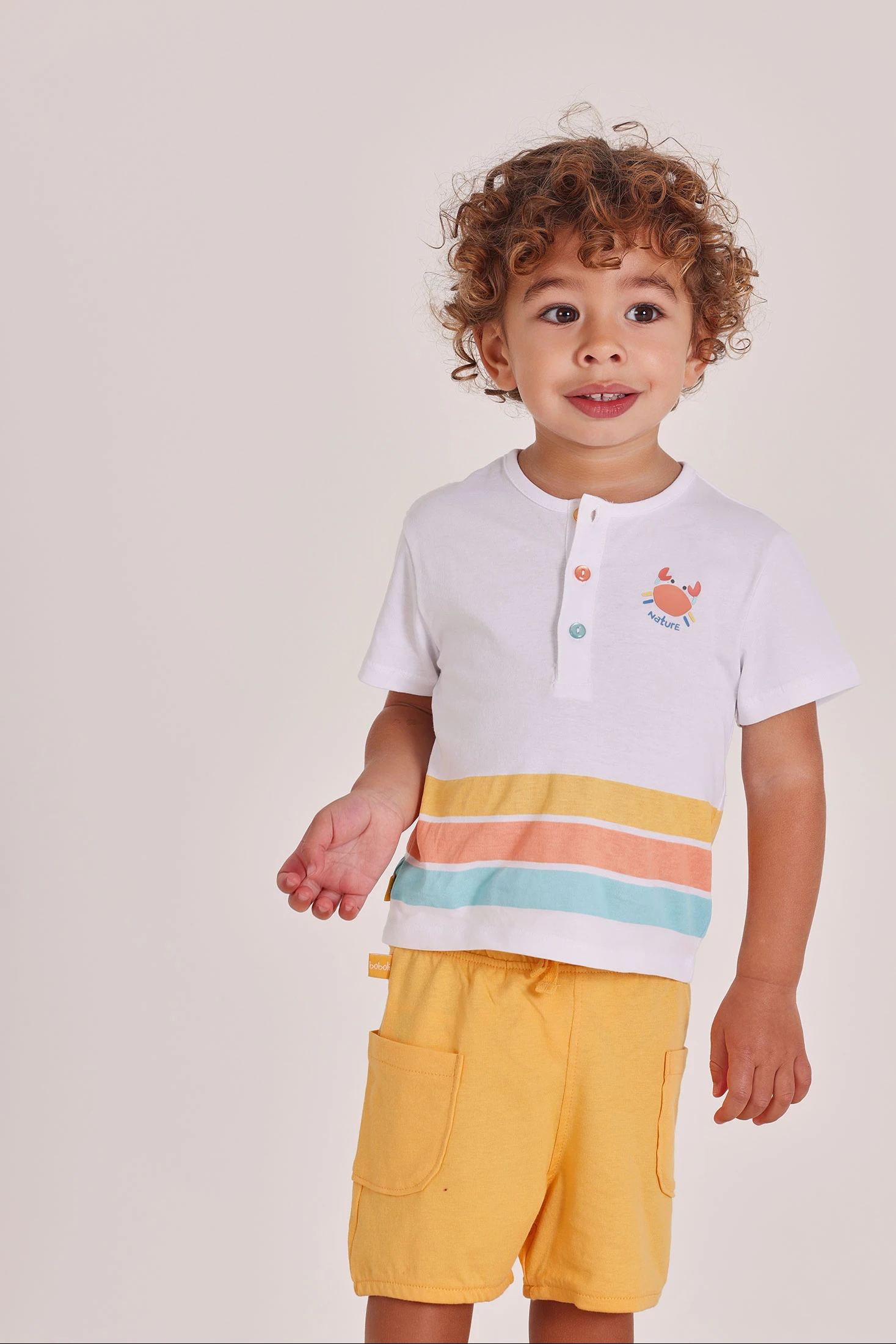 Weißes Baumwollset für Baby-Jungen, ideal für die ersten Lebensmonate. Erhältlich in Größen von 1 bis 24 Monaten bietet es Komfort und Stil. Das weiße T-Shirt zeigt einen Druck aus bunten Linien und eine Abbildung eines Krebses mit dekorativen Knöpfen auf der Brust. Die kurzen Ärmel und der Rundhals sorgen für Bewegungsfreiheit. Die gelbe Shorts ergänzt das Design und bietet Frische. Perfekt für warmes Wetter ist dieses Set praktisch und fröhlich für jeden lässigen Anlass.