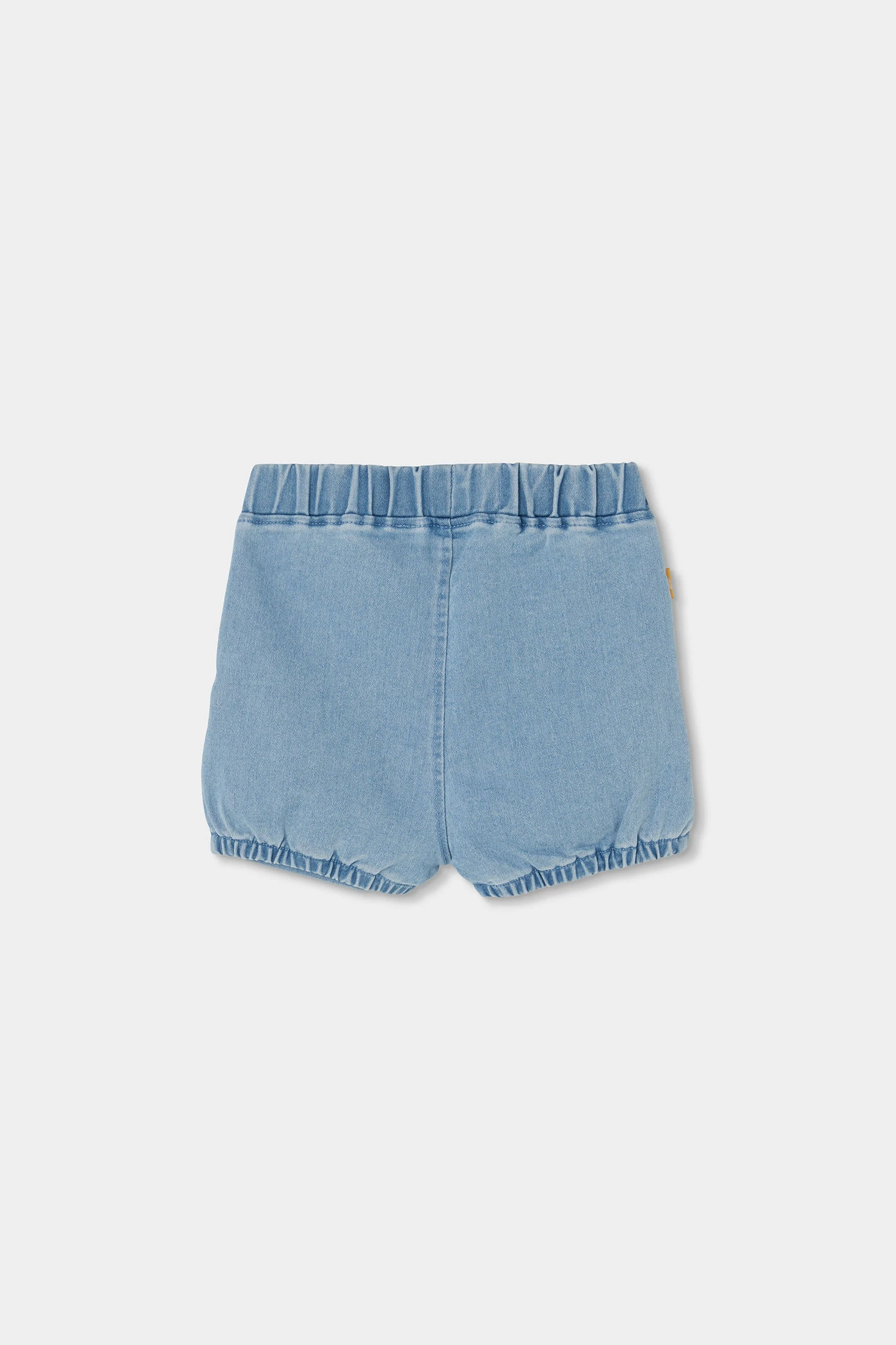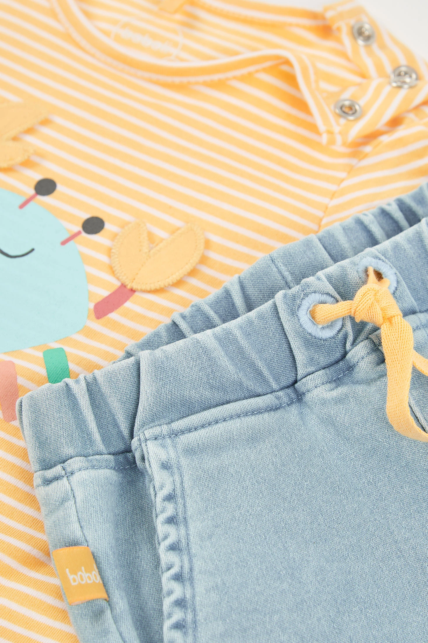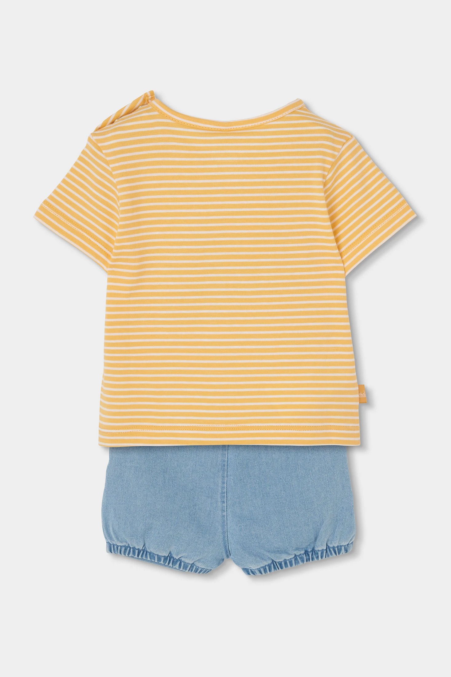Baby-Set aus T-Shirt und Hose aus gelber und blauer Baumwolle.