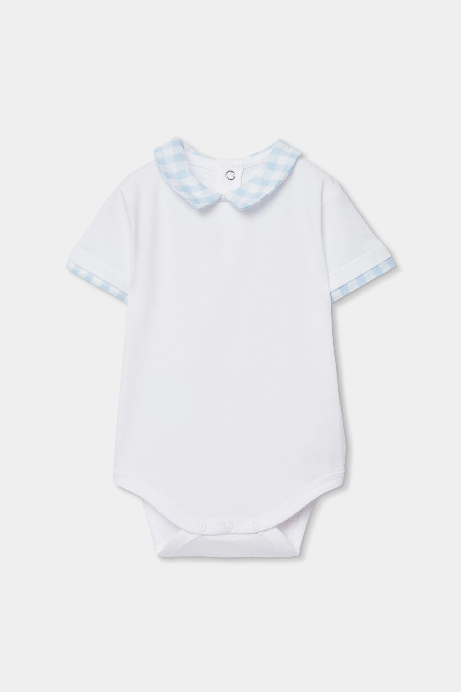 Baumwollset für Babys mit einem Karodesign in hellblauen Tönen. Das weiche Material sorgt für Komfort auf der empfindlichen Haut des Babys. Funktional und einfach anzuziehen, mit Knöpfen an den Trägern, ist es in Größen von 1 Monat bis 2 Jahre erhältlich. Enthält ein weißes Kurzarmhemd mit Kragen, das einen klassischen und eleganten Touch verleiht. Ideal für jeden Anlass, kann dieser Strampler leicht mit anderen Kleidungsstücken für einen charmanten Look kombiniert werden.
