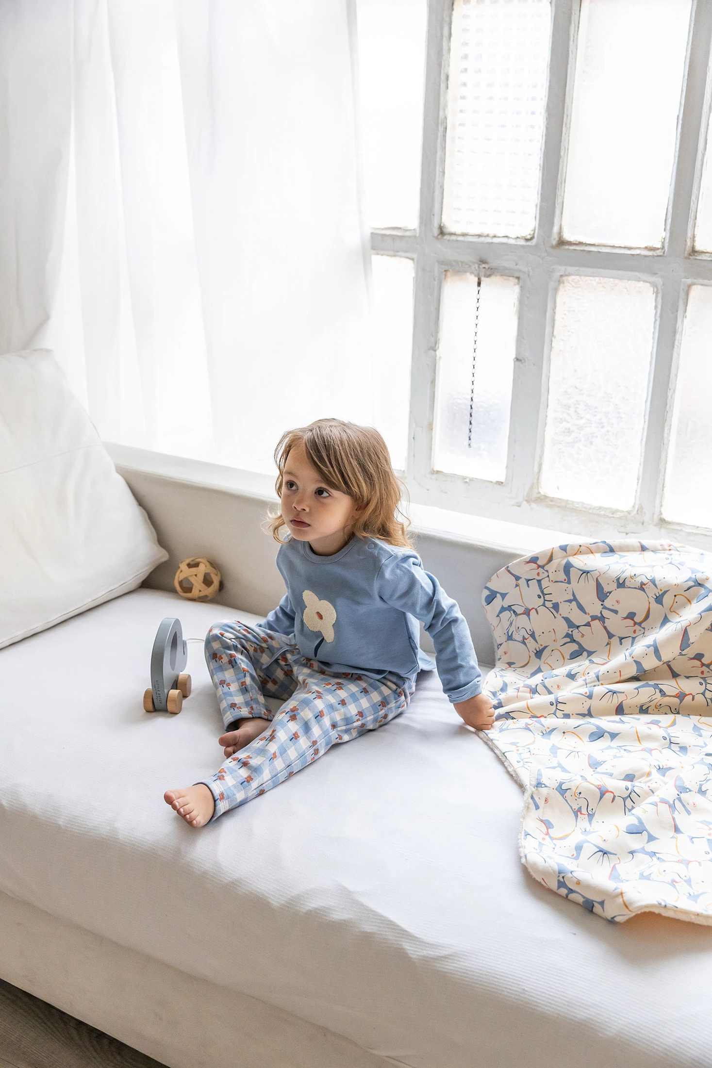 Blaues Strickset für Baby-Mädchen, das einen Pullover und Leggings umfasst, ideal um Komfort und Wärme in den kalten Monaten zu bieten. Der Pullover, gefertigt aus weichem Strickstoff, sorgt für ein gemütliches Gefühl für Ihr Kleines, während die passenden Leggings vielseitige Kombinationen mit anderen Accessoires oder Kleidungsstücken ermöglichen. Erhältlich in Größen von 1 Monat bis 2 Jahren, ist dieses Set perfekt für legere und familiäre Anlässe in der Herbst- und Wintersaison.