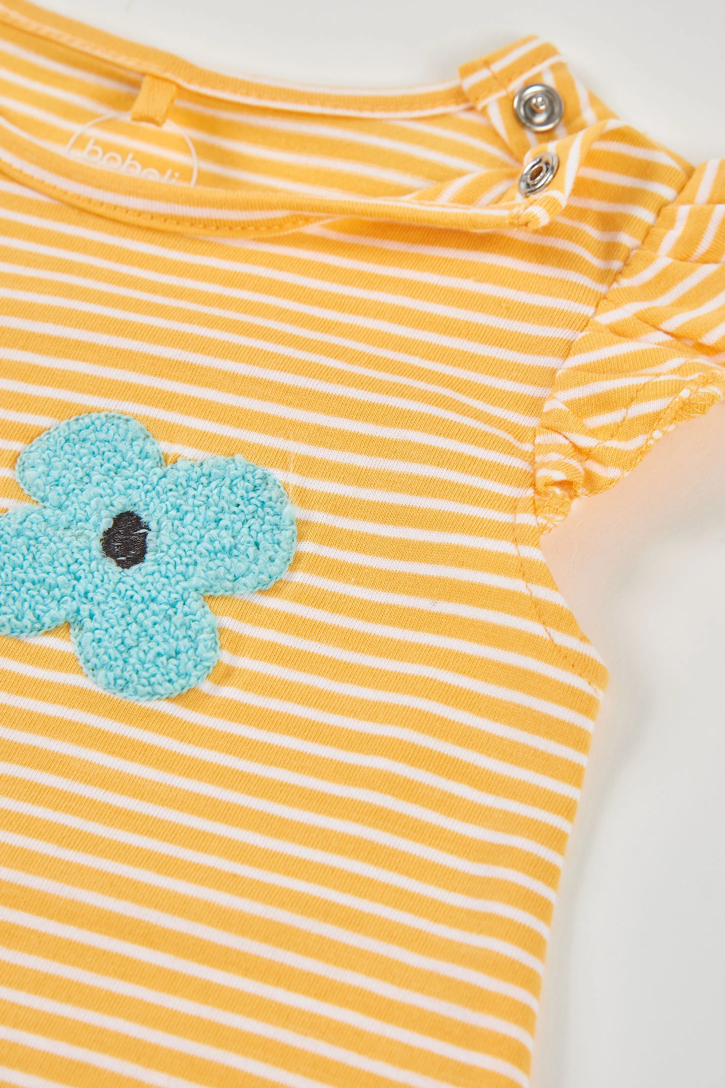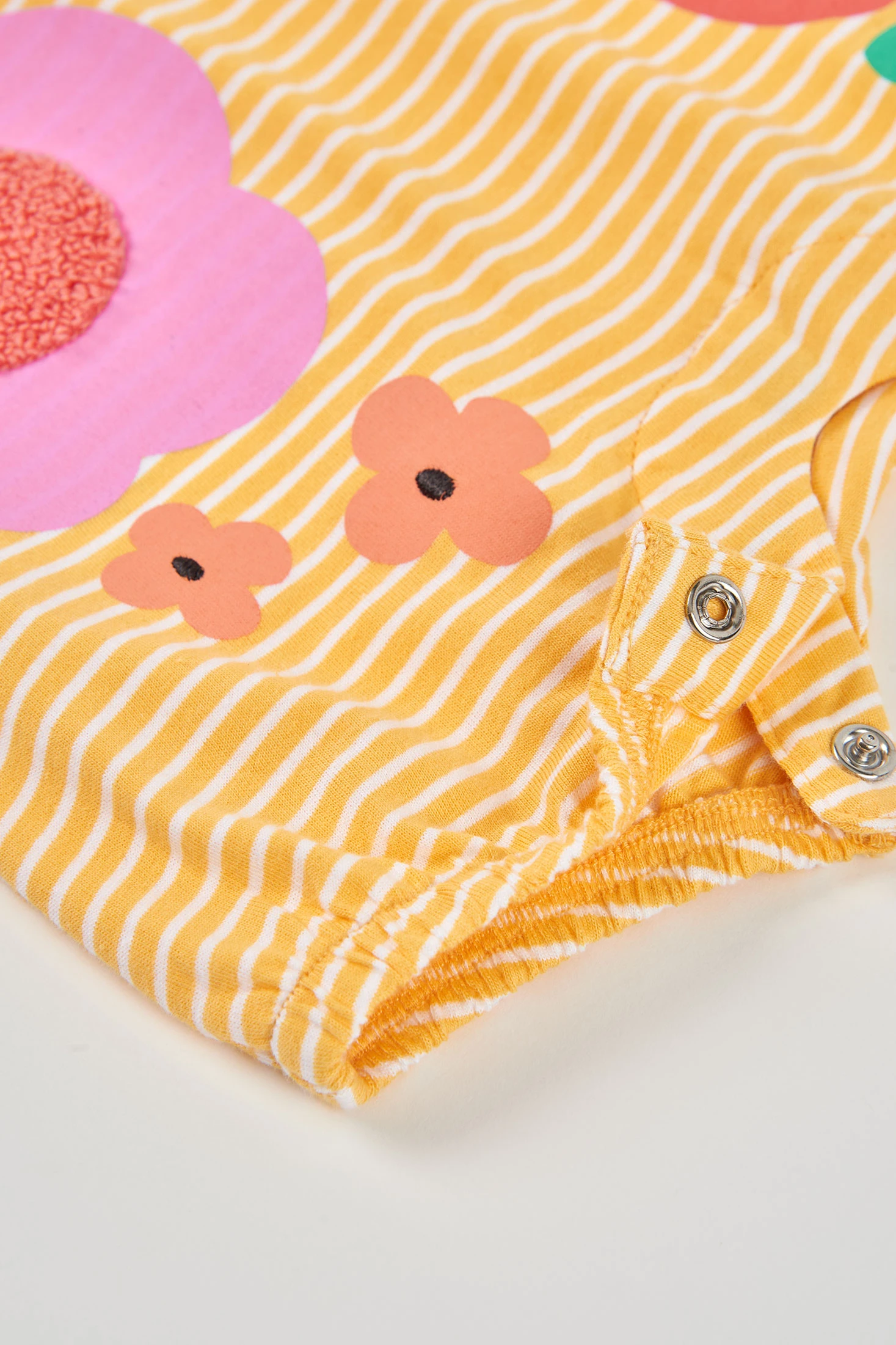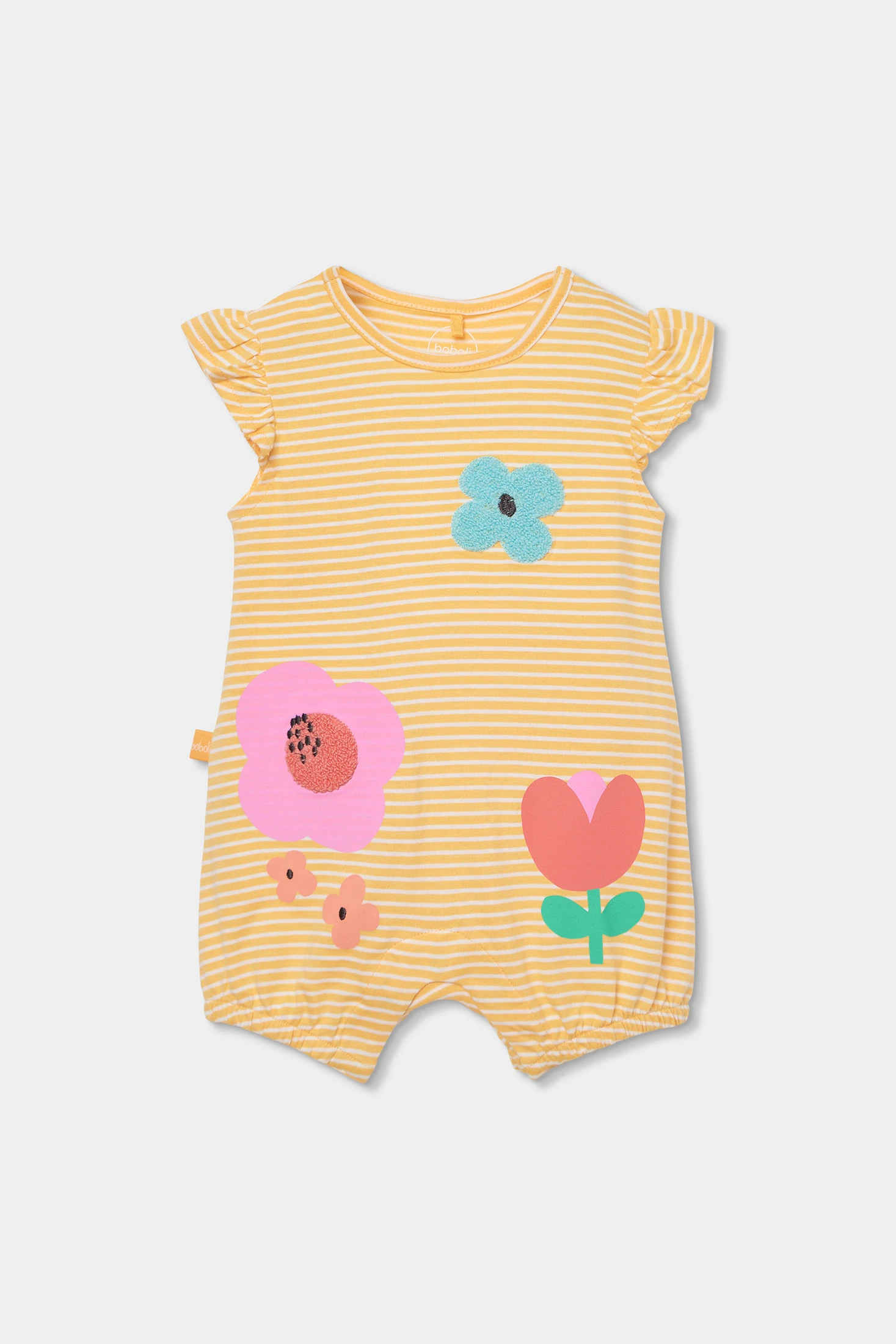 Baumwollstrampler für Babys, ideal für Neugeborene, mit einem gestreiften Design in Gelb und Weiß sowie Blumenmustern in lebendigen Farben, die einen fröhlichen und verspielten Touch verleihen. Das Kleidungsstück hat einen runden Halsausschnitt und kurze Flügelärmel. Es ist in Größen von 0 bis 24 Monate erhältlich und passt sich perfekt dem Wachstum des Babys an. Das weiche und leichte Material sorgt den ganzen Tag für angenehmen Tragekomfort.