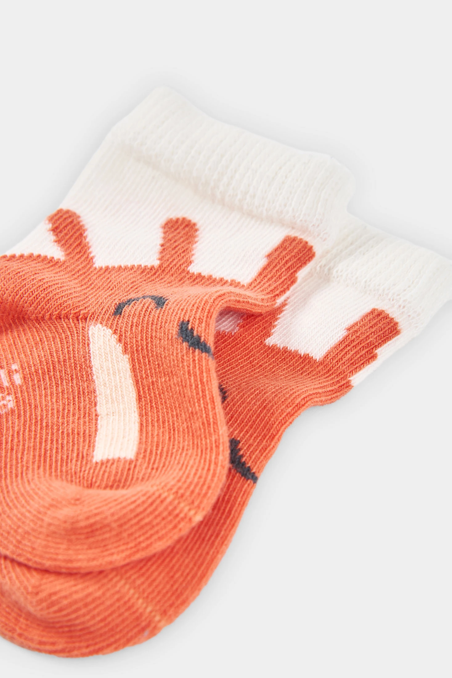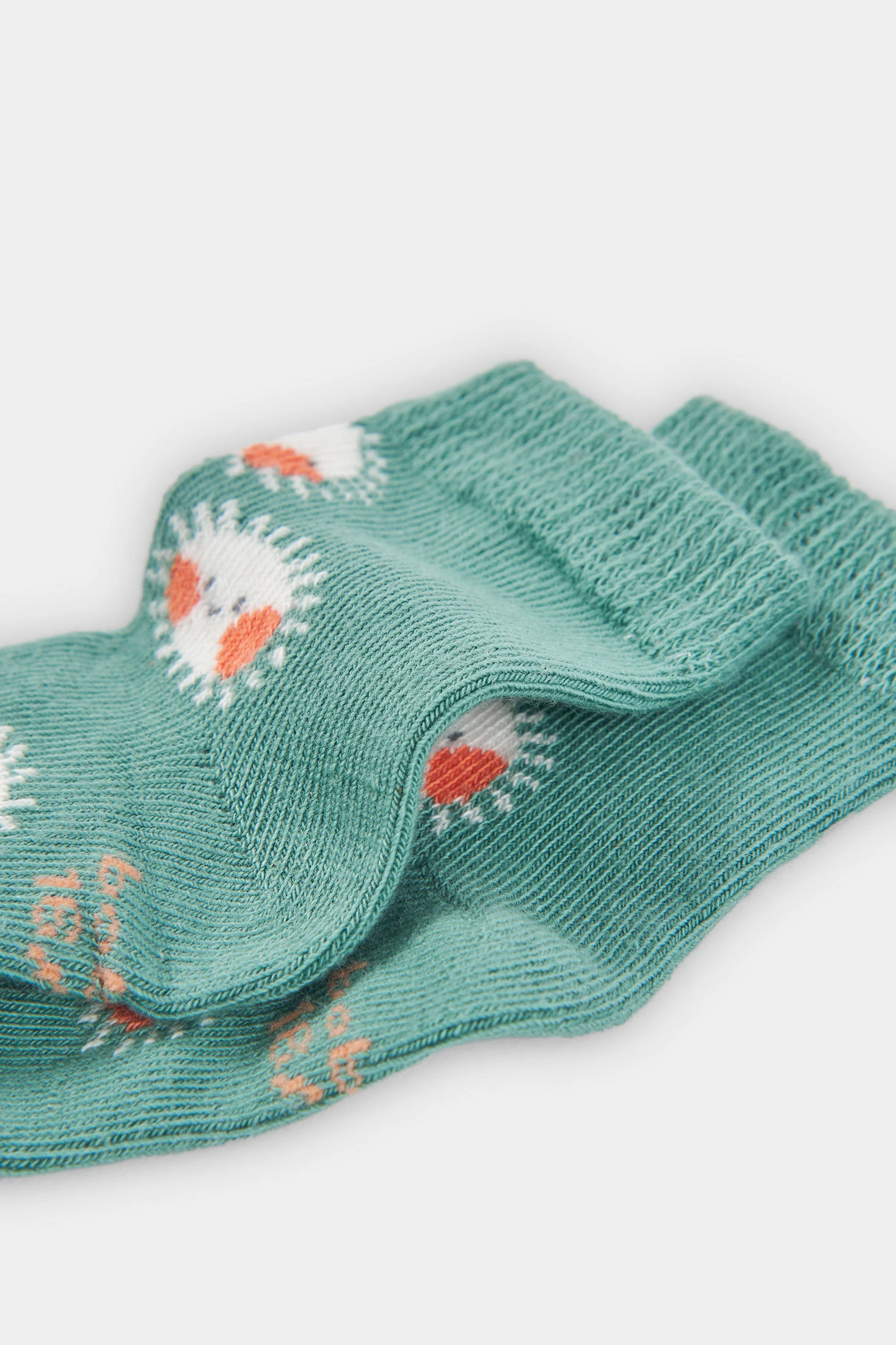 Pack aus Baumwollsocken, ideal für Neugeborene. Mit einem lustigen Design mit Sonnen in Orangetönen und Türkisgrün sind diese Socken weich und bequem für die Kleinsten. Erhältlich in den Größen: 16/18, 19/21 und 22/24. Sie sind eine praktische und entzückende Option, um die Füße Ihres Babys das ganze Jahr über warm und geschützt zu halten.