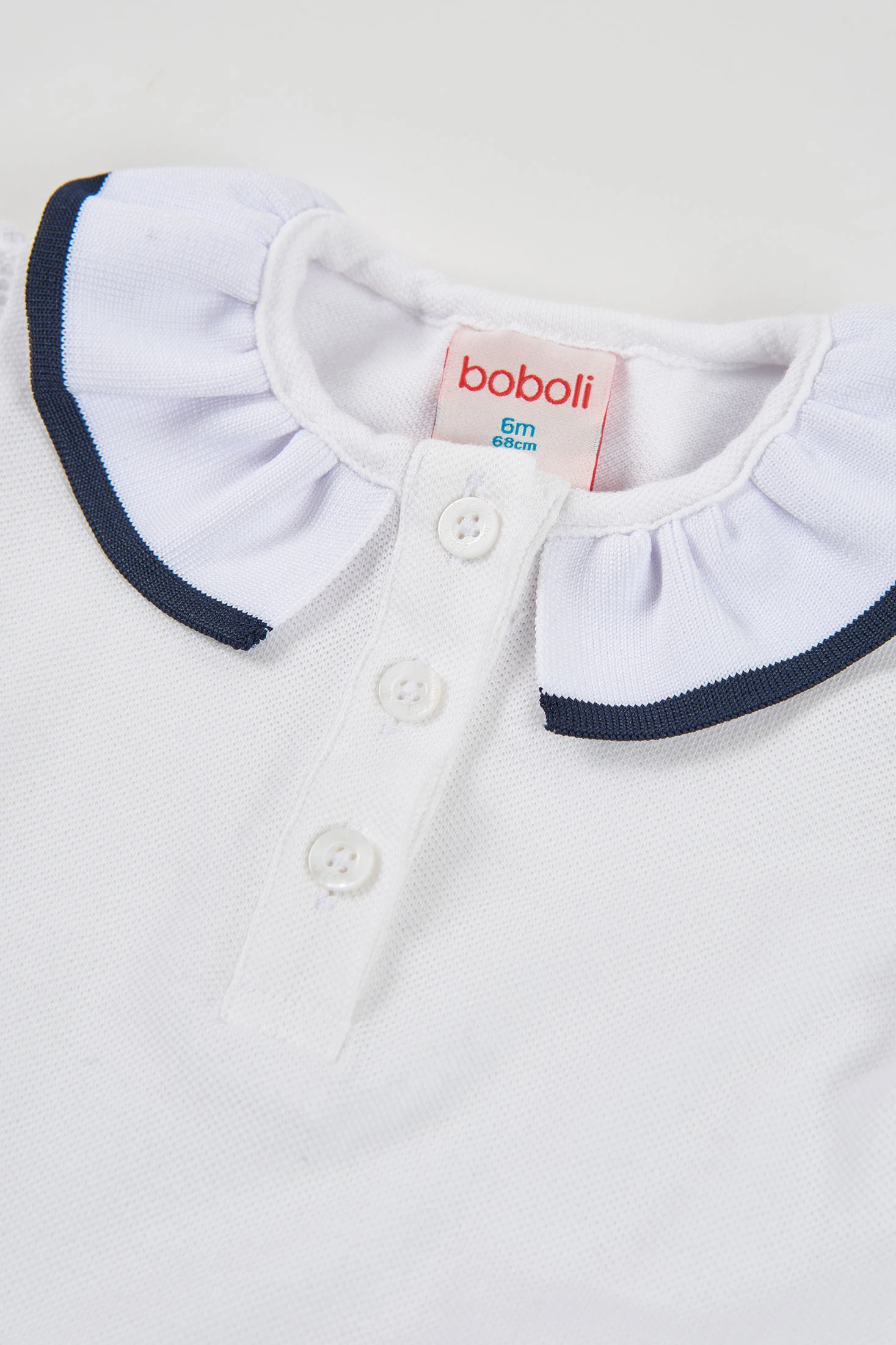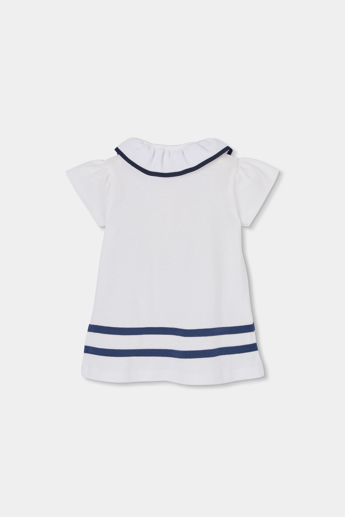Weißes Kleid für Baby Mädchen, ideal für besondere Anlässe. Hergestellt aus Piqué, einem weichen und bequemen Material, präsentiert es sich mit einem eleganten Design mit kurzen Ärmeln und einem Kragen mit Volants, der mit marinen Paspeln verziert ist. Der Knopfverschluss an der Vorderseite fügt einen klassischen Touch hinzu. Die Streifen am unteren Teil bieten einen eleganten Kontrast. Es ist in Größen von 1 Monat bis 2 Jahren erhältlich. Eine bezaubernde und vielseitige Wahl, die Stil und Komfort vereint, perfekt für formelle Anlässe.
