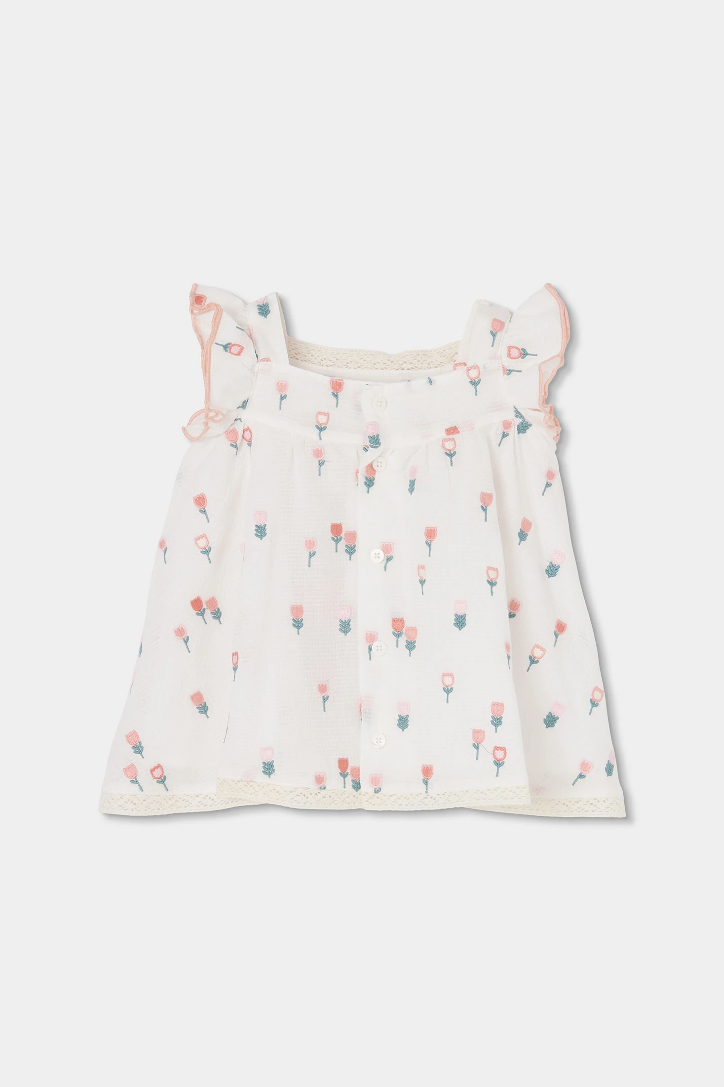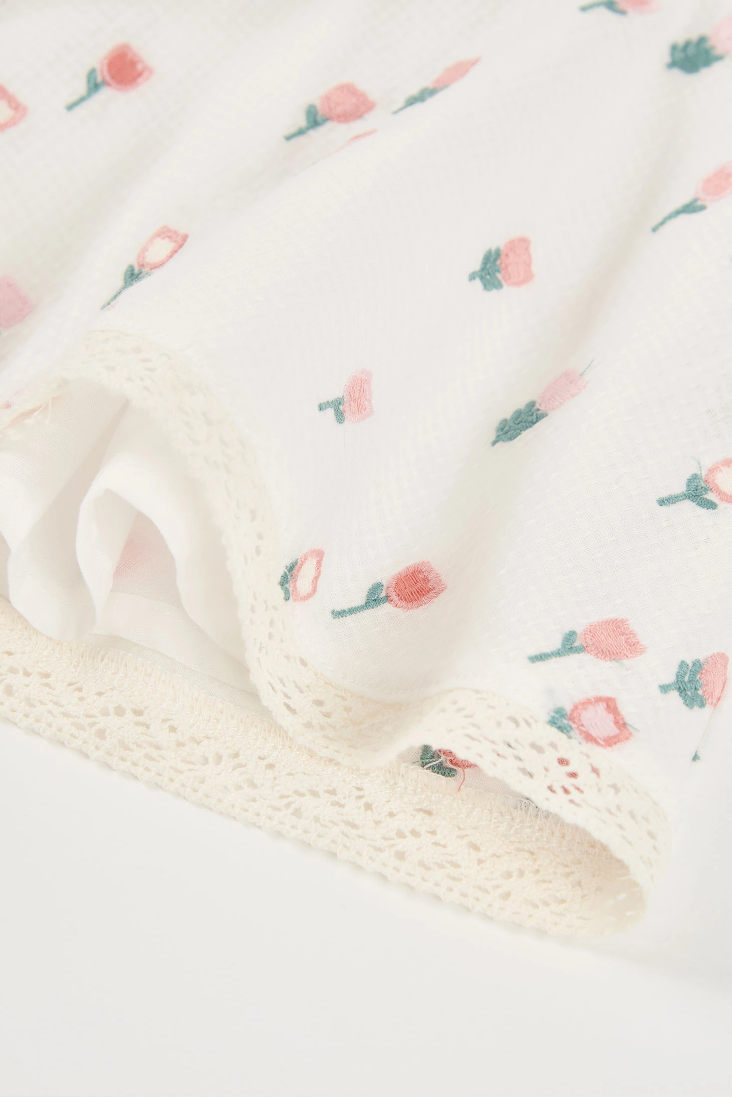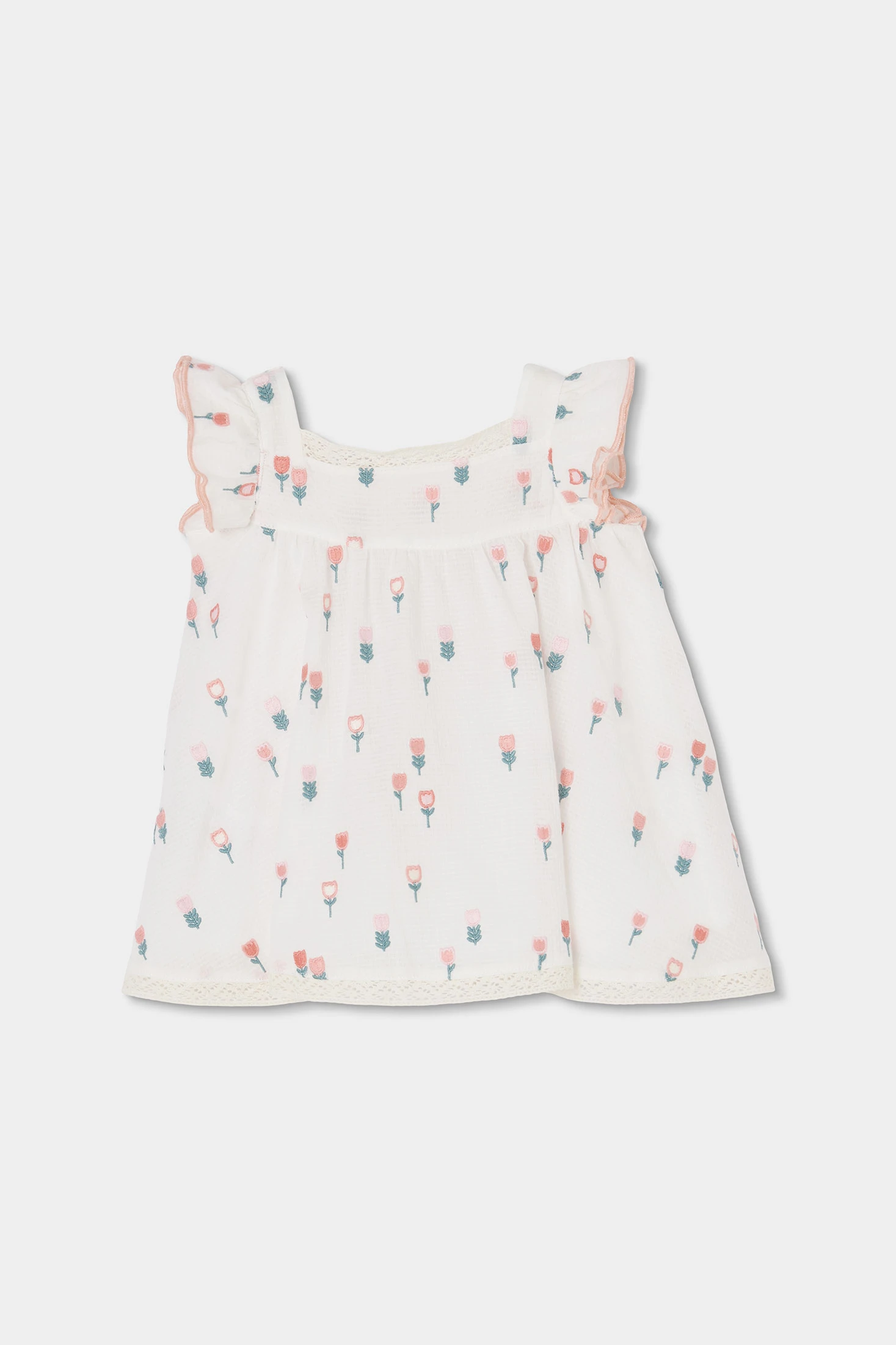 Weißes Fantasiekleid ideal für Babys, mit einem zarten und bezaubernden Design. Es zeigt ein Muster kleiner Zeichnungen mit Blumenformen in sanften Farbtönen. Hergestellt aus weichem Material, bietet es Komfort und Stil. Perfekt für besondere Anlässe oder für den Alltag. Erhältlich in Größen von 1 Monat bis 2 Jahre, passt es sich dem Wachstum Ihres Babys an. Rüschen an den Schultern verleihen ihm einen Hauch von Eleganz und Unterscheidung.