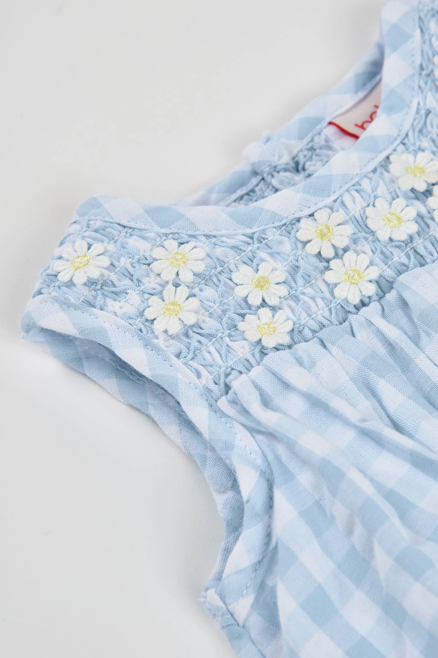 Popeline-Kleid für Babys mit einem Karomuster in sanftem Blau und floralen Stickdetails auf der Brust. Ideal für warme Klimazonen dank des leichten und kühlen Materials. Erhältlich in Größen von 1 Monat bis 2 Jahren, passt es sich perfekt dem Wachstum der Kleinen an. Ärmellos und mit lockerer Passform bietet es Komfort und Bewegungsfreiheit. Perfekt für besondere Anlässe oder Outdoor-Ausflüge und verleiht der Garderobe Ihres Babys einen Hauch von Frische und Charme.