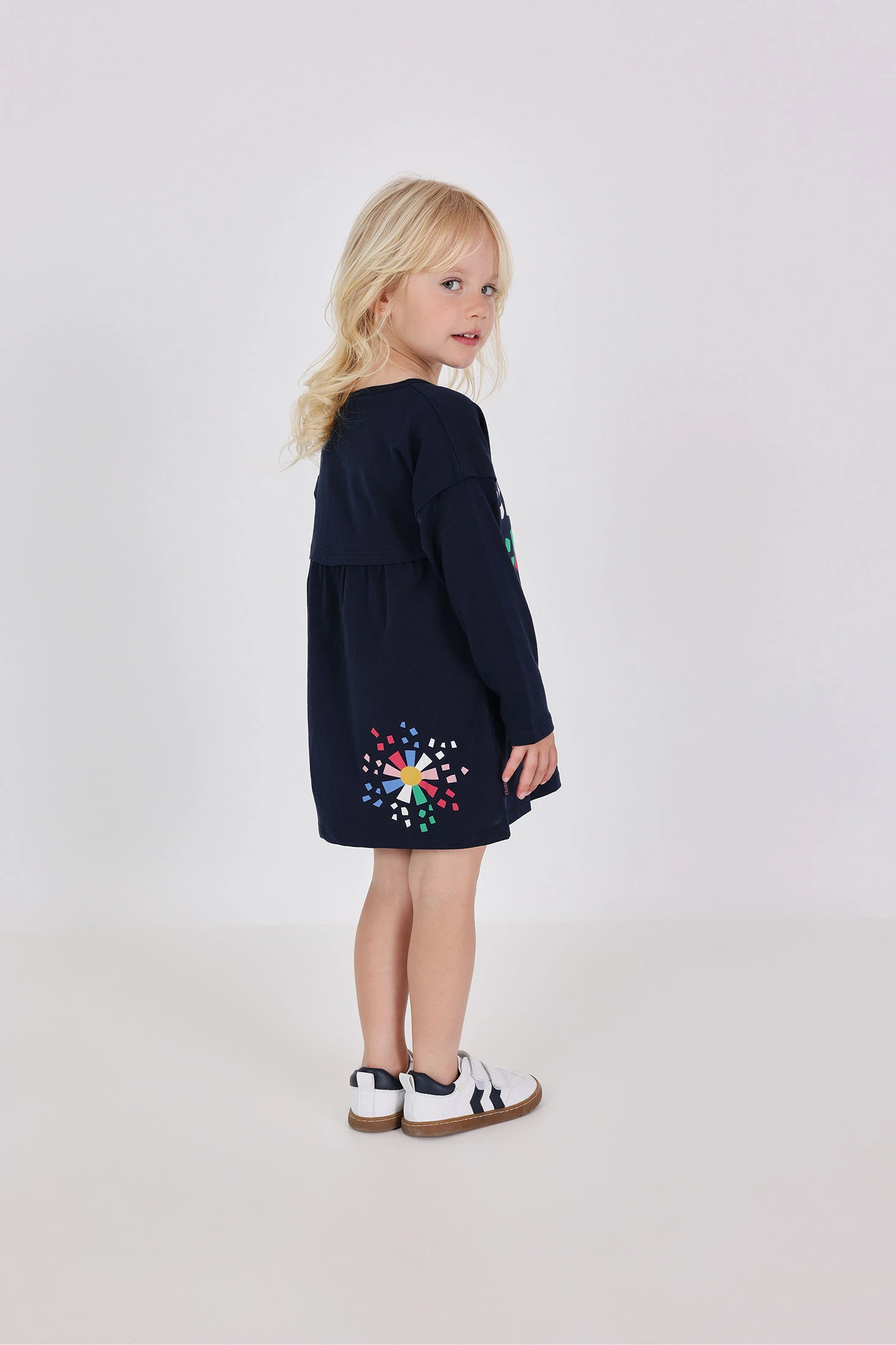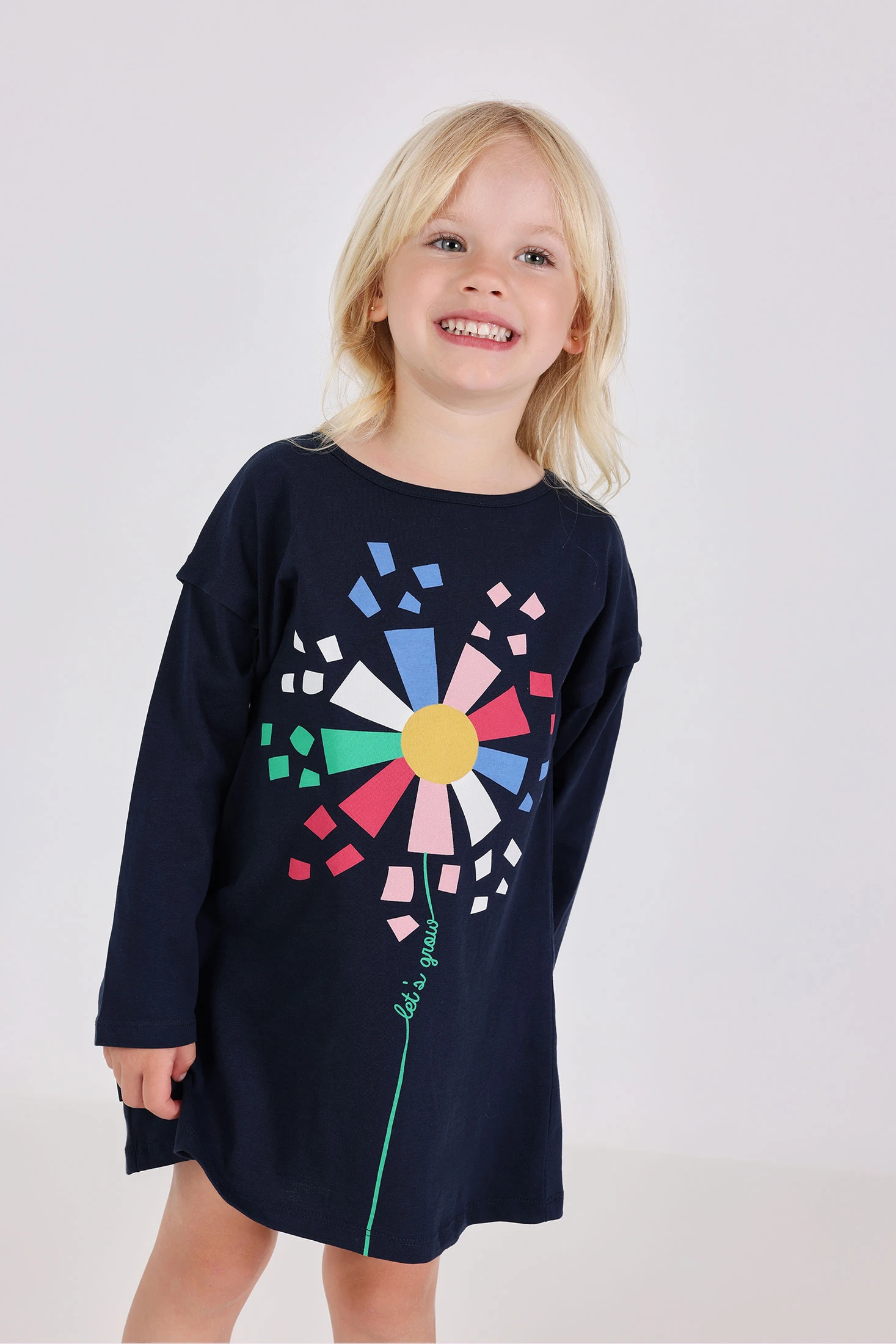 Marineblaues Strickkleid mit Blumen, perfekt für die Kleinen in der Herbstsaison. Aus weicher Baumwolle gefertigt, sorgt es für Komfort und Frische. Sein Blumenmuster in lebhaften Farben wie Rosa, Blau und Grün verleiht eine fröhliche und lustige Note. Das Design verfügt über einen Rundhalsausschnitt und kurze Ärmel, ideal für die wärmeren Tage. Erhältlich in Größen von 12 Monaten bis 10 Jahren, ist es vielseitig für den Alltag und lässt sich leicht mit leichten Jacken kombinieren.