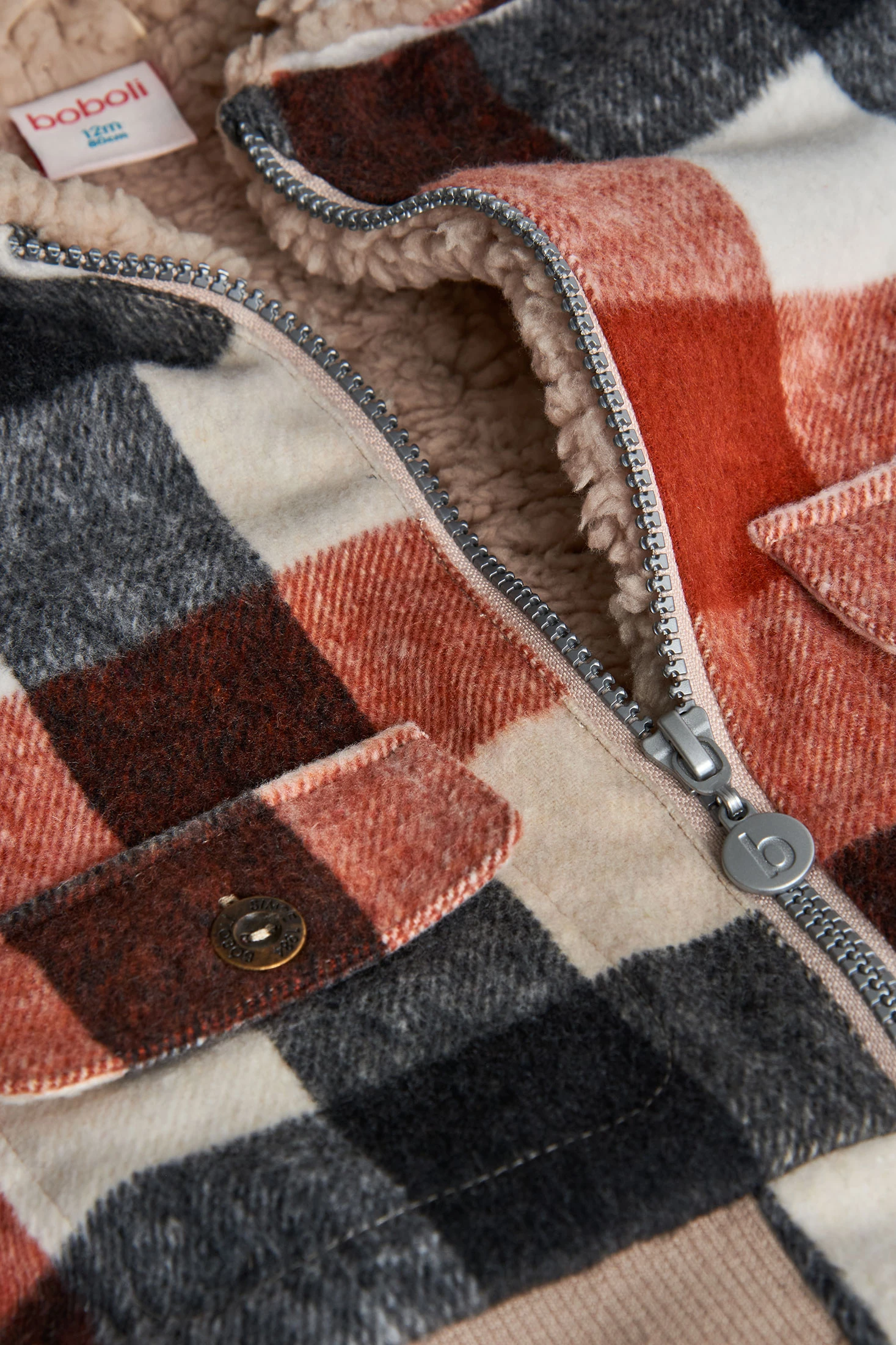 Strickjacke für Jungen mit Karomuster, ideal für die Herbst- und Wintermonate. Hergestellt aus warmen und weichen Materialien, zeigt sie ein klassisches Muster in Braun-, Schwarz- und Weißtönen, das Stil und Komfort garantiert. Der Teddykragen verleiht einen gemütlichen und raffinierten Touch, während der Reißverschluss die Handhabung erleichtert. Mit langen Ärmeln gestaltet, bietet sie effektiven Schutz vor Kälte. Erhältlich in den Größen von 12 Monaten bis 10 Jahren, ist diese Jacke ein vielseitiges Kleidungsstück, das sich leicht mit Jeans oder Freizeithosen kombinieren lässt.