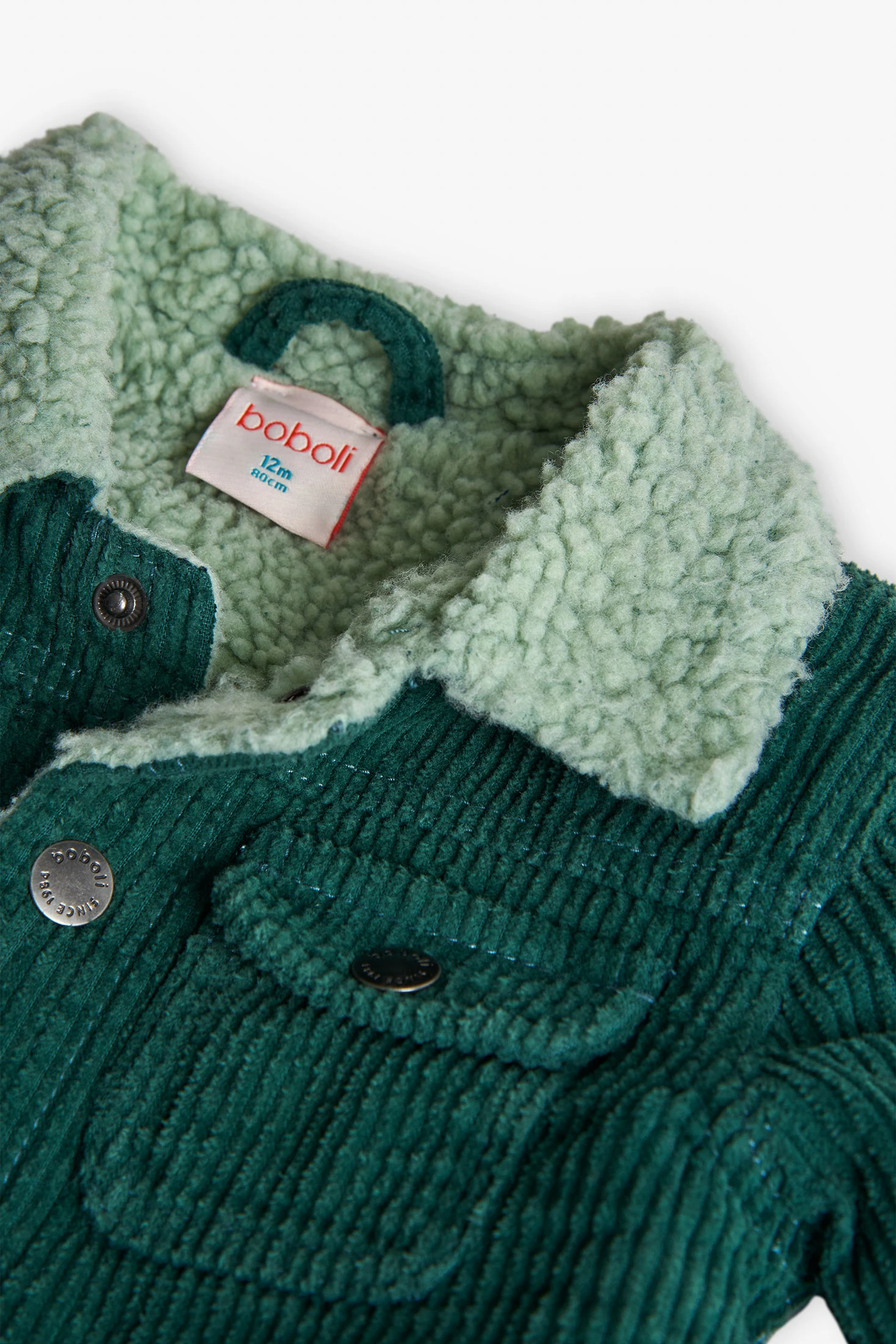 Grüne Cordjacke für Jungen, ideal für kalte Herbst- und Wintertage, dank ihres warmen Schaffellfutters am Kragen. Mit einem Knopfverschluss bietet sie einen klassischen und praktischen Touch für den täglichen Gebrauch, während ihre zwei Vordertaschen Funktionalität hinzufügen. Sie ist in Größen von 12 Monaten bis 10 Jahren erhältlich, um sicherzustellen, dass dein Kleiner sich in verschiedenen Wetterbedingungen warm und bequem fühlt. Ihr vielseitiges und elegantes Design erleichtert die Kombination mit einer Vielzahl von Outfits und macht sie zu einem unverzichtbaren Bestandteil der Kinderkleidung.