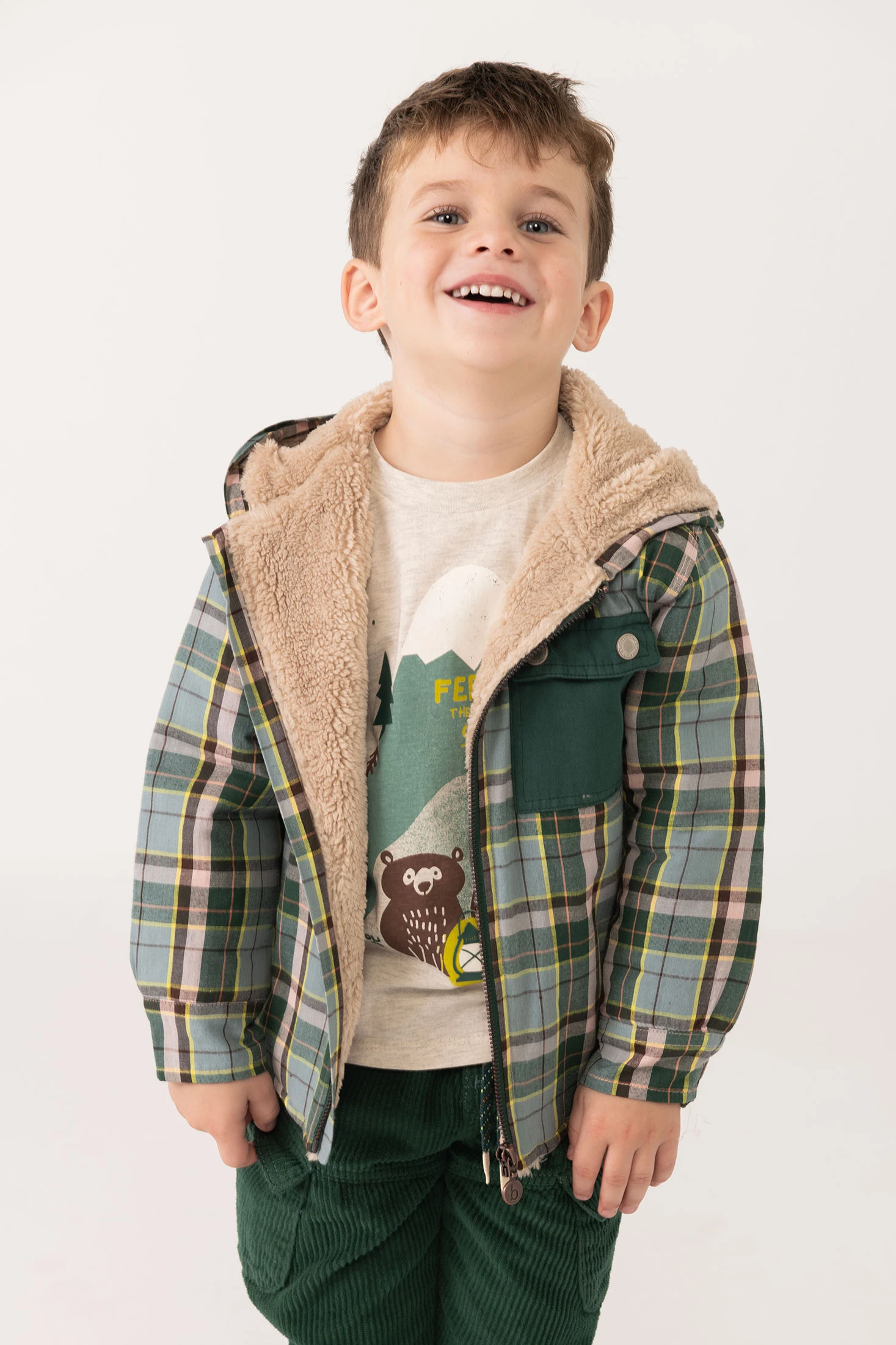 Hemdjacke für Kinder mit grünen und blauen Karos, ideal für die Übergangszeit, vereint Stil und Komfort in einem einzigen Kleidungsstück. Aus einem weichen Strickstoff gefertigt, garantiert sie ein angenehmes Gefühl auf der Haut Ihres Babys. Das moderne Karomuster macht sie leicht kombinierbar, perfekt als zusätzliche Schicht über T-Shirts oder Bodys und geeignet für verschiedene Anlässe. Erhältlich in Größen von 12 Monaten bis 10 Jahren passt sie zu jedem Outfit Ihres Kleinen. Die Knöpfe an der Vorderseite sorgen für einen praktischen Verschluss, der das Umziehen erleichtert. Diese Hemdjacke ist eine stilvolle und funktionale Ergänzung zur Gard