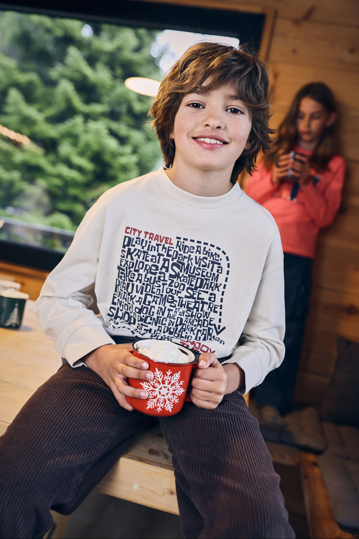 Langarmshirt für Jungen aus weicher beigefarbener Baumwolle mit einem eleganten Farbverlaufdesign, das Stil und Komfort bietet. Ein moderner Textdruck verleiht einen jugendlichen Touch, ideal für die Herbst- und Wintersaison. Der Rundhalsausschnitt erleichtert die Kombination mit anderen lässigen Outfits und schafft urbane und vielseitige Looks. Erhältlich in den Größen 2 bis 14 Jahre, perfekt für Kinder, die Komfort suchen, ohne auf Stil zu verzichten.