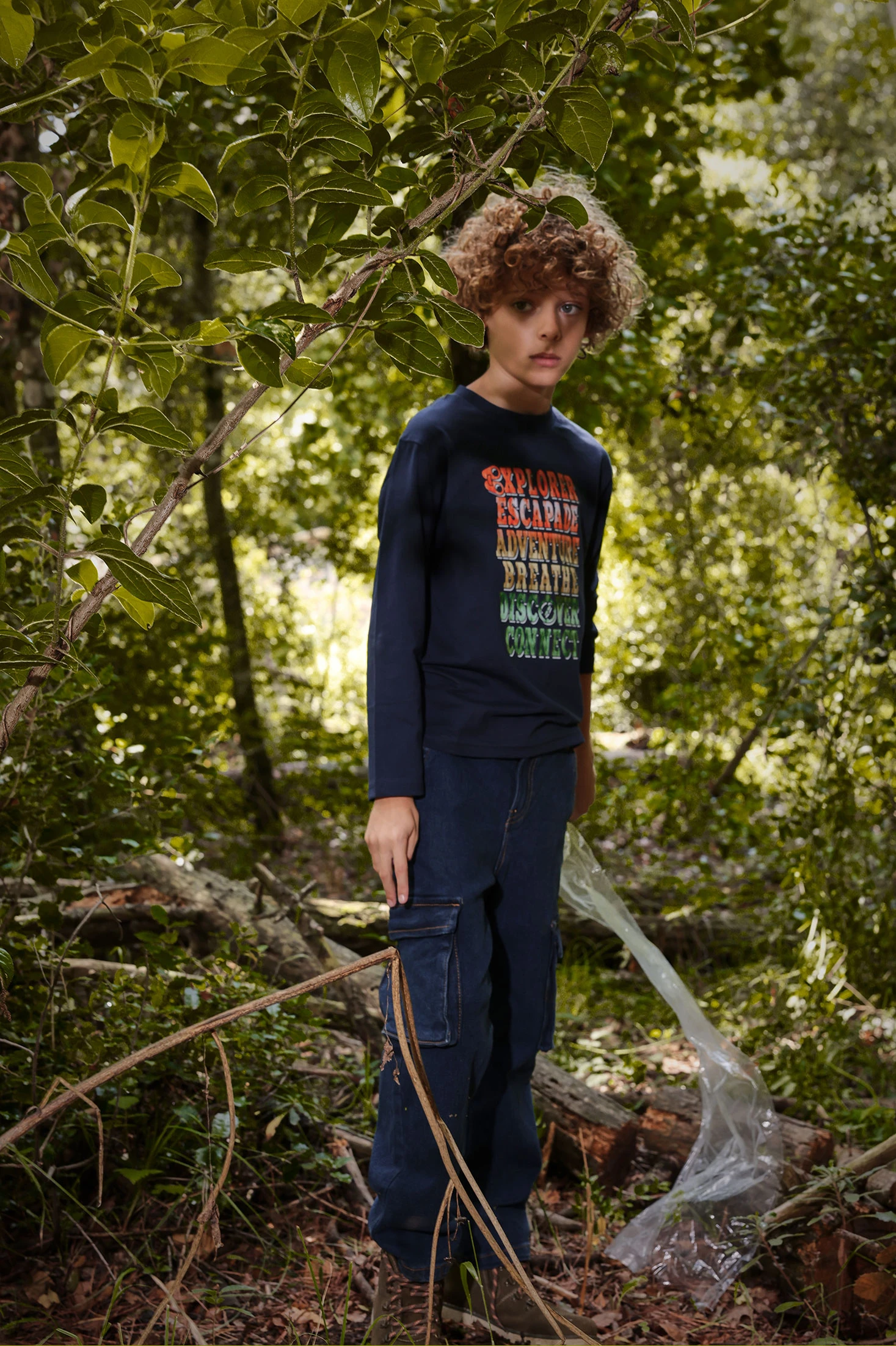 Kinder-T-Shirt in Marineblau, ideal für Herbst und Winter dank seines Gewebes, das Komfort und Flexibilität bietet. Modernes Design mit einem inspirierenden Wortdruck, der Aufmerksamkeit erregt. Es hat einen Rundhalsausschnitt und lange Ärmel, geeignet für kalte Tage. Erhältlich in Größen von 2 bis 14 Jahren, ist es ein vielseitiges Kleidungsstück, das sich leicht mit Jeans oder Jogginghosen kombinieren lässt, perfekt für kleine Abenteurer.