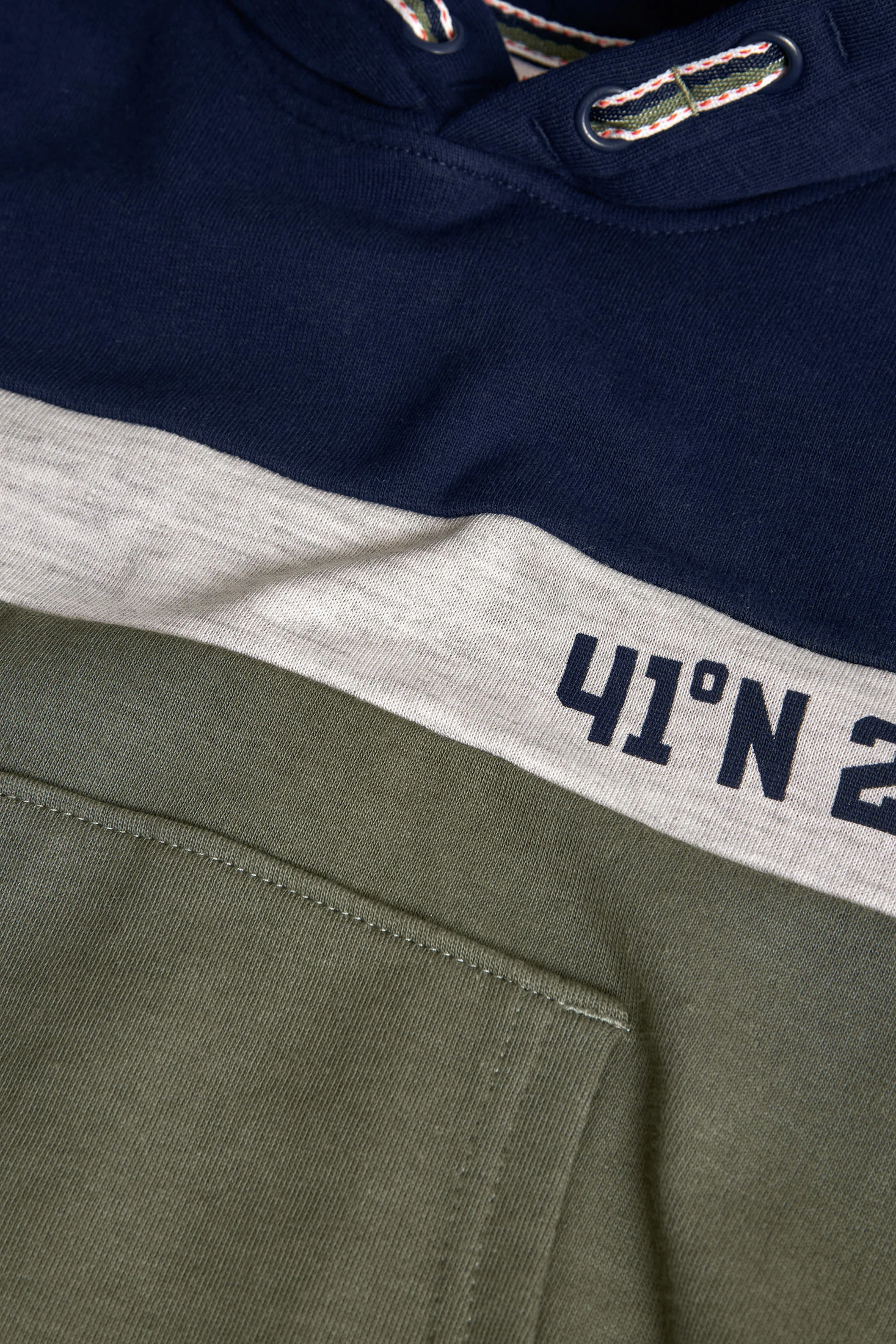 Fleece-Sweatshirt für Jungen in Grün kombiniert mit Marineblau, ausgestattet mit verstellbarer Kapuze, ideal für Herbst- und Wintersaisonen. Hergestellt aus weichem und kuscheligem Fleece-Material, bietet es täglichen Komfort und Wärme. Enthält eine praktische Kängurutasche, perfekt, um die Hände warmzuhalten oder kleine wichtige Gegenstände zu verstauen. Erhältlich in Größen von 2 bis 14 Jahren, lässt es sich leicht mit Jeans oder Sporthosen für einen lässigen und modernen Stil kombinieren.