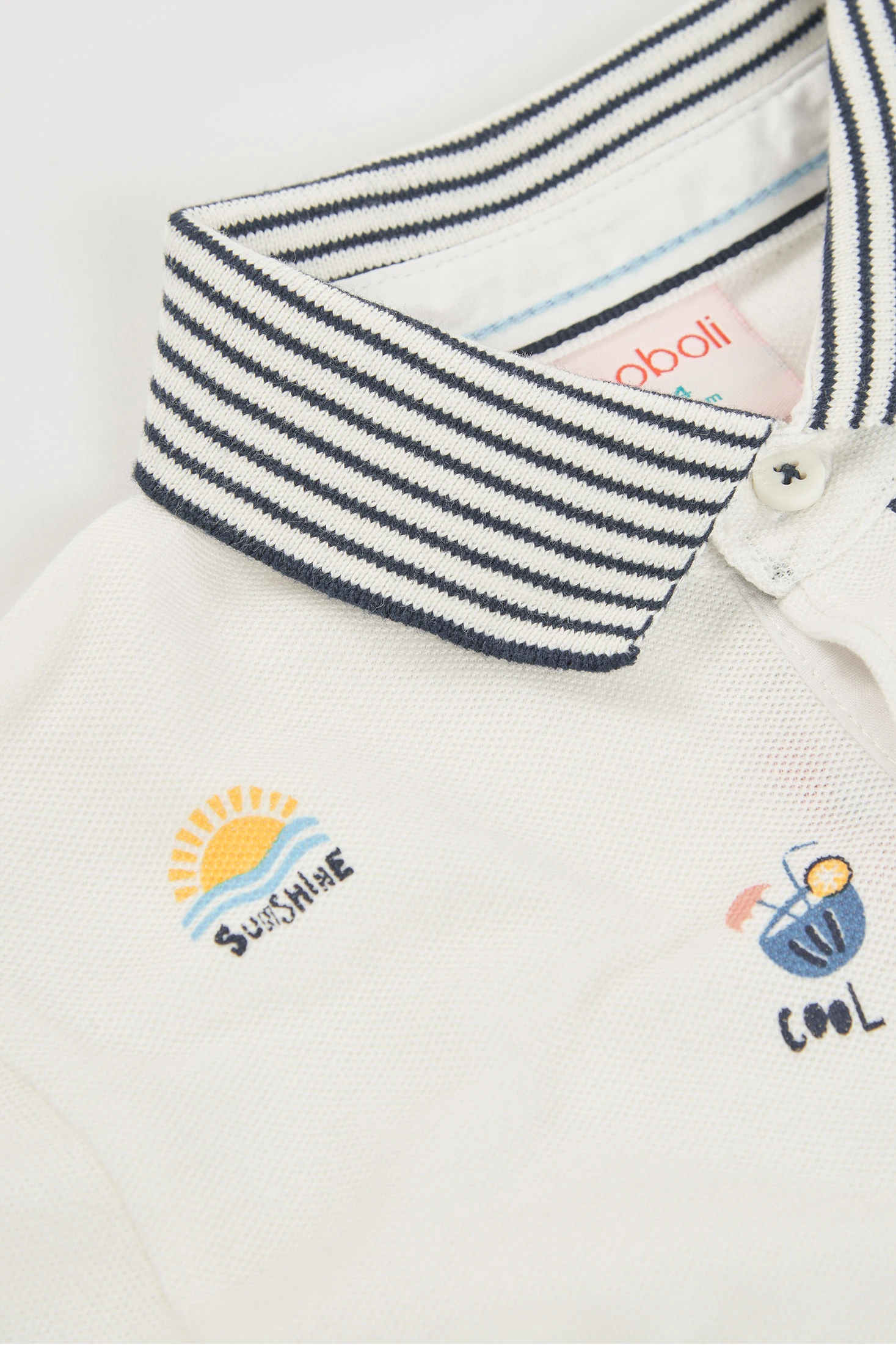 Piqué-Polo für Kinder, ideal für die Frühlings-Sommer-Saison, präsentiert sich in klassischem Weiß. Verziert mit kleinen Drucken, die nautische und sonnige Elemente beinhalten, verleiht es dem Outfit einen Hauch von Spaß. Kragen und Ärmel sind mit einem Streifenmuster versehen und bieten ein elegantes Finish. Erhältlich in Größen von 12 Monaten bis 10 Jahren. Perfekt kombinierbar mit kurzen Hosen oder Jeans, ist dieses Polo eine vielseitige und bequeme Wahl für den Alltag. Hergestellt aus Baumwolle garantiert es Frische und Sanftheit im Hautkontakt.