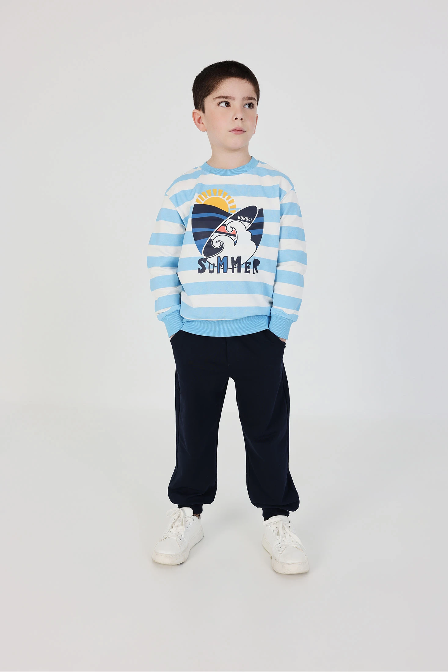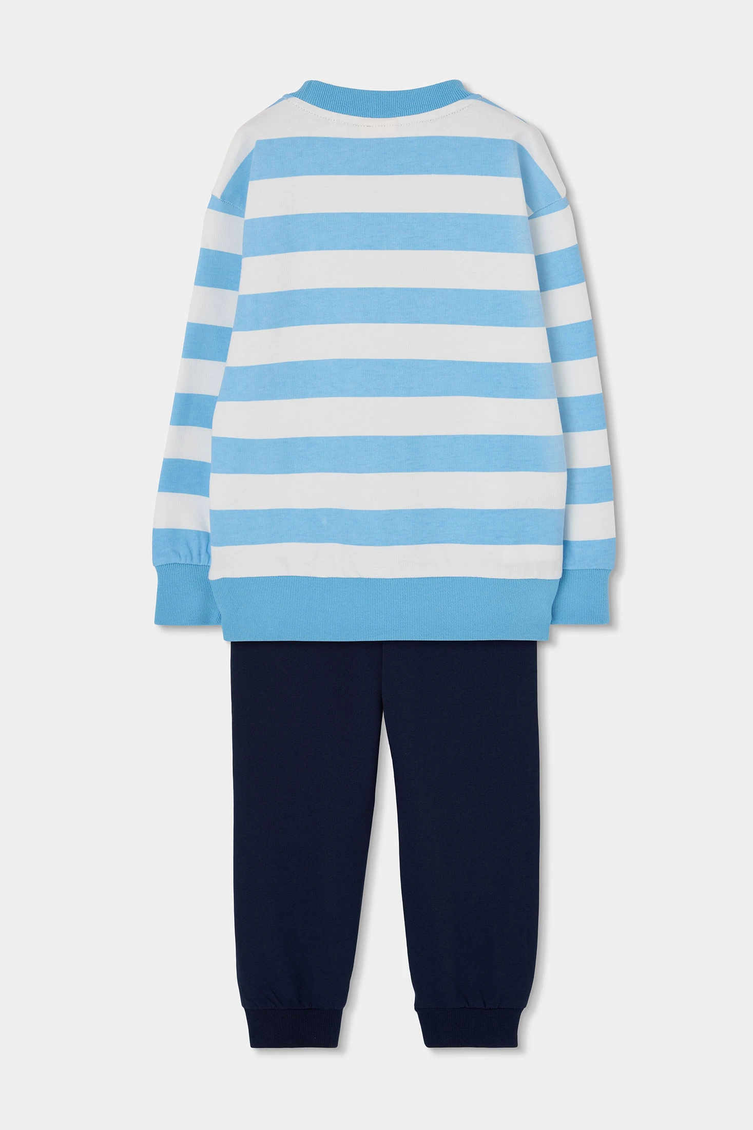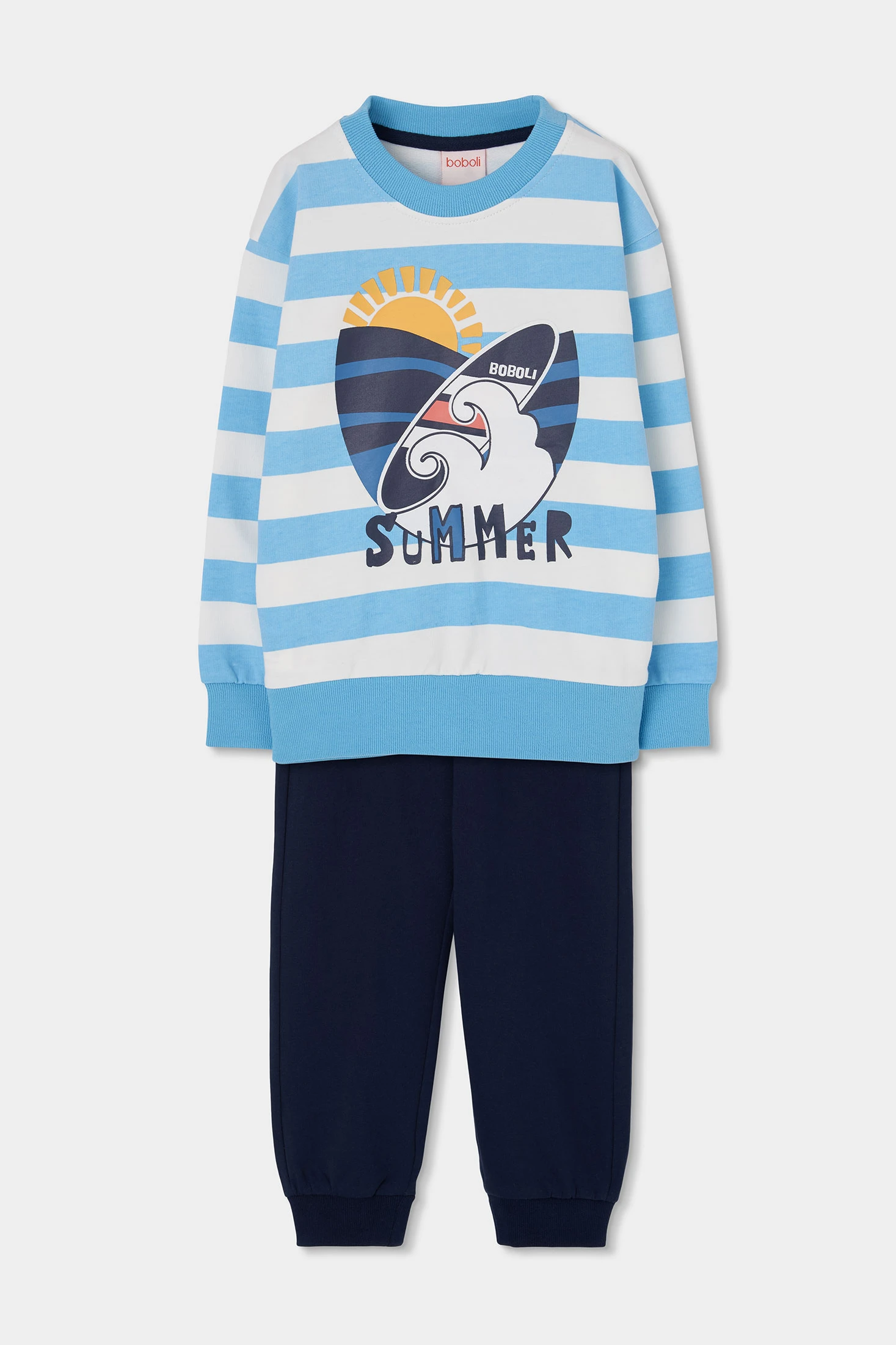 Set aus marineblauem Sweatshirt und Hose. Das Sweatshirt hat Streifen in Blau- und Weißtönen mit einem sommerlichen Aufdruck von Sonne und Wellen, die eine lustige Note hinzufügen. Die Hose ist dunkelblau mit einem elastischen Bund und einem verstellbaren Kordelzug. Hergestellt aus bequemem und warmem Strickmaterial, ideal für den täglichen Gebrauch. Erhältlich in Größen von 12 Monaten bis 10 Jahren, vereint es Stil und Komfort. Perfekt für einen lässigen und modernen Look.