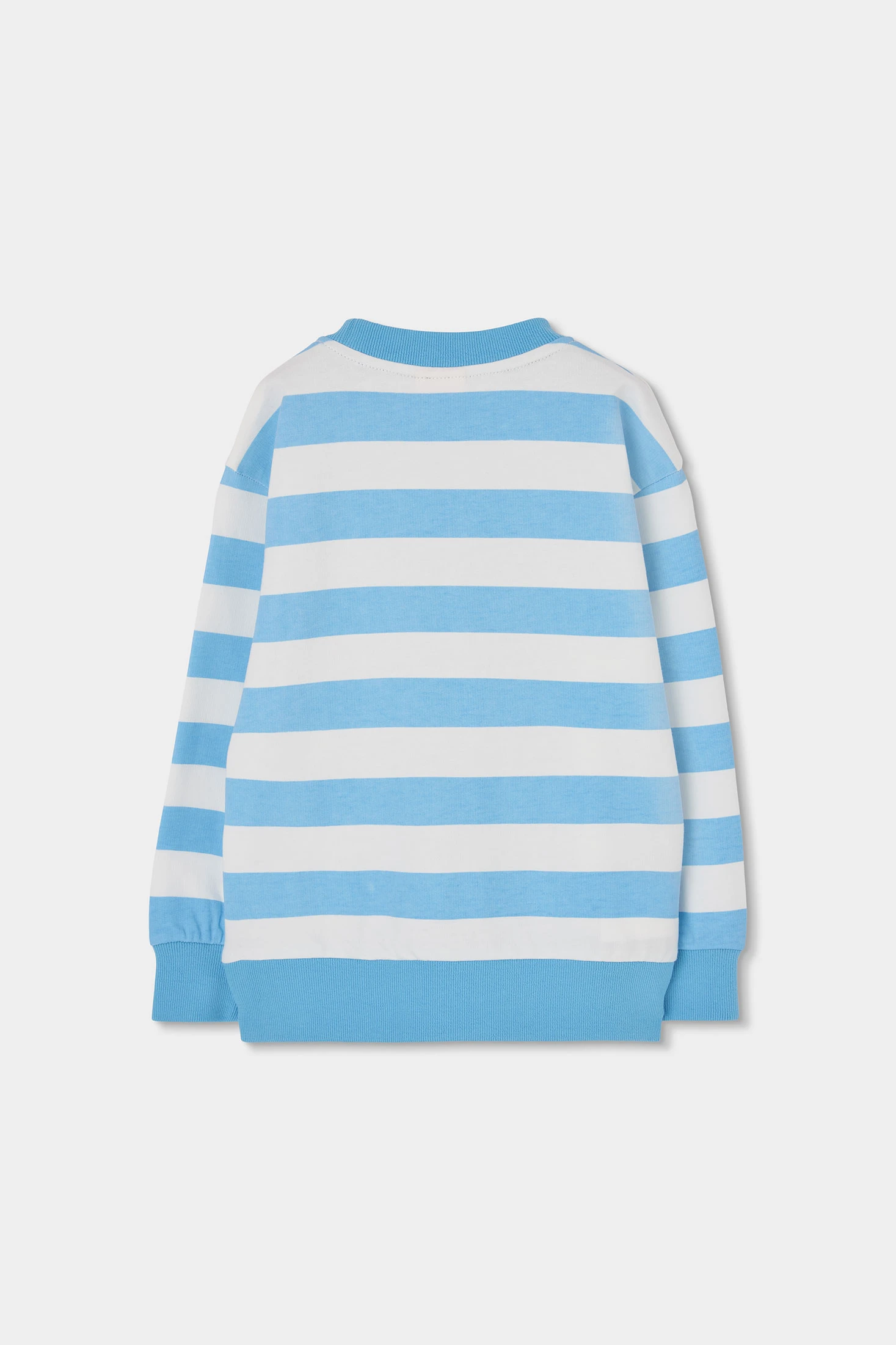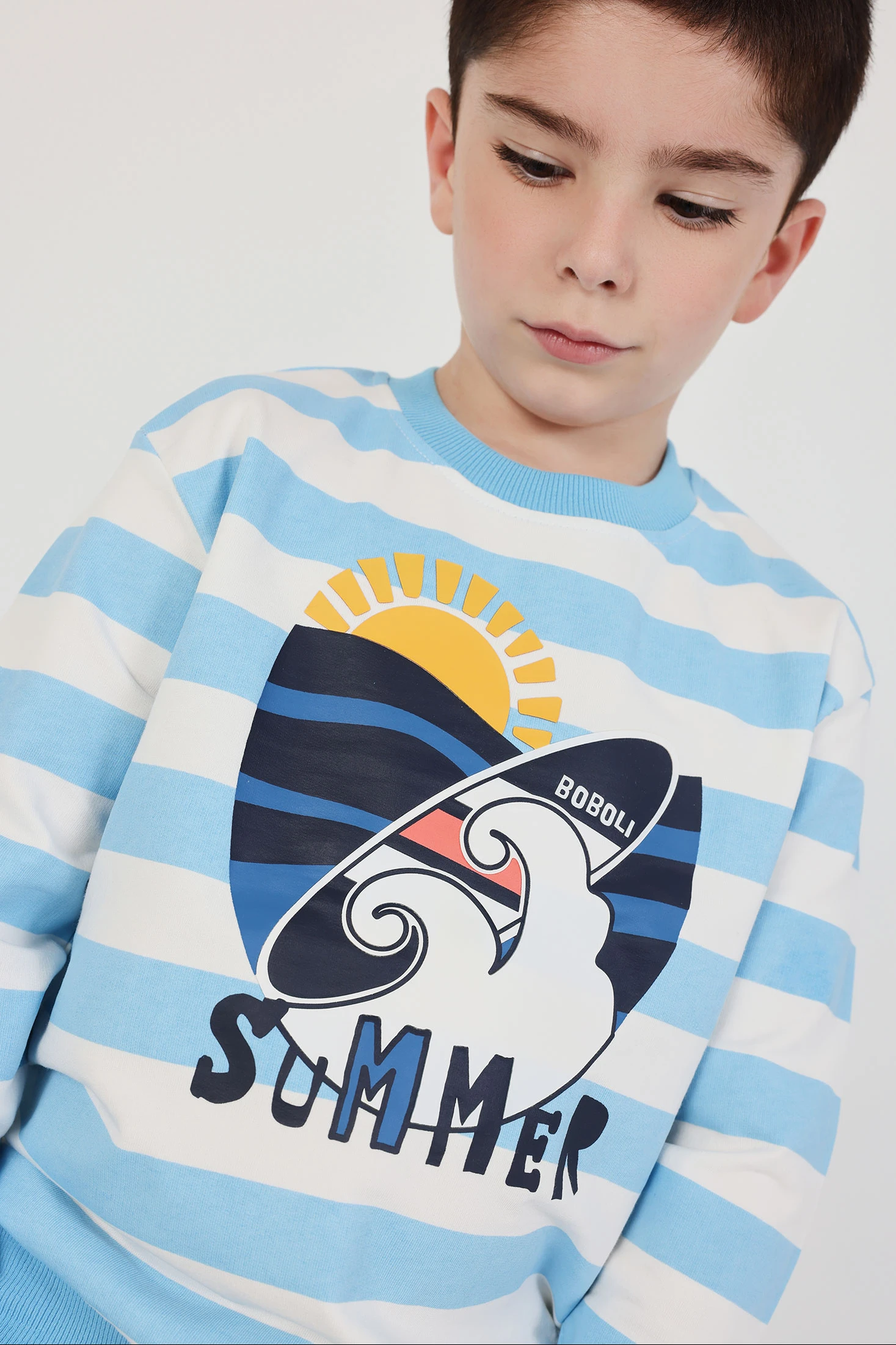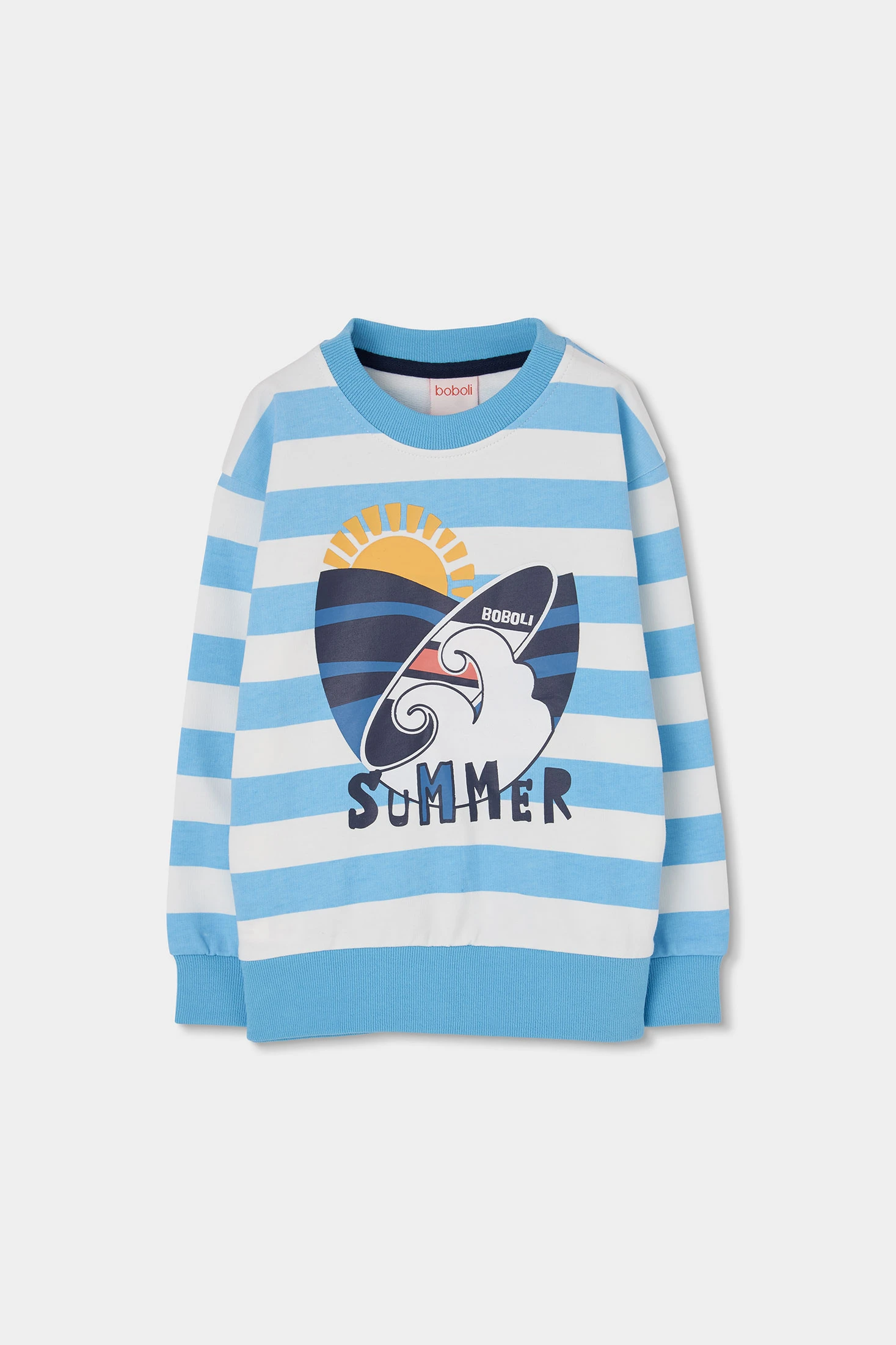 Set aus marineblauem Sweatshirt und Hose. Das Sweatshirt hat Streifen in Blau- und Weißtönen mit einem sommerlichen Aufdruck von Sonne und Wellen, die eine lustige Note hinzufügen. Die Hose ist dunkelblau mit einem elastischen Bund und einem verstellbaren Kordelzug. Hergestellt aus bequemem und warmem Strickmaterial, ideal für den täglichen Gebrauch. Erhältlich in Größen von 12 Monaten bis 10 Jahren, vereint es Stil und Komfort. Perfekt für einen lässigen und modernen Look.