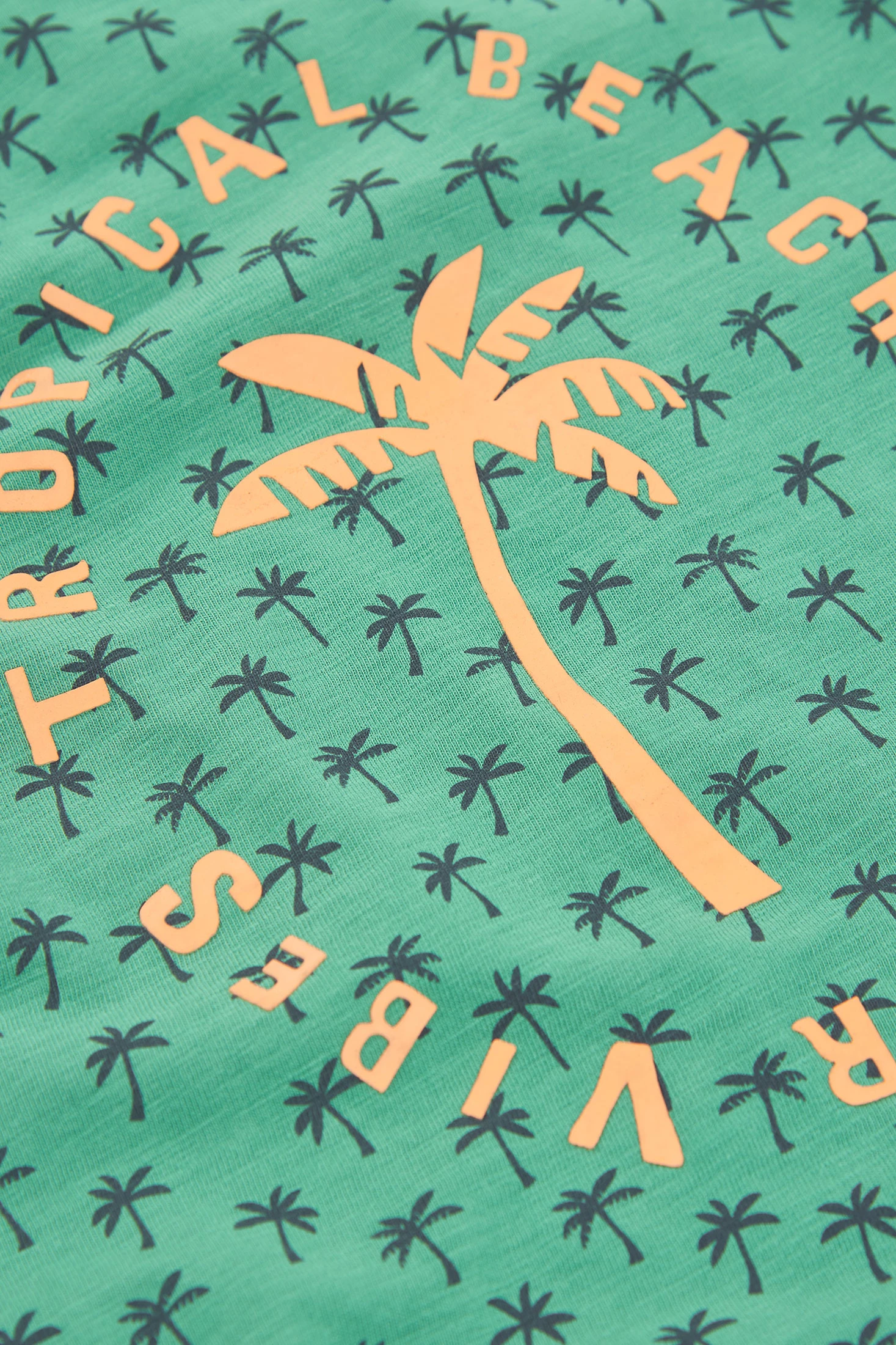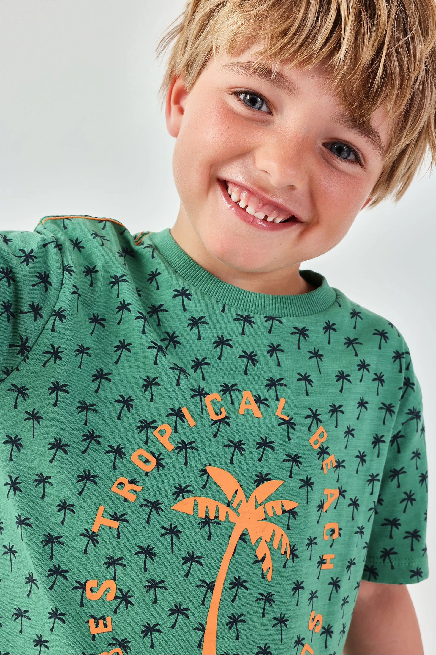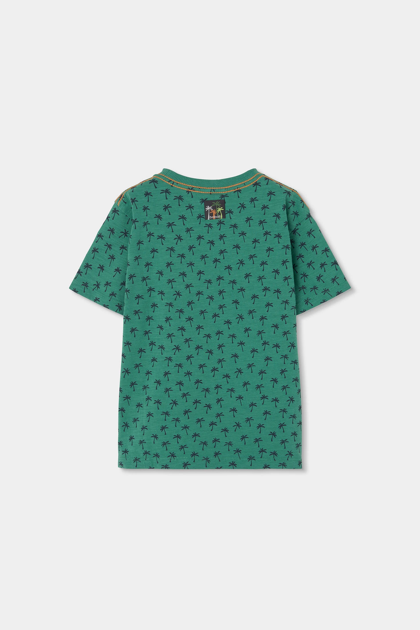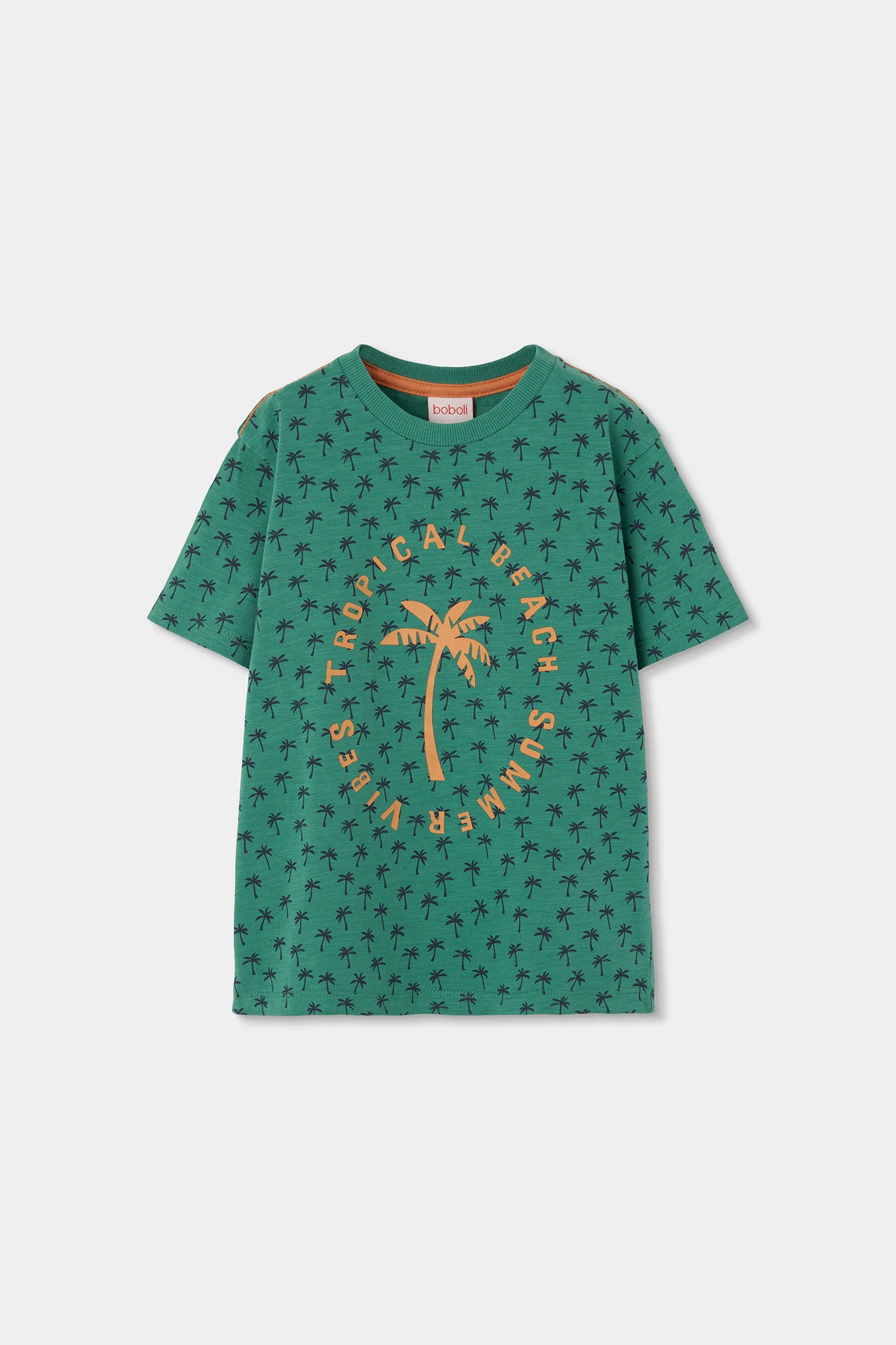 Bedrucktes Baumwollshirt für Jungen, ideal für den Sommer. In Grün mit einem Palmenprint in Anthrazitgrau, das ein tropisches Design in der Mitte mit orangem Text aufweist. Sein Baumwollgewebe sorgt für Komfort und Frische im Alltag. Die kurzen Ärmel machen es perfekt für warme Klimazonen. Erhältlich in Größen von 12 Monaten bis 10 Jahren, ist es eine vielseitige Option, die sich leicht mit Shorts oder legeren Hosen für einen sommerlichen und entspannten Look kombinieren lässt.