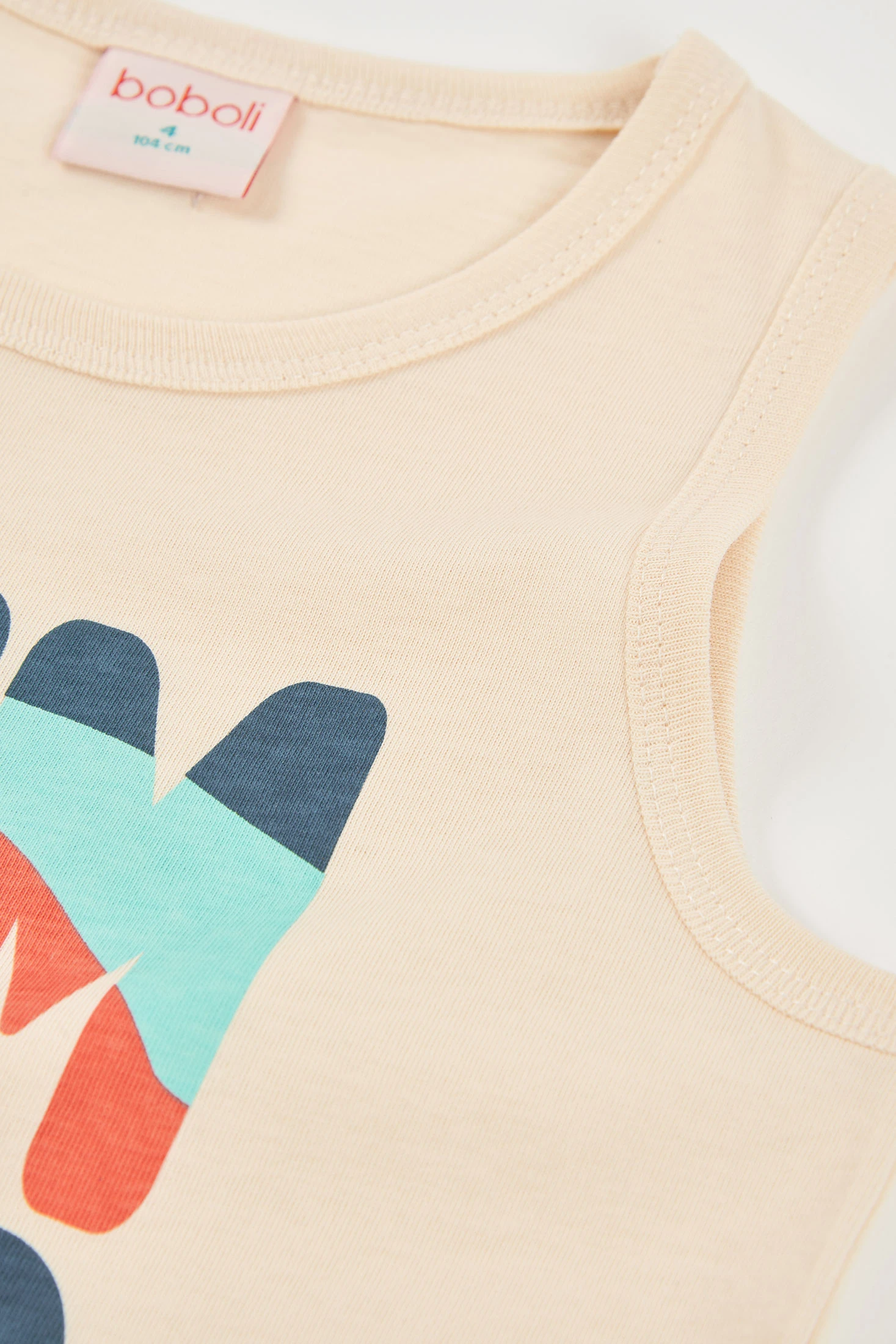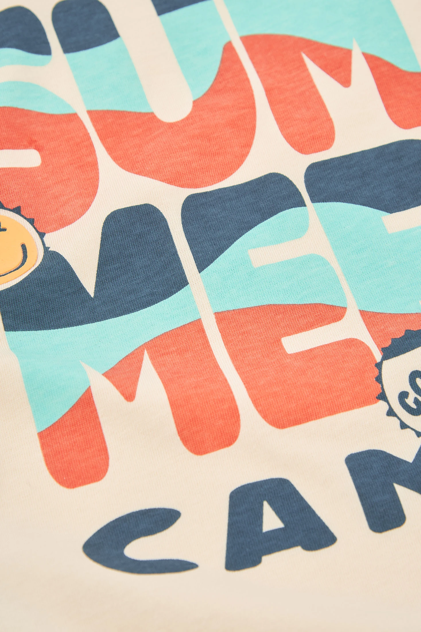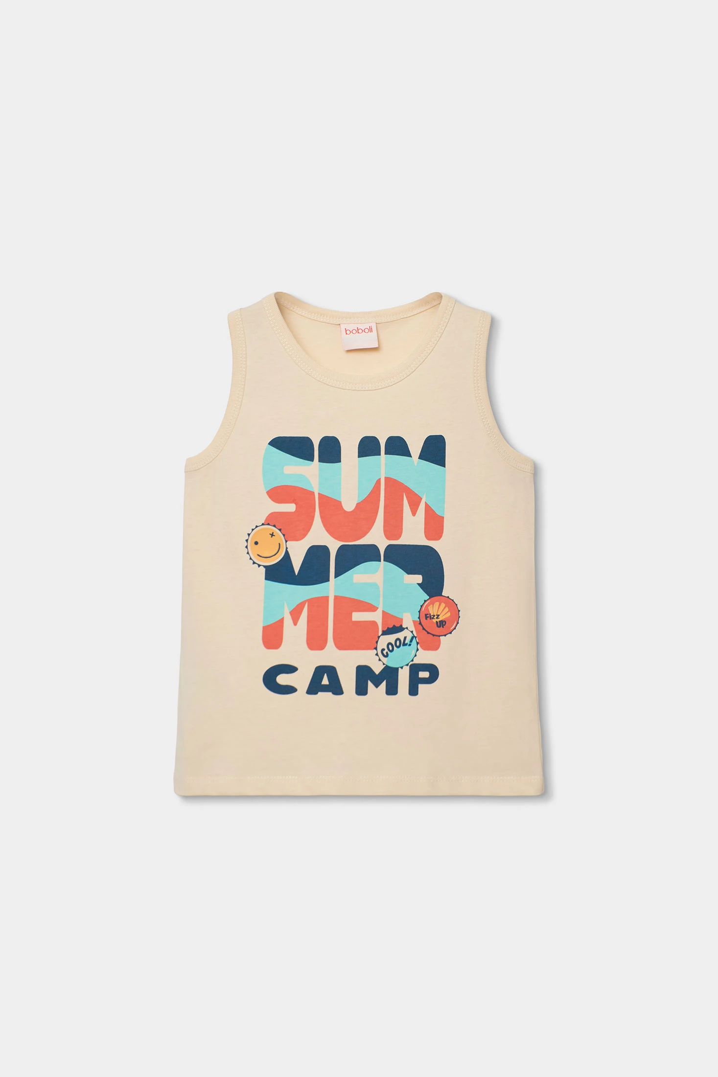 Rohes Strick-T-Shirt für Jungen, perfekt für Frühling und Sommer. Hergestellt aus einem weichen Stoff, bietet es großen Komfort für den Alltag. Es hat ein Design mit dem Aufdruck "Summer Camp" in lebendigen Farben und lustigen Mustern. Verfügbar in Größen von 12 Monaten bis 10 Jahren, ideal zum Kombinieren mit Shorts oder Jeans. Sein ärmelloser Schnitt macht es luftig und ermöglicht Bewegungsfreiheit, was es zu einem vielseitigen und stilvollen Kleidungsstück für die warmen Monate macht.