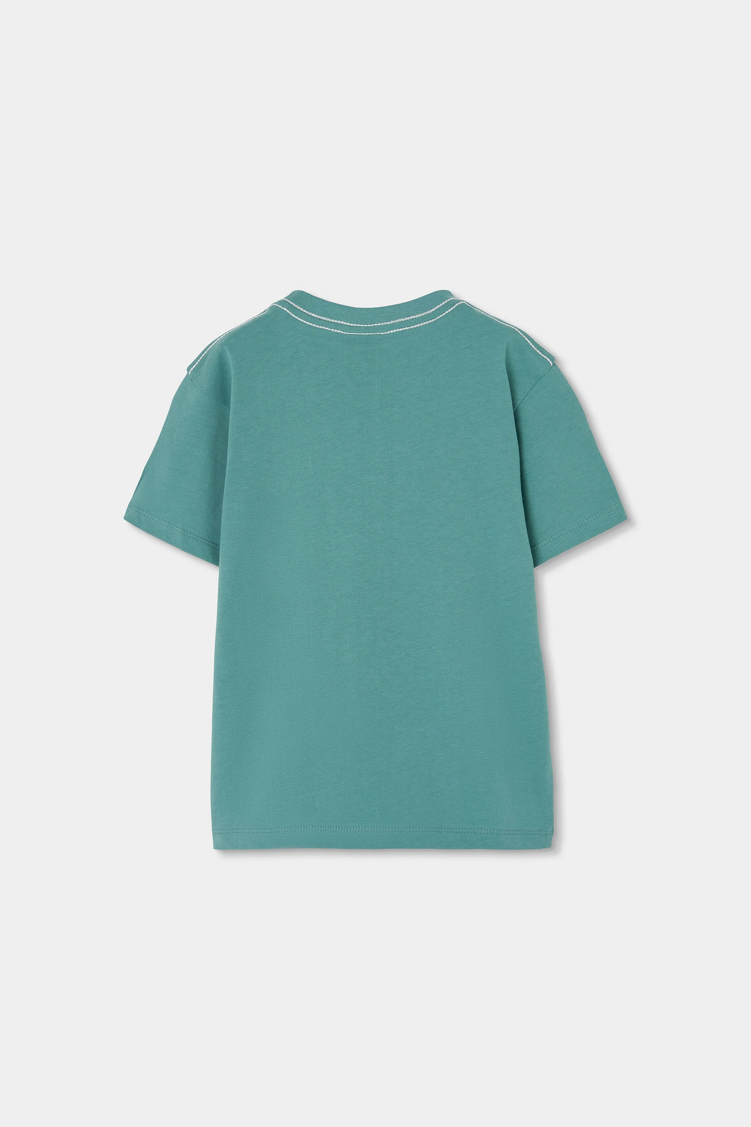 Grünes Baumwollstrick-T-Shirt, ideal für Kinder, das durch eine lustige Grafik, die eine Bauchtasche simuliert, hervorsticht und einen originellen Touch verleiht. Erhältlich in Größen von 12 Monaten bis 10 Jahren, deckt es eine breite Altersgruppe ab. Das weiche und leichte Material gewährleistet den ganzen Tag über Komfort. Perfekt für lässige Kombinationen ist dieses kurzärmelige T-Shirt für jede Outdoor-Aktivität geeignet.