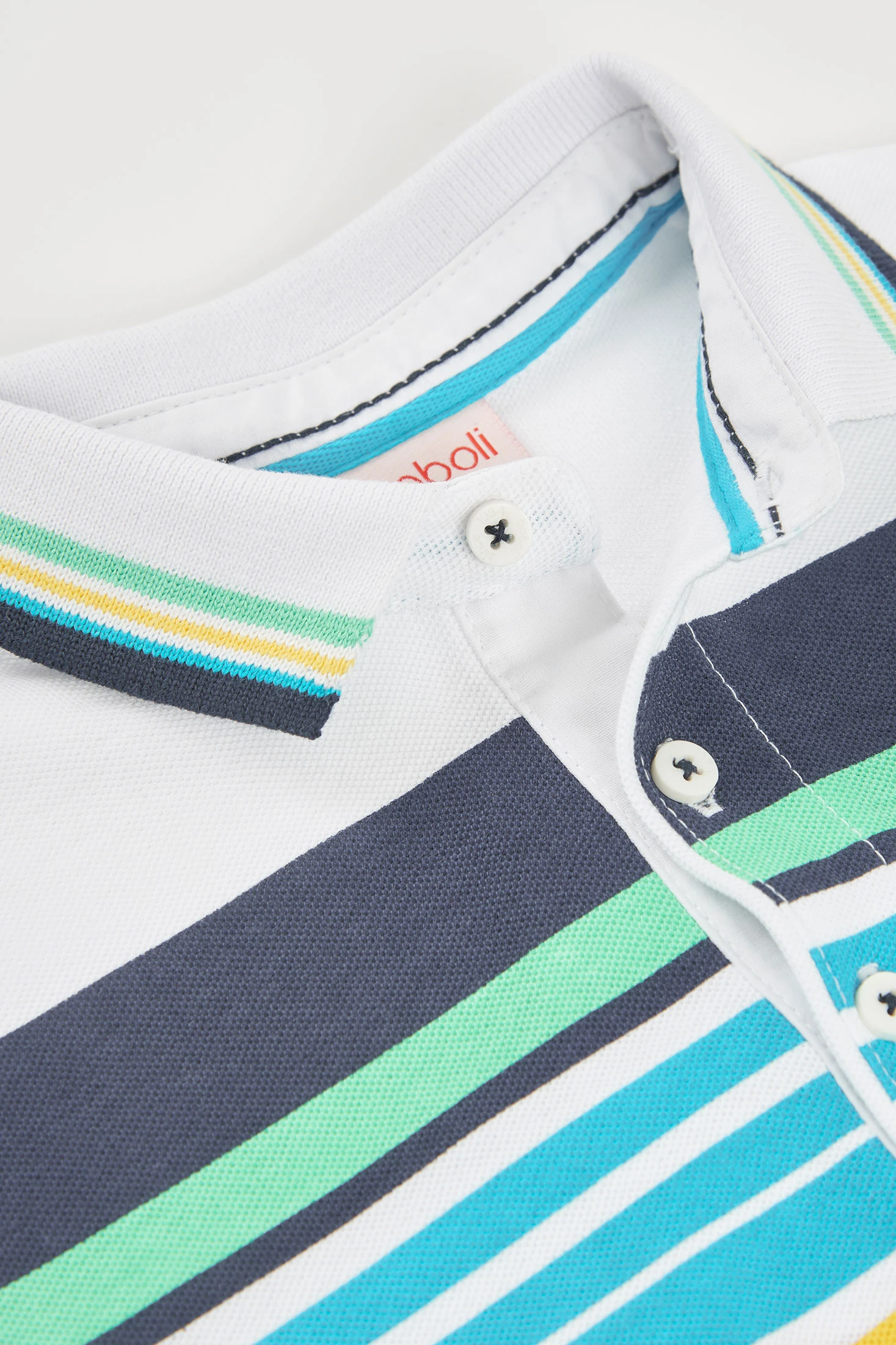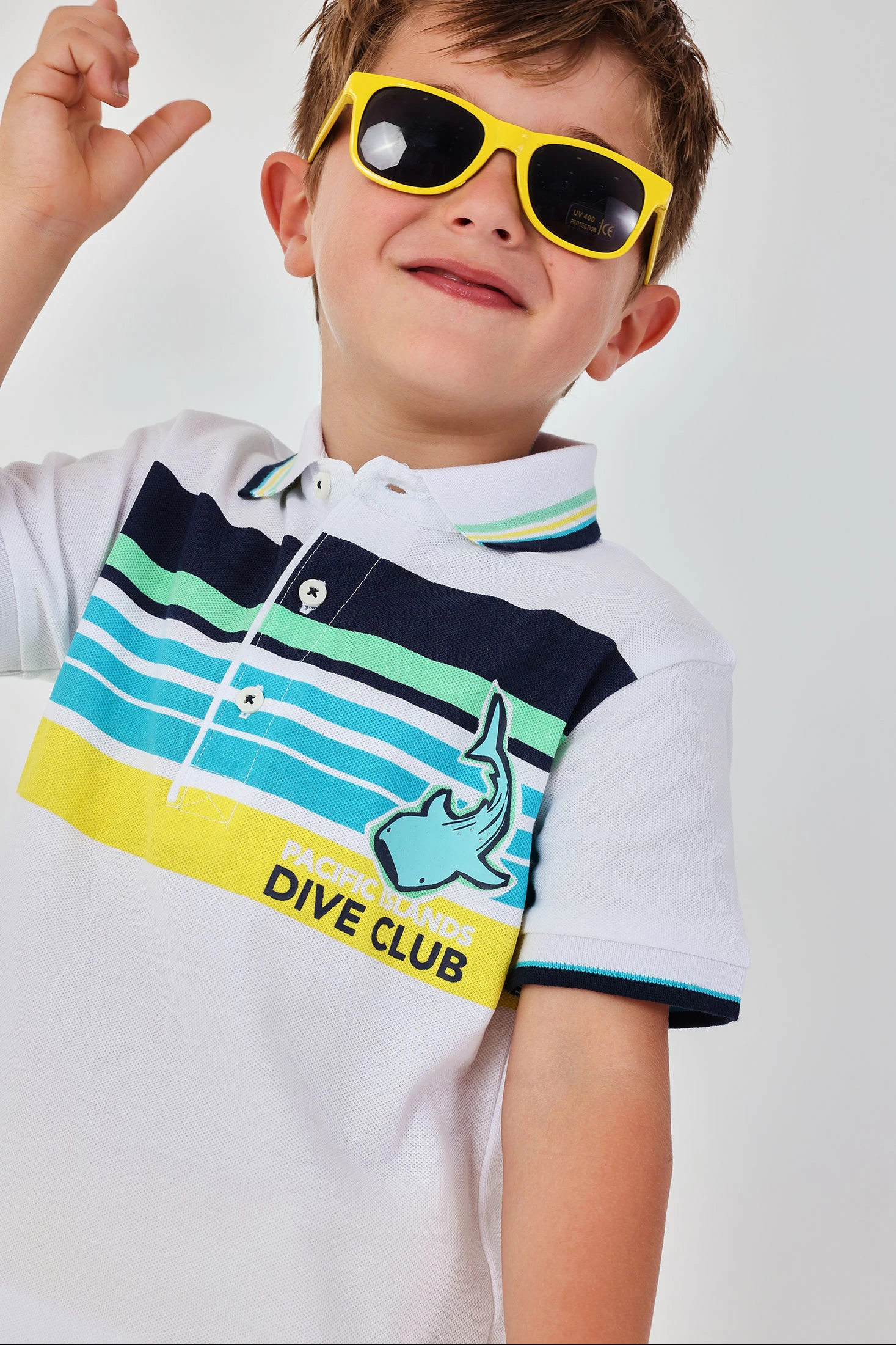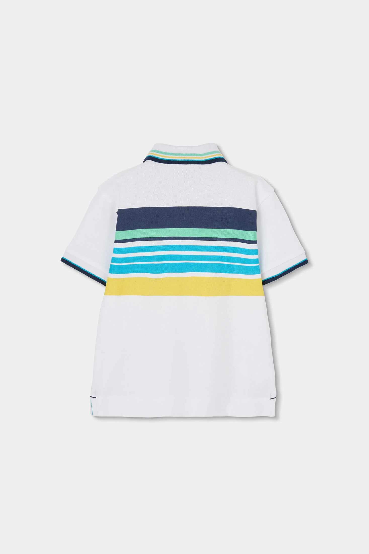 Weißes Baumwoll-Poloshirt für Jungen, frisch und vielseitig, mit einem Design aus horizontalen Streifen in Blau- und Gelbtönen. Es enthält einen Polo-Kragen mit bunten Streifen und eine Abbildung eines Meerestieres. Ideal für Altersgruppen von 12 Monaten bis 10 Jahren. Sein Baumwollgewebe sorgt für angenehmen Tragekomfort im Alltag. Die farbenfrohen Details machen es zu einem lustigen und einfach kombinierbaren Kleidungsstück. Perfekt für einen lässigen Stil mit Shorts oder Jeans.