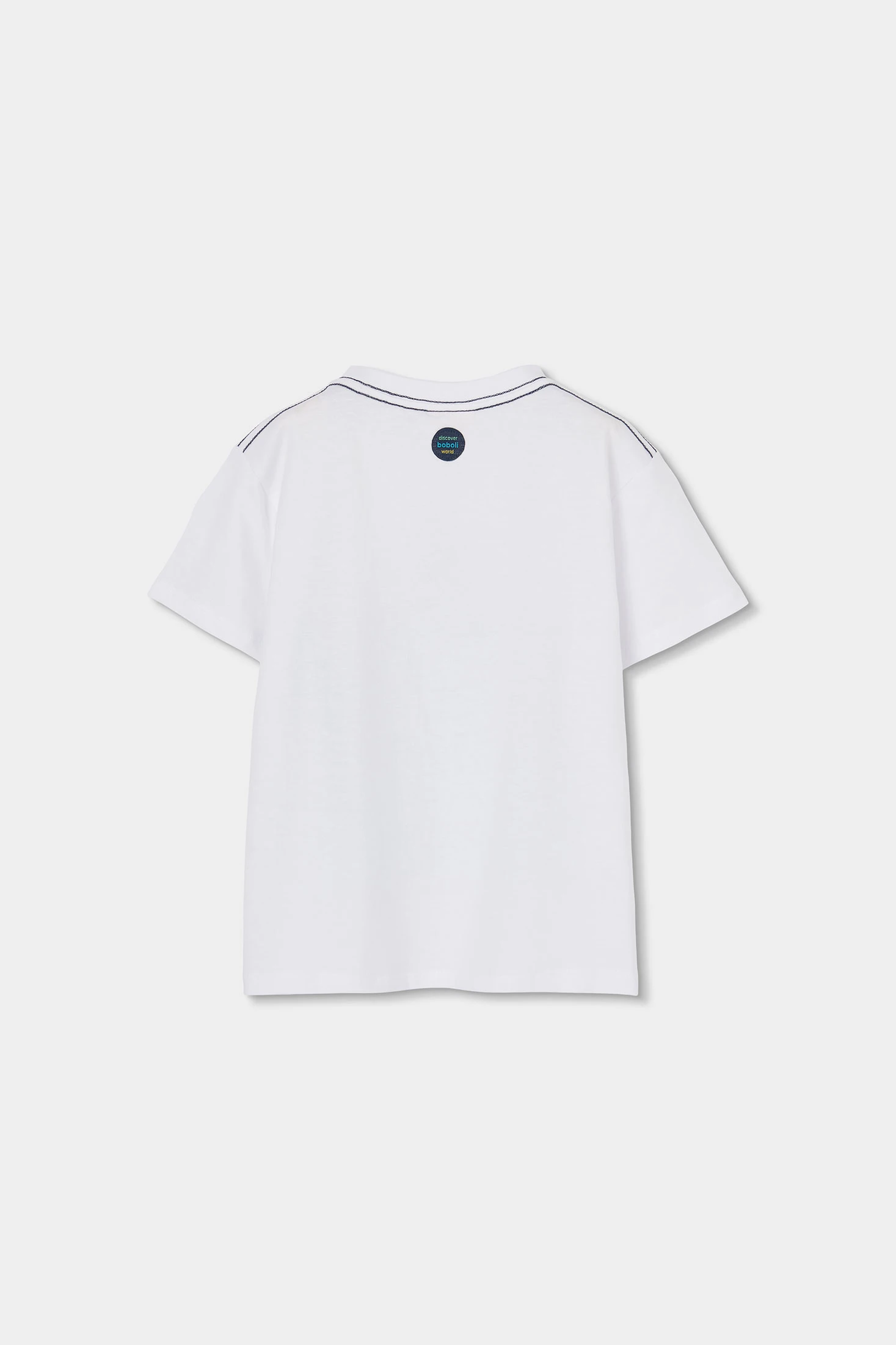 Baumwoll-T-Shirt für Jungen, ideal, um dem Kleiderschrank einen frischen Touch zu verleihen. In Weiß gehalten, mit einer lustigen Zeichnung eines Hais mit Sonnenbrille, perfekt, um die Fantasie der Kleinen anzuregen. Vielseitiges Kleidungsstück, geeignet für jeden lässigen Anlass. Das Design mit kurzen Ärmeln und Rundhalsausschnitt sorgt für Komfort im täglichen Gebrauch. Erhältlich in Größen von 12 Monaten bis 10 Jahren, ist dieses T-Shirt eine praktische und stylische Option, um Ihren Kleinen bequem und modisch zu halten.