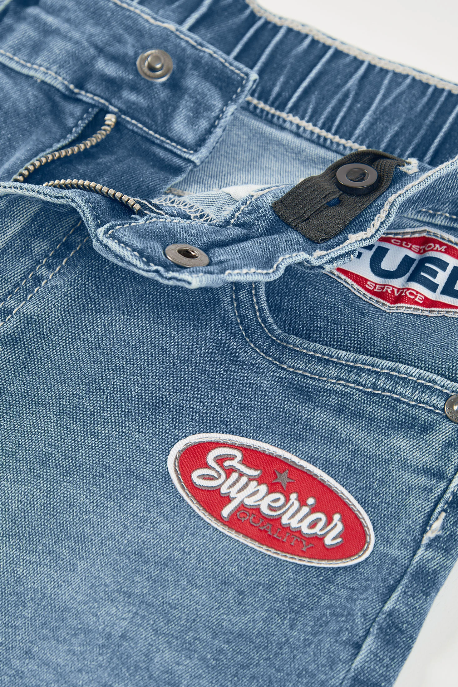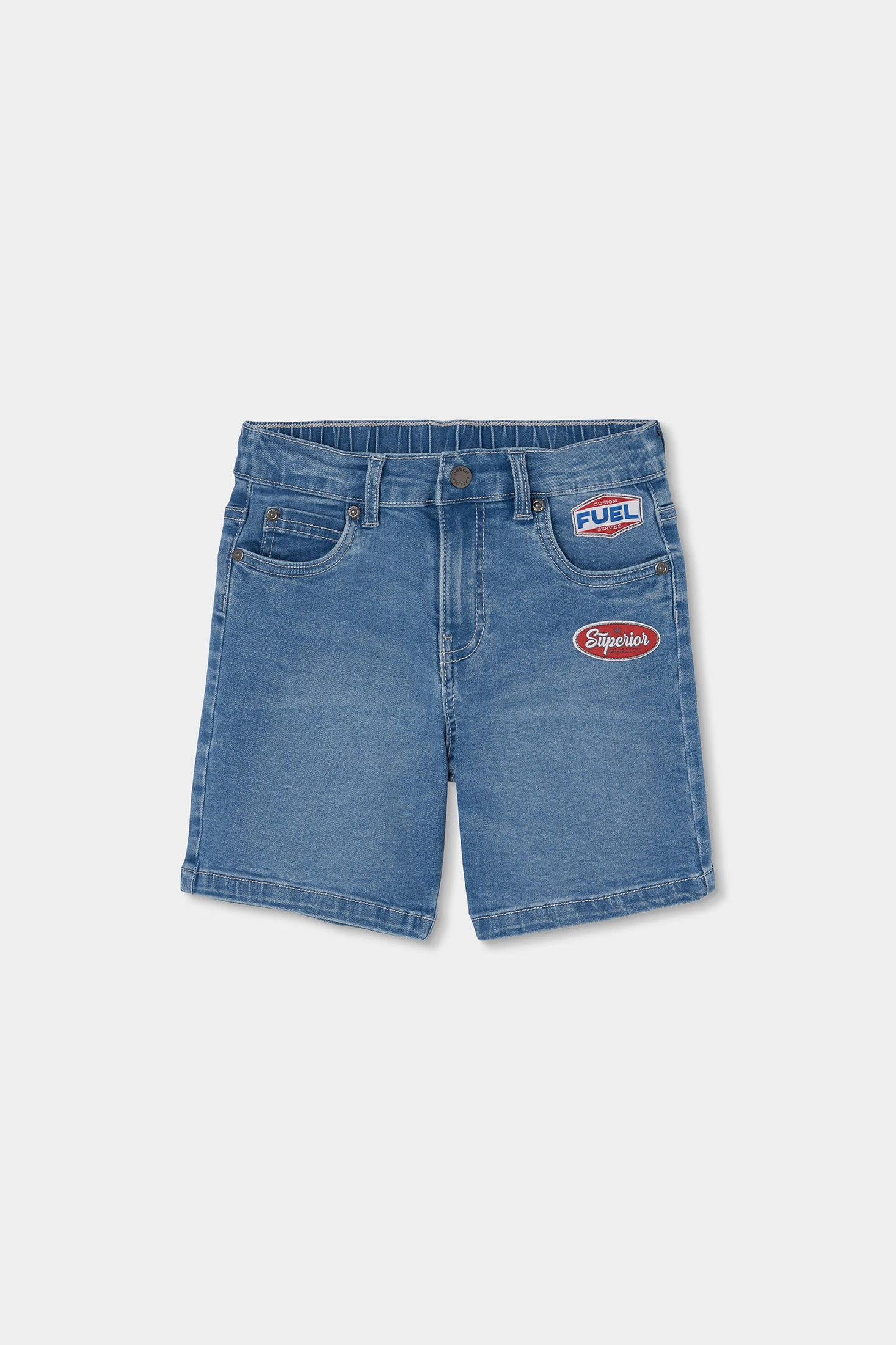 Blaue, elastische Denim-Bermudas, die perfekt für Kinder sind und Stil mit Komfort kombinieren. Ihr elastisches Gewebe bietet Bewegungsfreiheit, ideal für das tägliche Spielen. Sie haben lustige Patches, die einen modernen Touch verleihen. Erhältlich in Größen von 2 bis 14 Jahren. Eine vielseitige Option für warme Tage, die sich mit bunten T-Shirts oder lässigen Hemden kombinieren lässt. Ihr klassisches blaues Design erleichtert die Kombination mit verschiedenen Kleidungsstücken und macht sie zu einem unverzichtbaren Bestandteil jeder Kinder-Garderobe.
