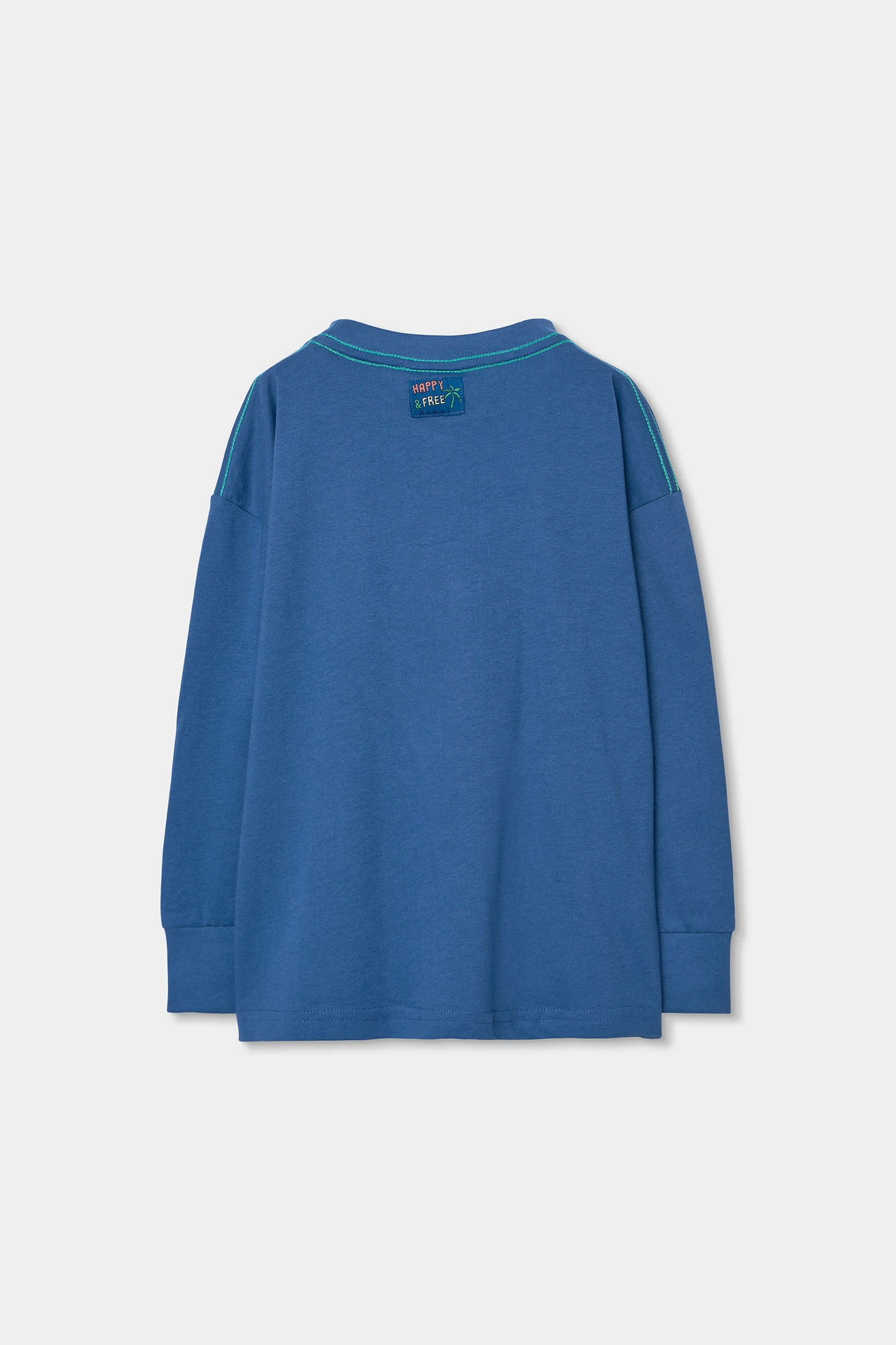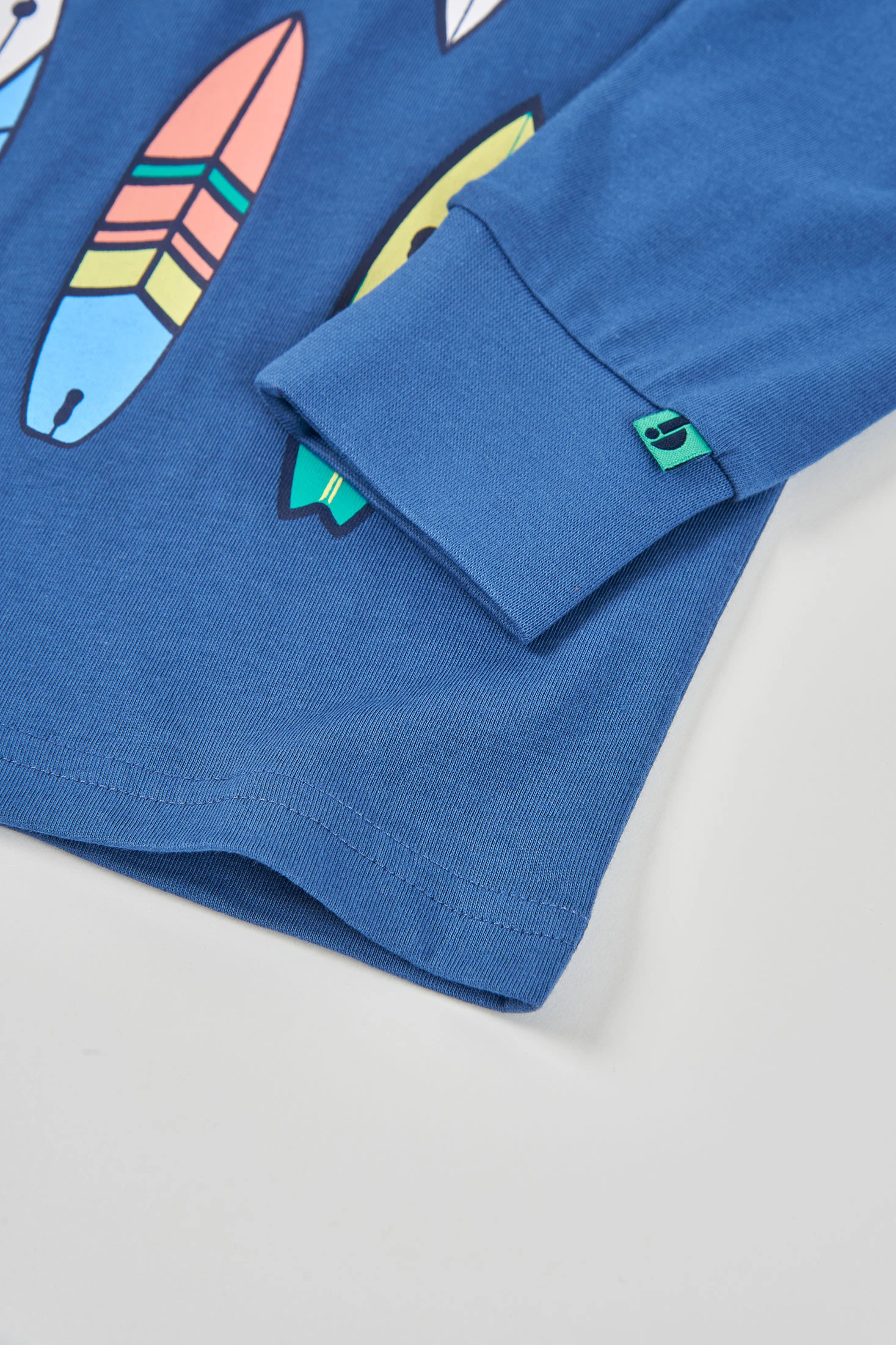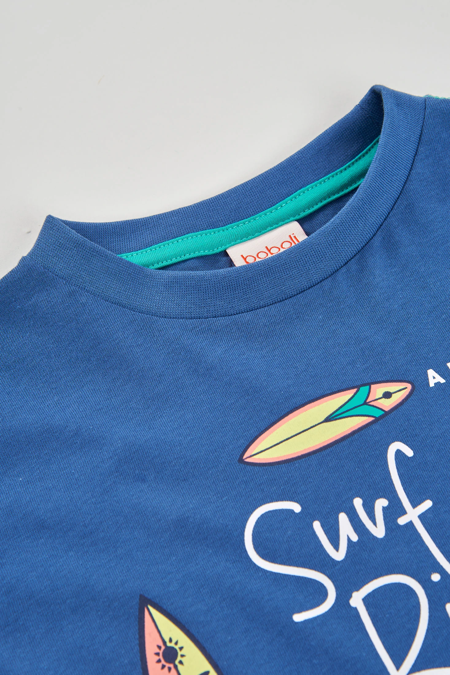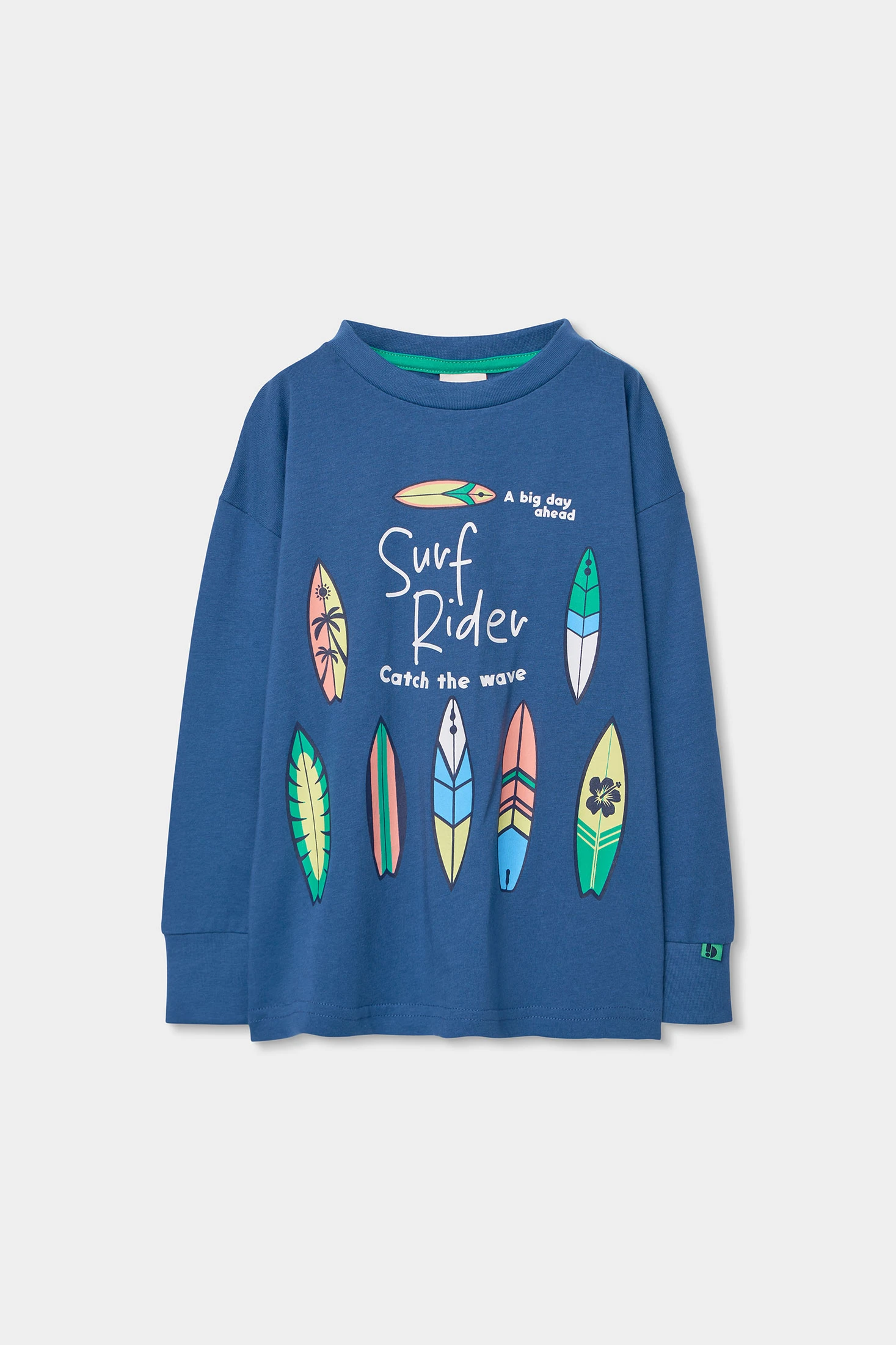 Langarmshirt für Jungen, aus blauem Strick-Baumwollstoff gefertigt, ideal für Komfort und Stil. Es hat ein Surfbrett-Design und Text, das ihm einen lustigen und sommerlichen Touch verleiht. Perfekt für Kinder von 2 bis 14 Jahren, bietet es eine vielseitige Option zum Kombinieren mit Hosen oder Shorts. Sein weiches Material ist ideal für den Alltag und bietet Wärme in kälteren Jahreszeiten. Ein Kleidungsstück, das nicht nur funktional ist, sondern auch ein modisches Element in die Kinder-Garderobe bringt.