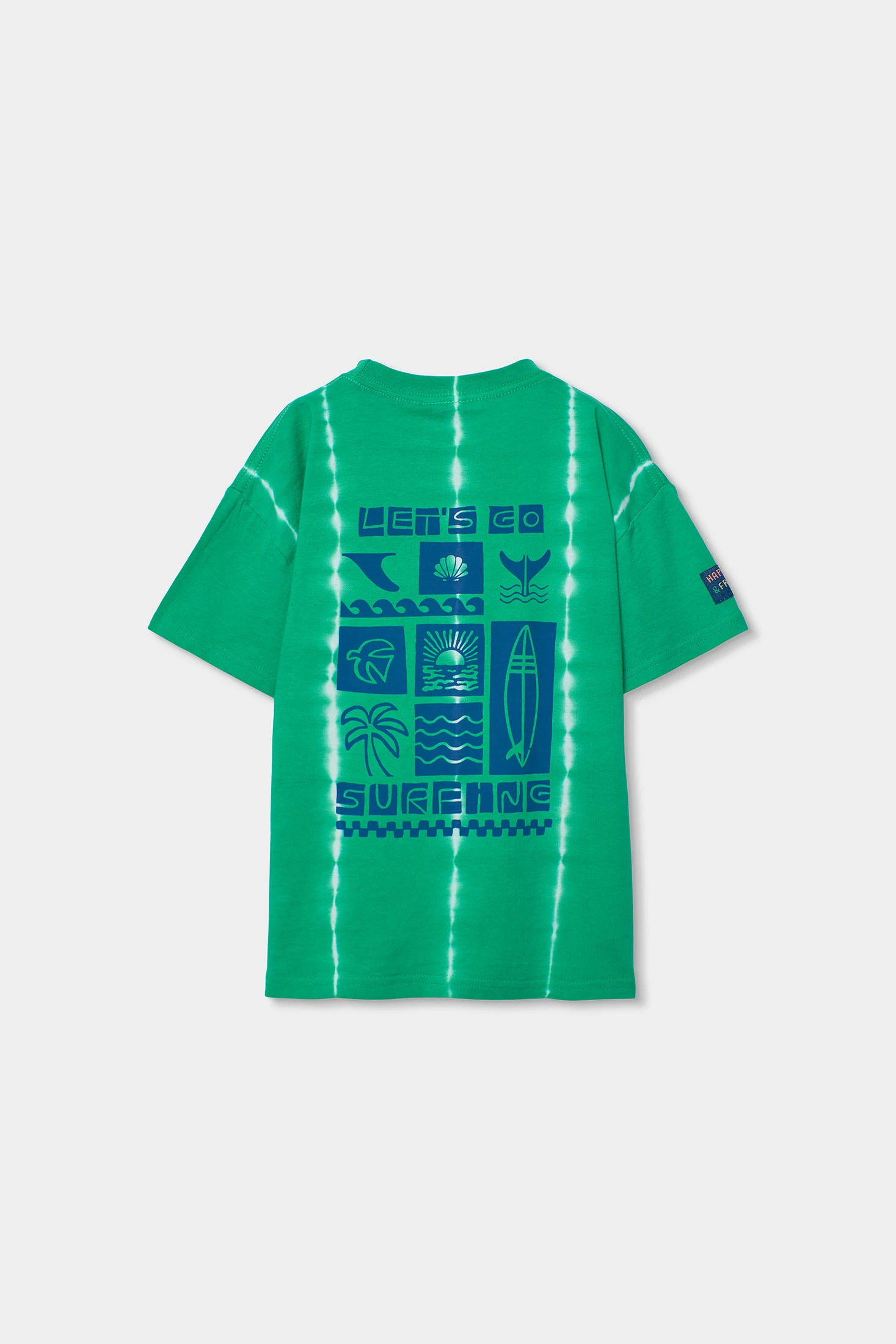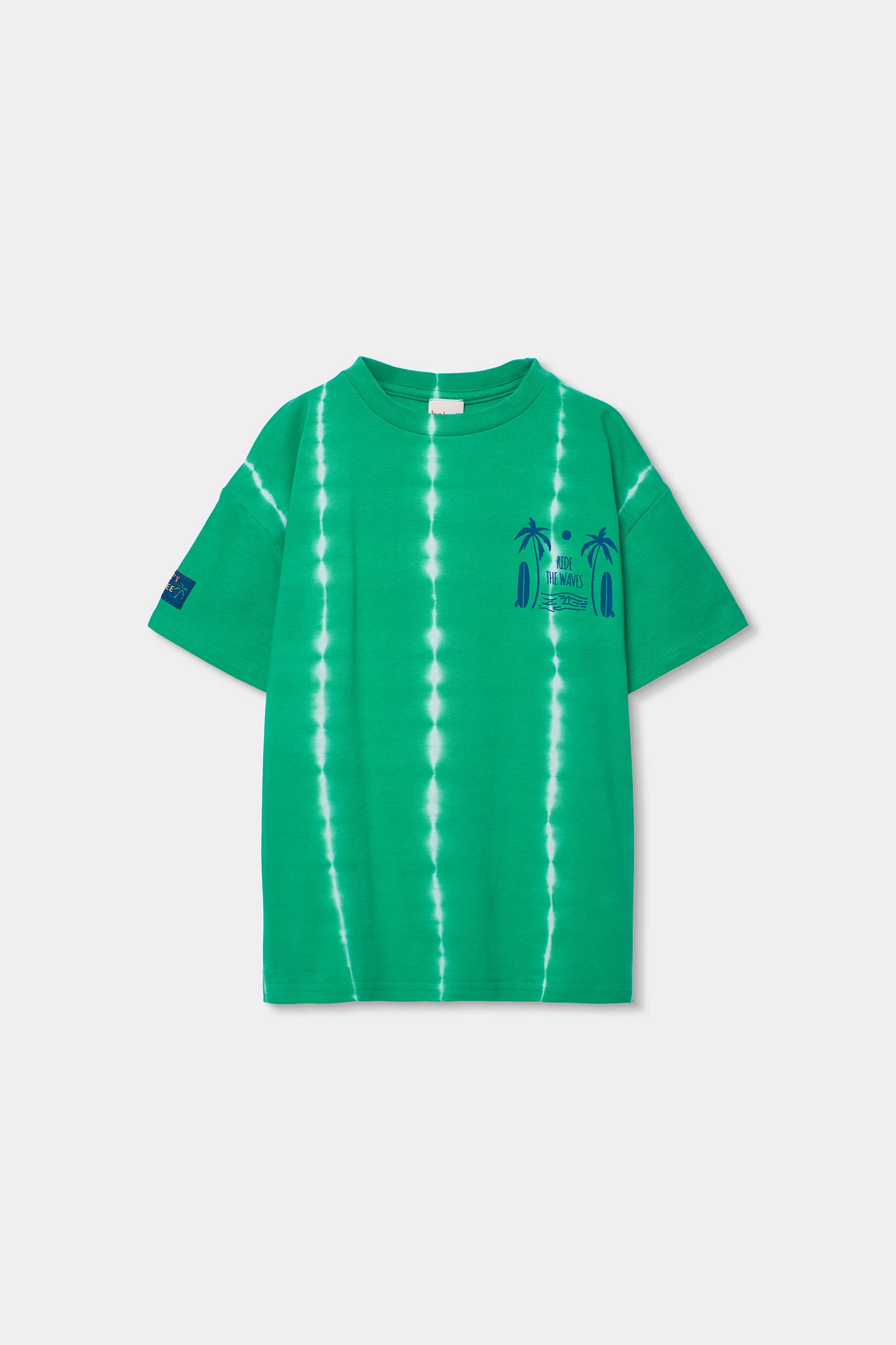 Kinder-T-Shirt aus Baumwolljersey gefertigt, bietet Komfort und Frische, ideal für warme Klimazonen. In lebendigem Grün zeigt es ein bedrucktes Design mit Palmen und Surfbrettern, das einen sommerlichen und abenteuerlichen Hauch verleiht. Sein runder Ausschnitt und die kurzen Ärmel machen es praktisch für den täglichen Gebrauch. Erhältlich in Größen von 2 bis 14 Jahren, ist es perfekt, um mit Shorts oder lässigen Hosen kombiniert zu werden und jedem Outfit einen entspannten und lustigen Stil zu verleihen.