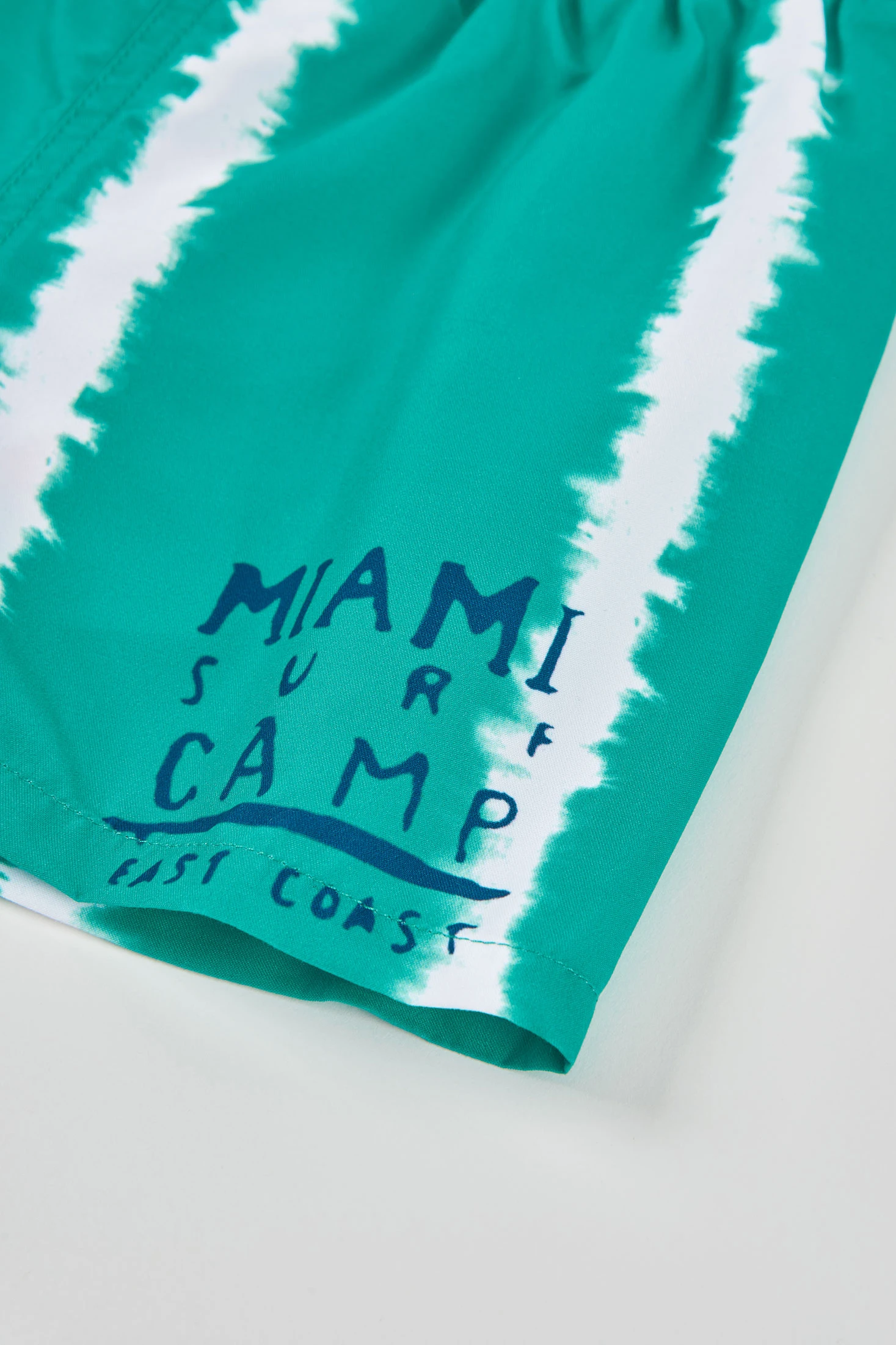 Grüne Badehose für Jungen, hergestellt aus recyceltem Material, ideal zum Genießen im Wasser. Das Design zeigt einen modernen Touch mit vertikalen, weißen Streifen. Das Kleidungsstück ist bequem und funktional, geeignet für Kinder von 2 bis 14 Jahren. Mit elastischem Bund und verstellbarem Kordelzug sorgt es für einen guten Sitz beim Spielen. Perfekt für Strand- oder Pooltage, ist es eine nachhaltige und praktische Option für den Sommer.