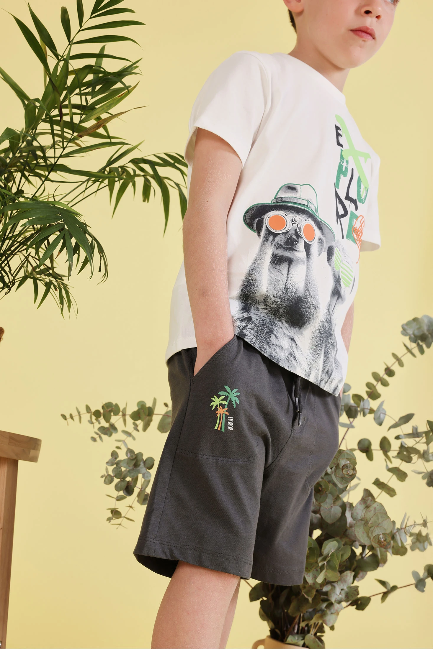 Graue Baumwollbermuda, ideal für Kinder, bietet Komfort und Frische. Ihr Design umfasst einen kleinen Palmenprint, der eine lustige Note hinzufügt. Das Kleidungsstück verfügt über einen verstellbaren elastischen Bund mit Kordelzug, der eine sichere und optimale Passform garantiert. Erhältlich in den Größen von 12 Monaten bis 14 Jahren, passt sie sich dem Wachstum des Kindes an. Perfekt zum Kombinieren mit T-Shirts an warmen Tagen, ist diese Bermuda eine praktische und vielseitige Option für den Alltag.