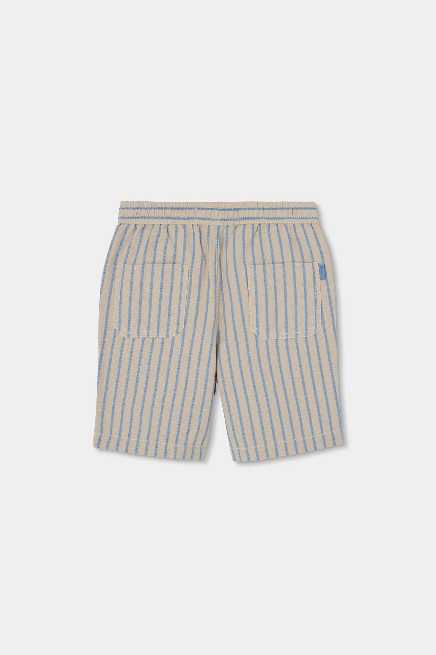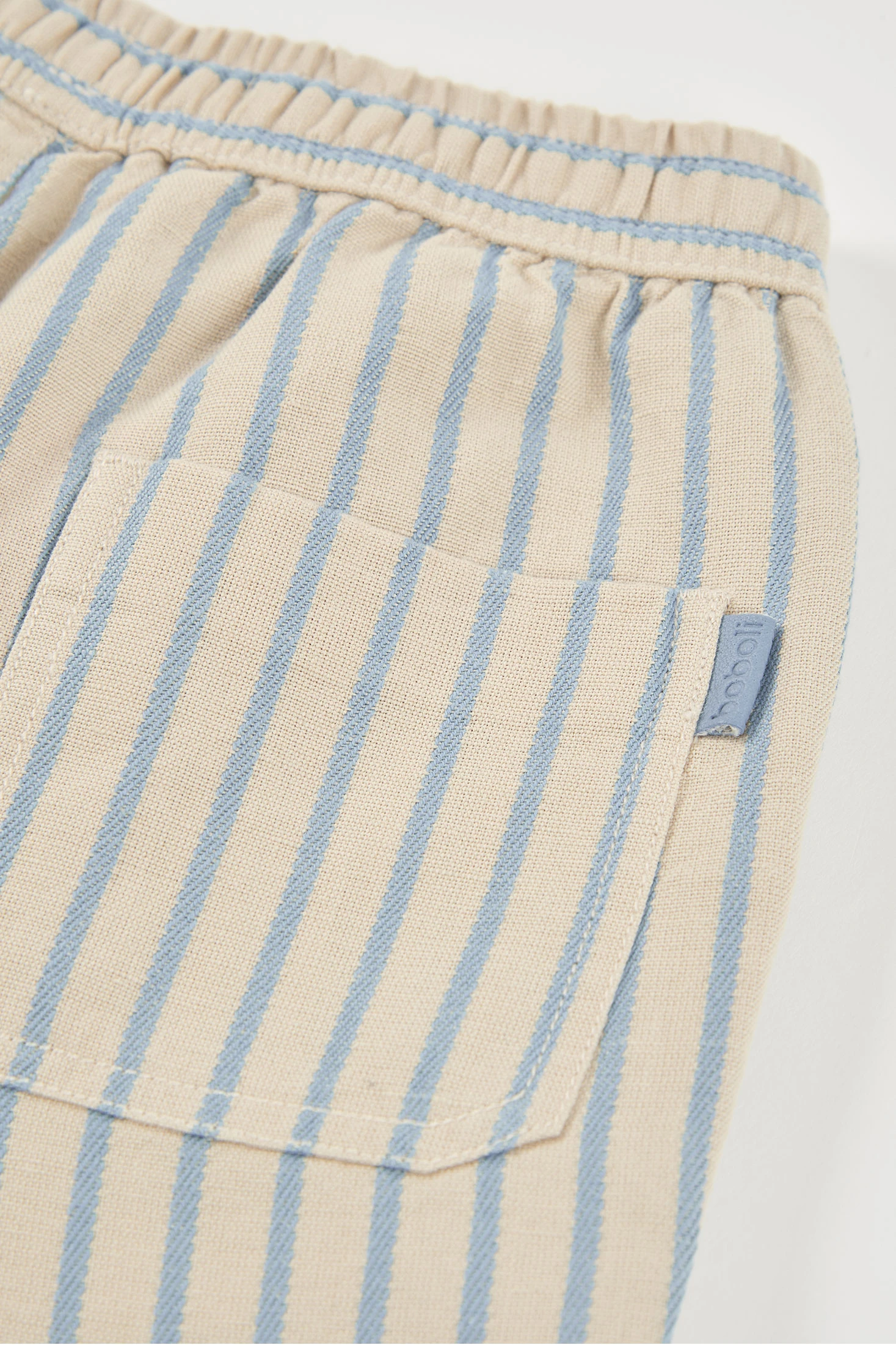 Kinderleinen-Bermudas präsentieren ein Streifendesign in Beige- und Blautönen, ideal für den Sommer. Hergestellt aus einem weichen und bequemen Stoff, sind sie perfekt, damit die Kleinen frei spielen können. Der elastische Bund mit verstellbarem Kordelzug sorgt für eine perfekte Passform. Verfügbar in Größen von 12 Monaten bis 10 Jahren. Sie sind eine frische und vielseitige Option, die sich leicht mit neutralen T-Shirts und Polos für einen lässigen und angenehmen Look an warmen Tagen kombinieren lässt.