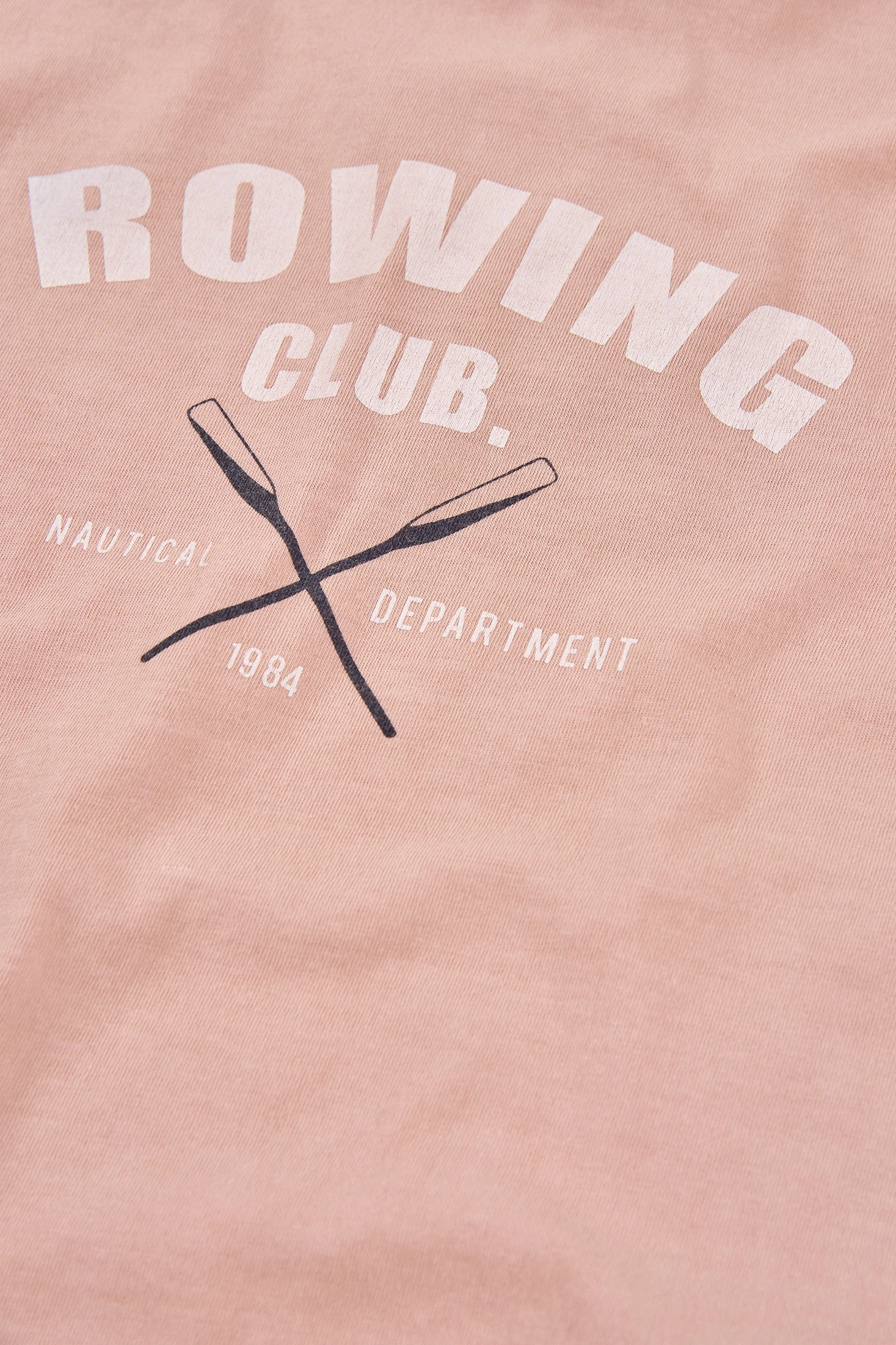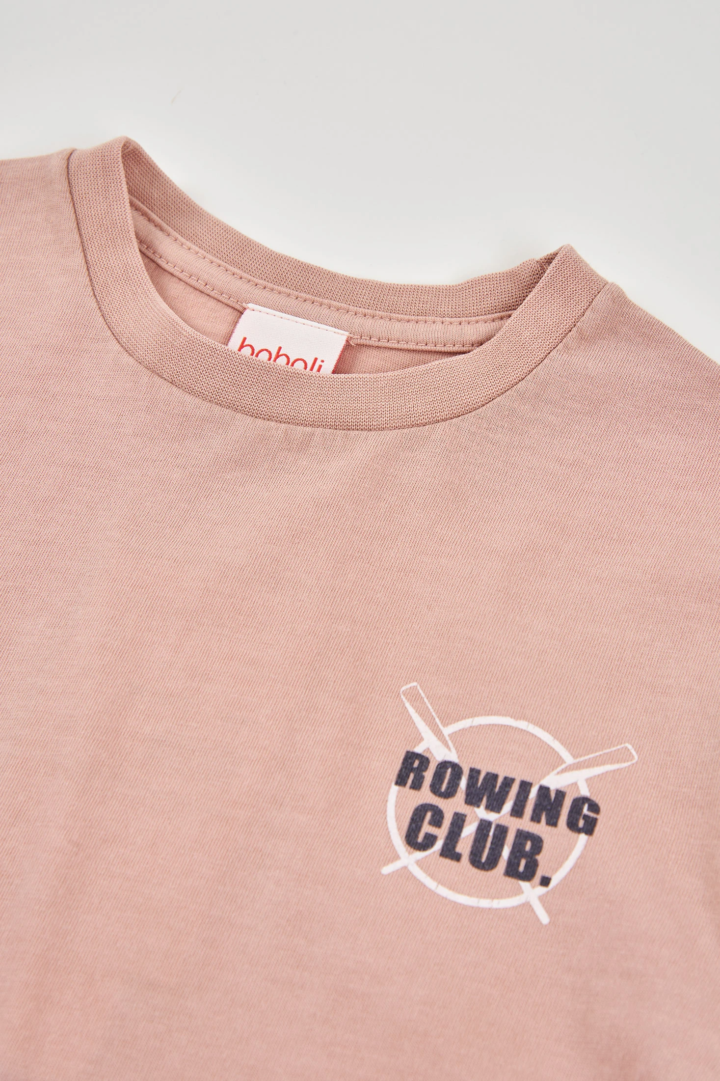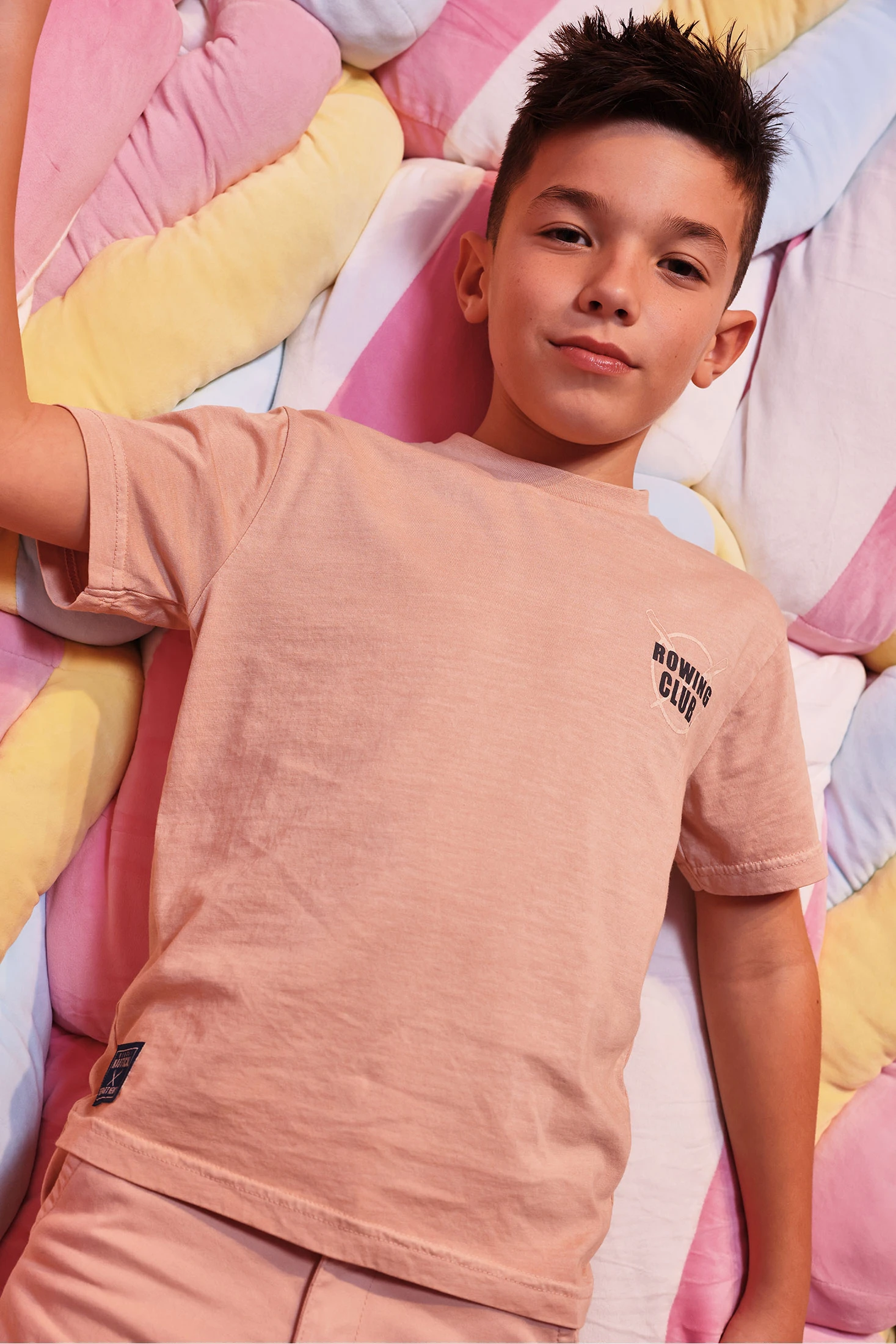 Lachsfarbenes Baumwoll-T-Shirt für Jungen, ideal für den täglichen Gebrauch. Das Design zeigt einen dezenten Druck mit der Aufschrift "Rowing Club", was ihm einen sportlichen und modernen Touch verleiht. Perfekt für die Frühlings- und Sommersaison, bietet das weiche und atmungsaktive Material Komfort. Erhältlich in Größen von 2 bis 14 Jahren, ist dieses T-Shirt vielseitig und kann leicht mit Shorts oder Jeans kombiniert werden. Ein essentielles Kleidungsstück für einen lässigen und frischen Stil.