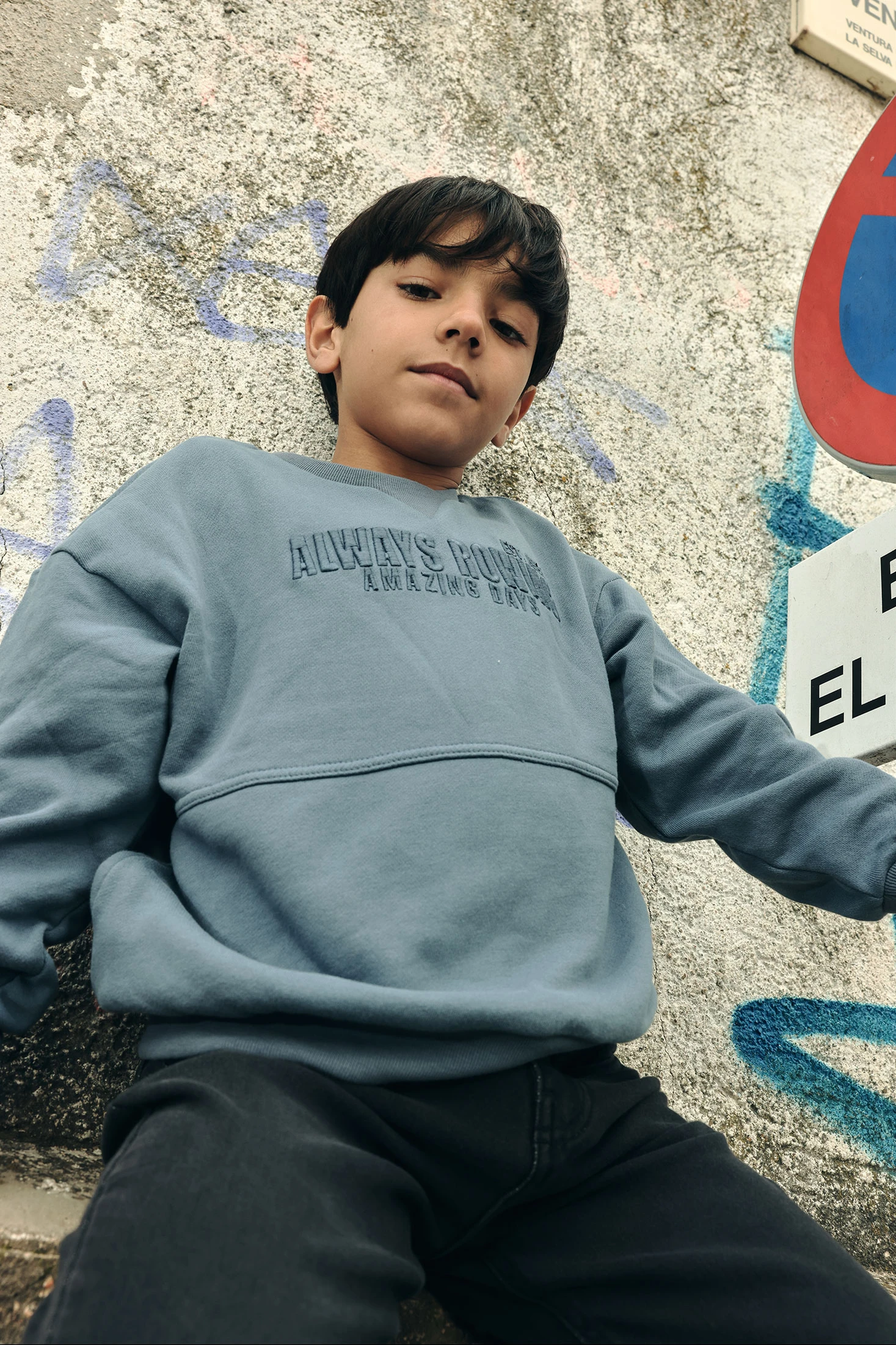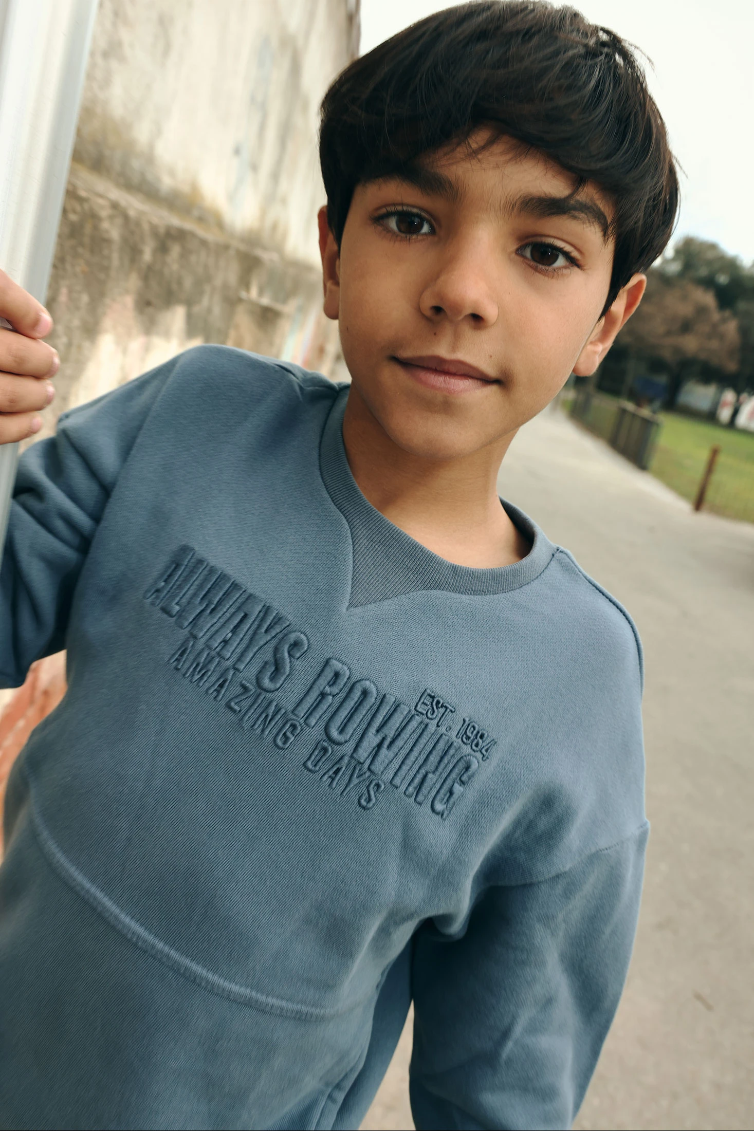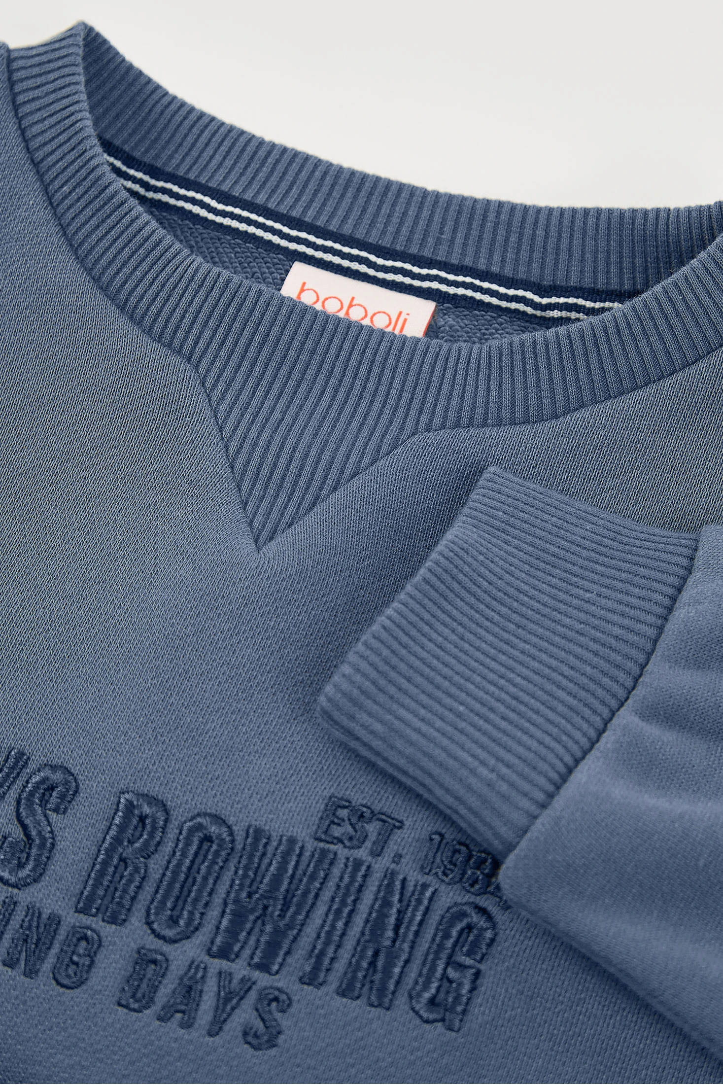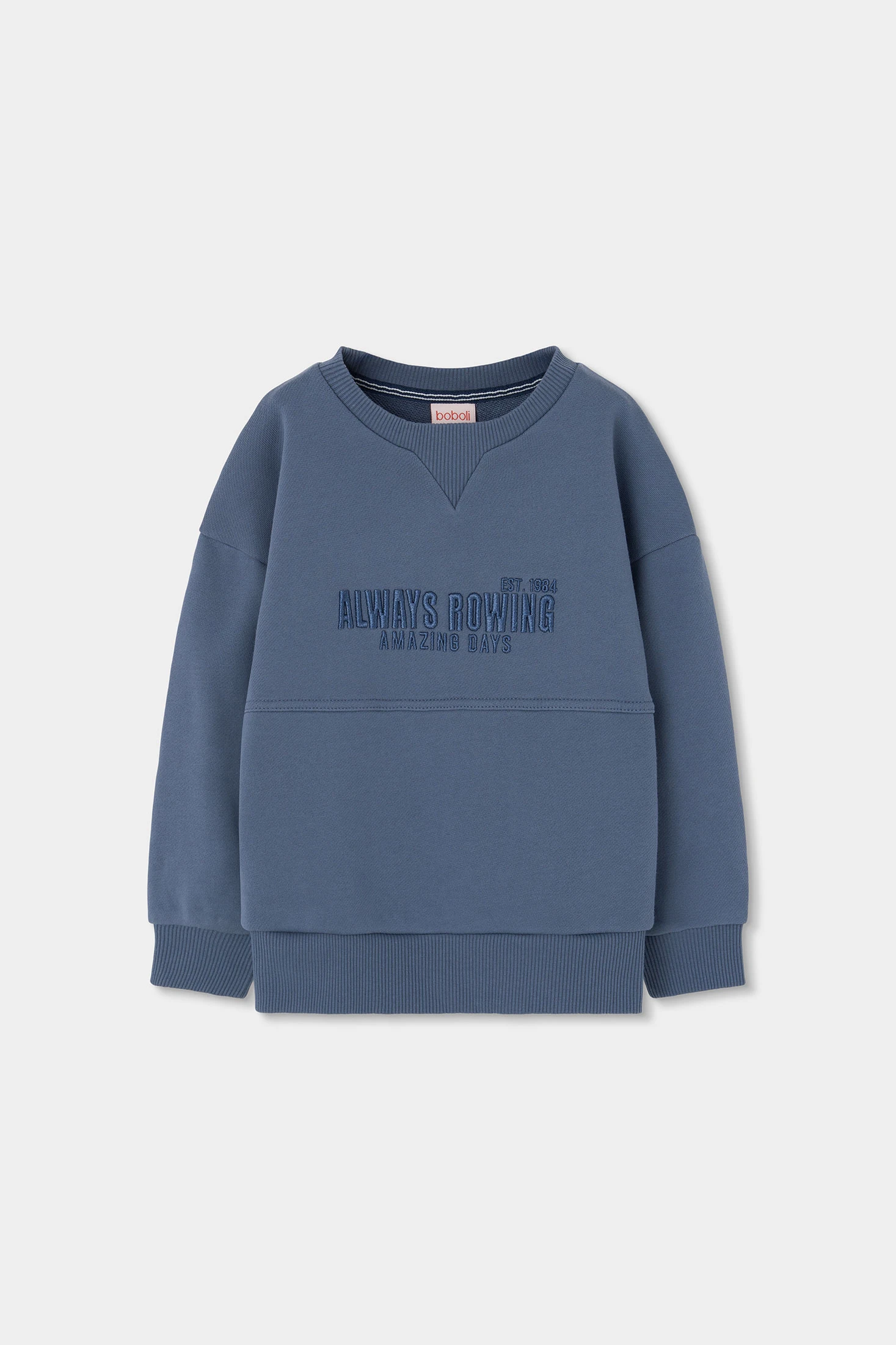 Blaue Sweatshirt aus Frottee für Jungen, ideal für den Frühling. Sein weicher Stoff bietet Wärme und Komfort. Es hat ein schlichtes Design mit einem gestickten Detail auf der Vorderseite, das einen modernen Touch verleiht. Das Sweatshirt hat einen Rundhalsausschnitt und lange Ärmel, ideal um warm zu bleiben. Erhältlich in den Größen von 2 bis 14 Jahren. Perfekt, um es mit Jeans oder lässigen Hosen zu kombinieren, ist es eine vielseitige Option für jeden Kinderkleiderschrank.