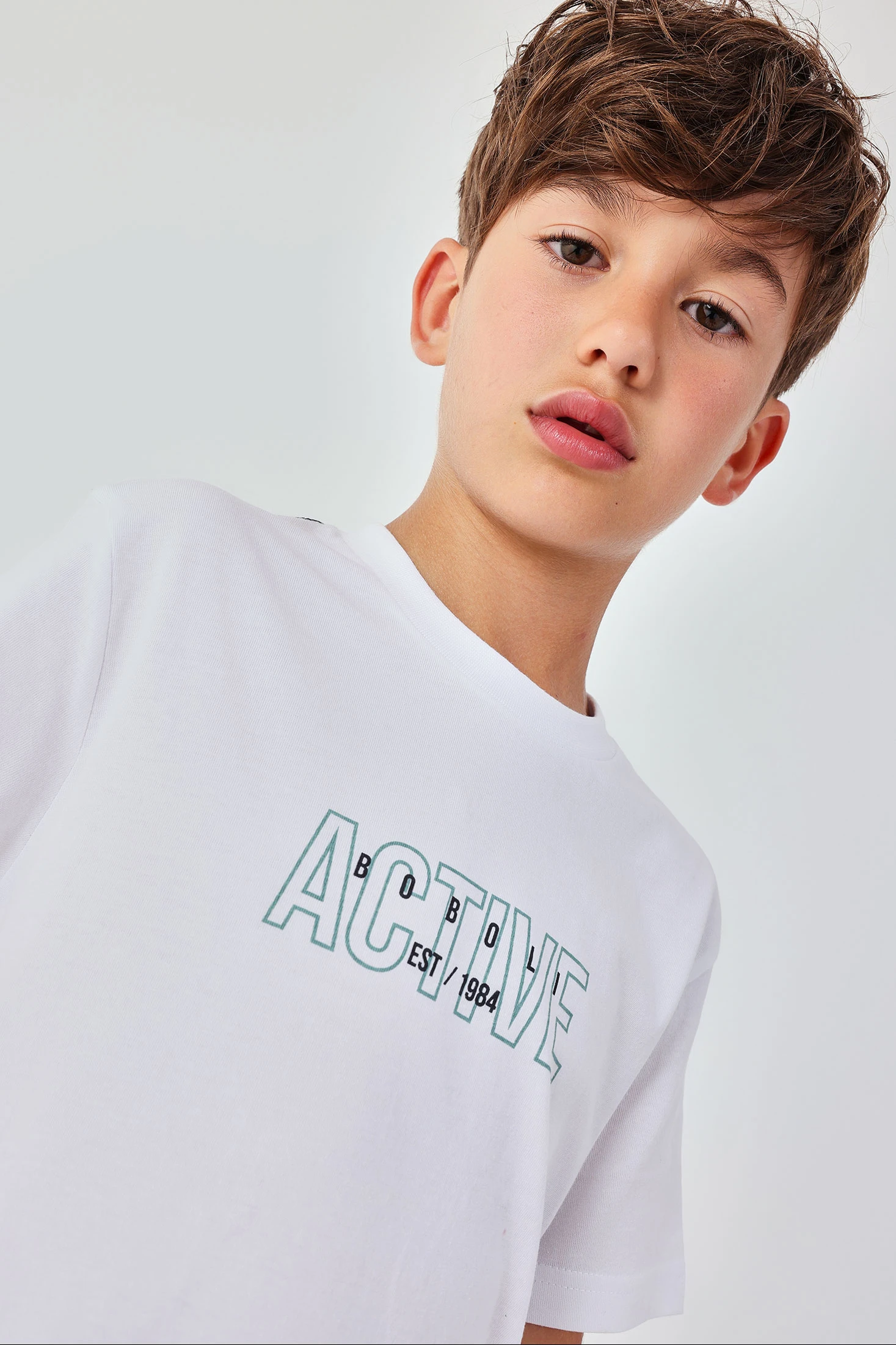 Weiße Baumwoll-T-Shirt für Jungen, ideal für jeden Anlass. Das Design ist einfach und bequem, mit dem Schriftzug "ACTIVE" auf der Vorderseite, der Dynamik verleiht. Hergestellt aus hochwertigem Material, ist dieses T-Shirt weich und atmungsaktiv. Erhältlich in Größen von 2 bis 14 Jahren, passend für verschiedene Altersstufen und Wachstumsphasen. Perfekt zum Kombinieren mit Shorts oder Jeans an warmen Tagen, bietet es einen lässigen und modernen Stil. Ein grundlegendes und vielseitiges Kleidungsstück für den Kleiderschrank eines jeden Kindes.