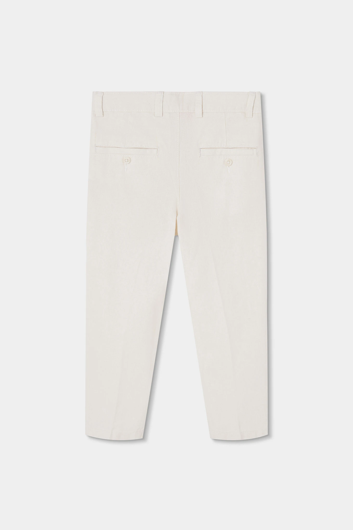 Weiße Leinenhose für Jungen, ideal für einen eleganten und frischen Look. Gefertigt aus Leinenstoff, der sie sehr leicht und perfekt für warmes Wetter macht. Ihr klassisches Design umfasst seitliche Taschen und einen Knopfverschluss und bietet Funktionalität und Stil. Erhältlich in Größen von 12 Monaten bis 14 Jahren, ist sie eine vielseitige Option für besondere Anlässe. Ihre weiße Farbe macht es einfach, sie mit Hemden in verschiedenen Farben zu kombinieren und jedem Outfit einen Hauch von Raffinesse zu verleihen.