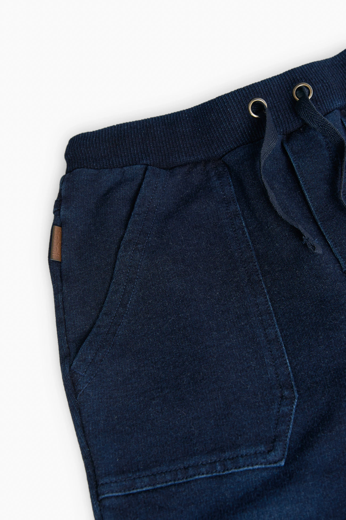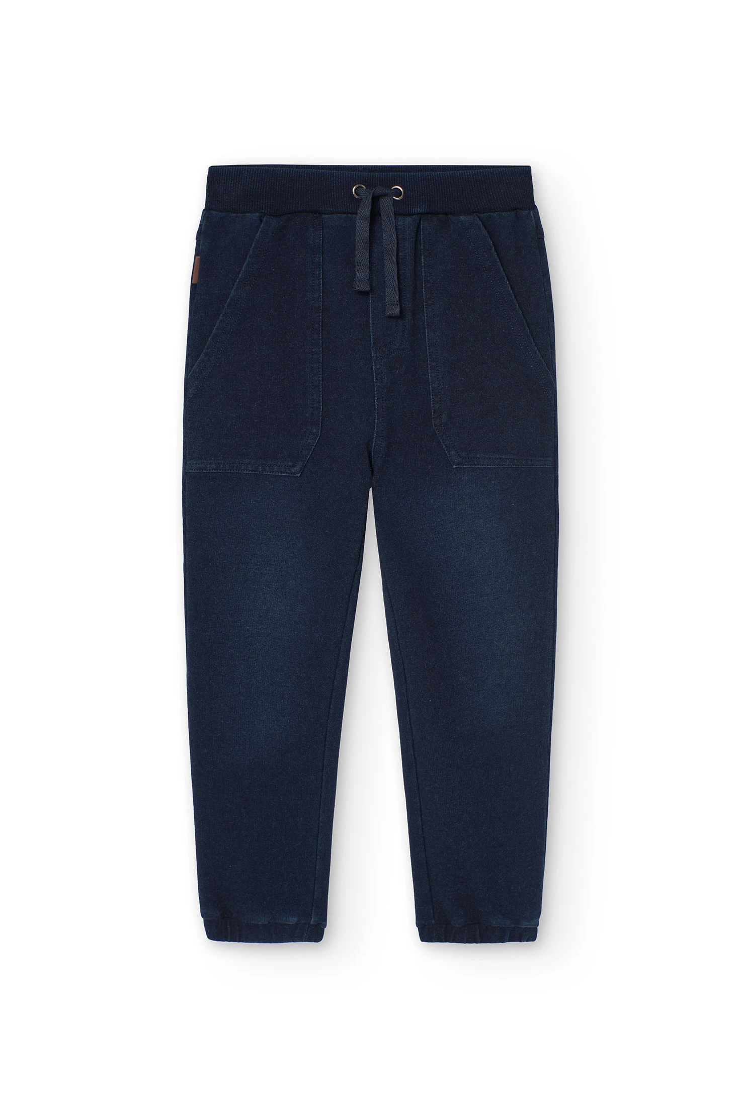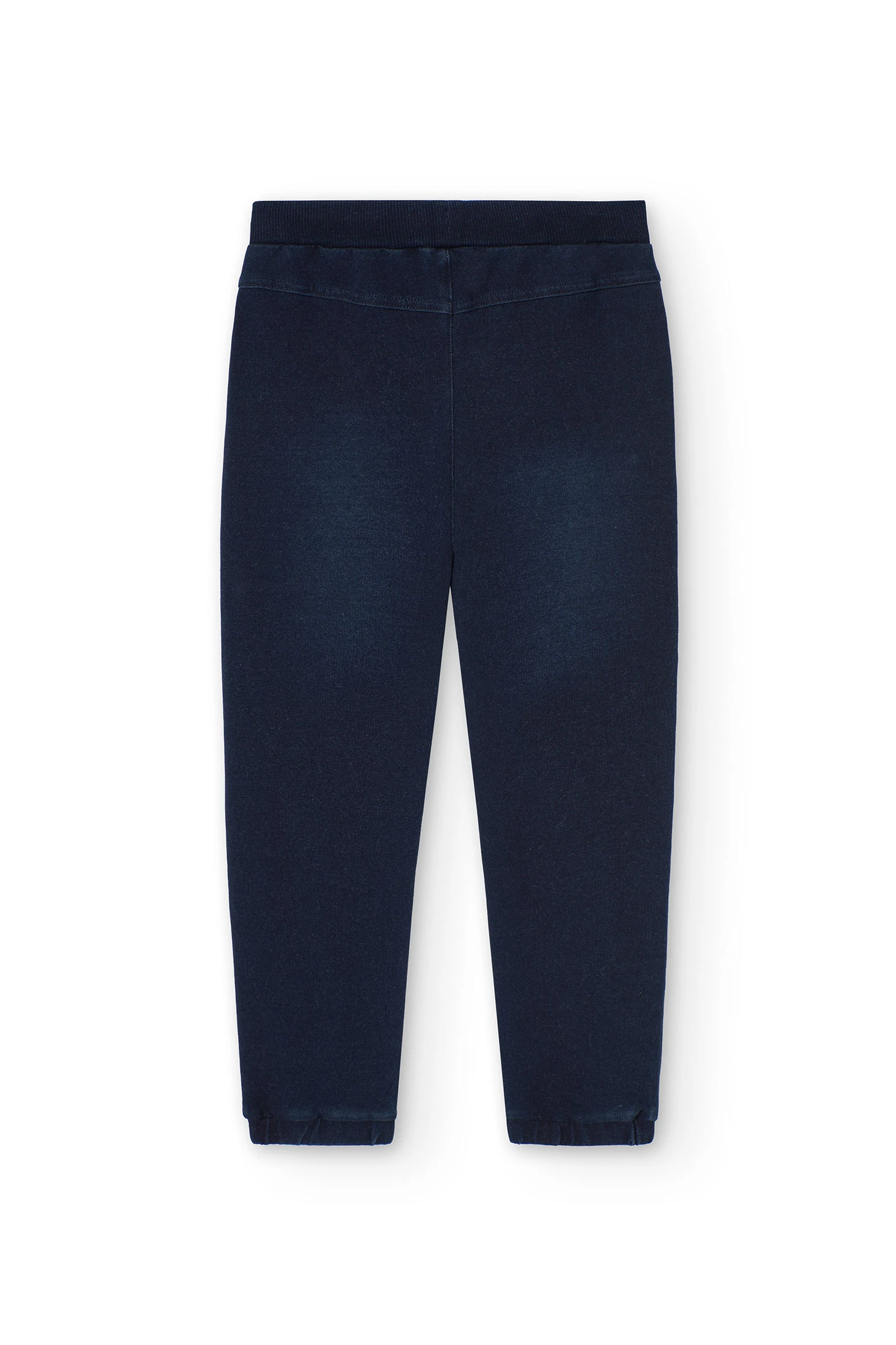 Diese Denim-Fleece-Hose für Jungen ist perfekt für die Übergangszeit. Der gestrickte Stoff verleiht ihr eine weiche und bequeme Textur, ideal für den täglichen Gebrauch. Das schlichte Design ohne Verzierungen macht es einfach, sie mit jedem Outfit zu kombinieren. Die navyblaue Farbe verleiht ihm einen Hauch von Eleganz und Vielseitigkeit. Erhältlich in den Größen von 4 Monaten bis 16 Jahren, ist diese Hose eine praktische und strapazierfähige Option für jede Kindergarderobe.
