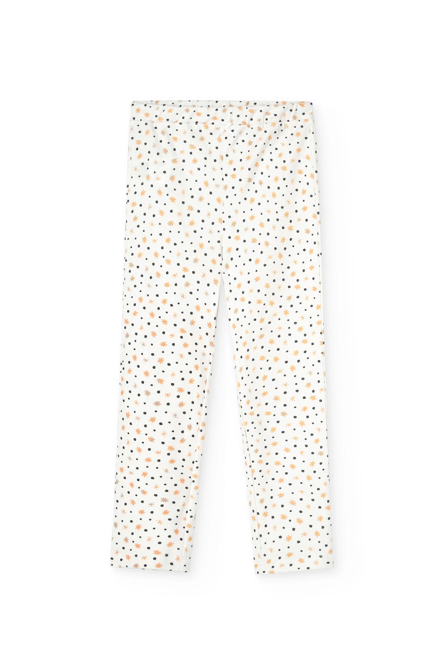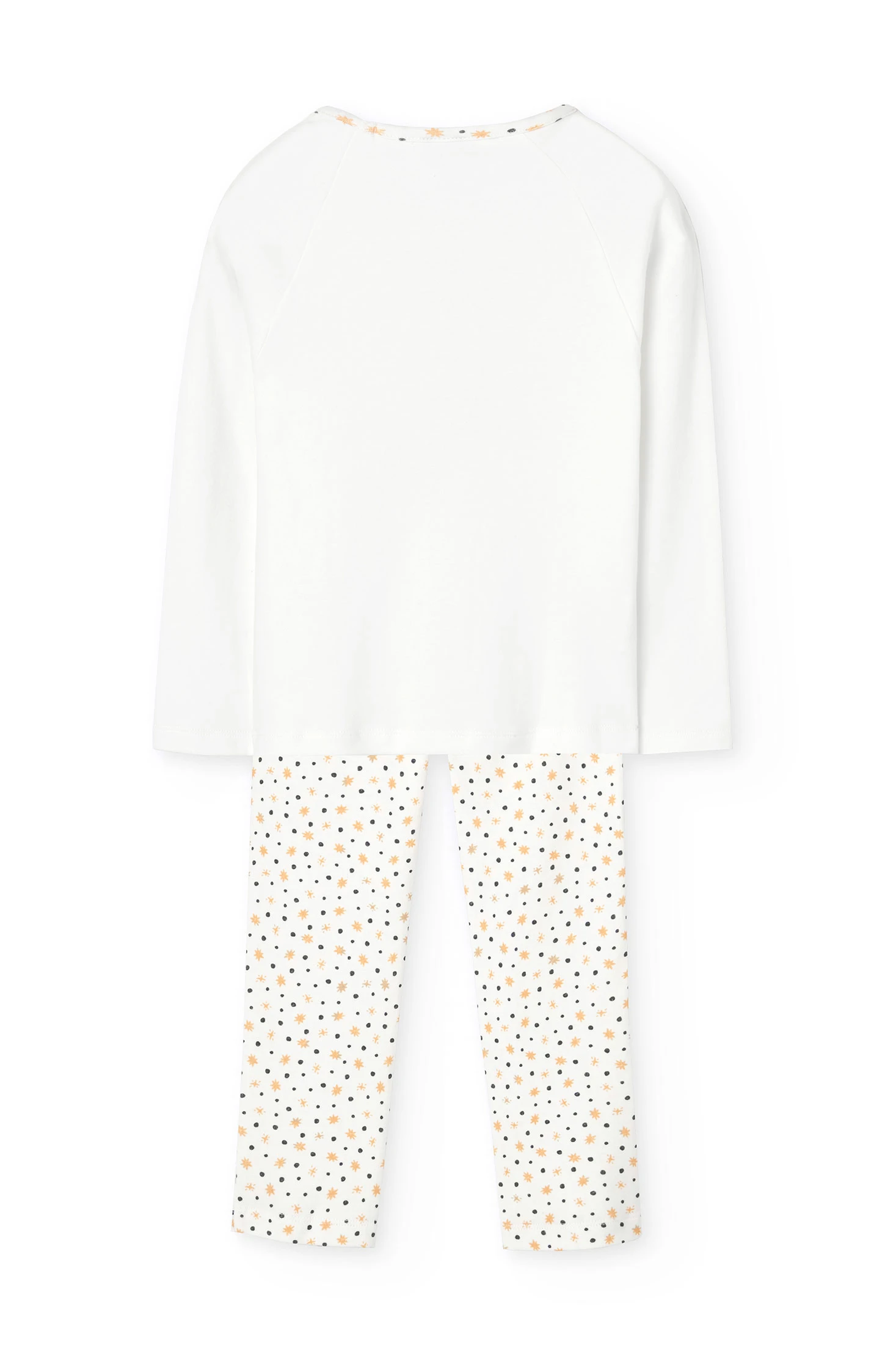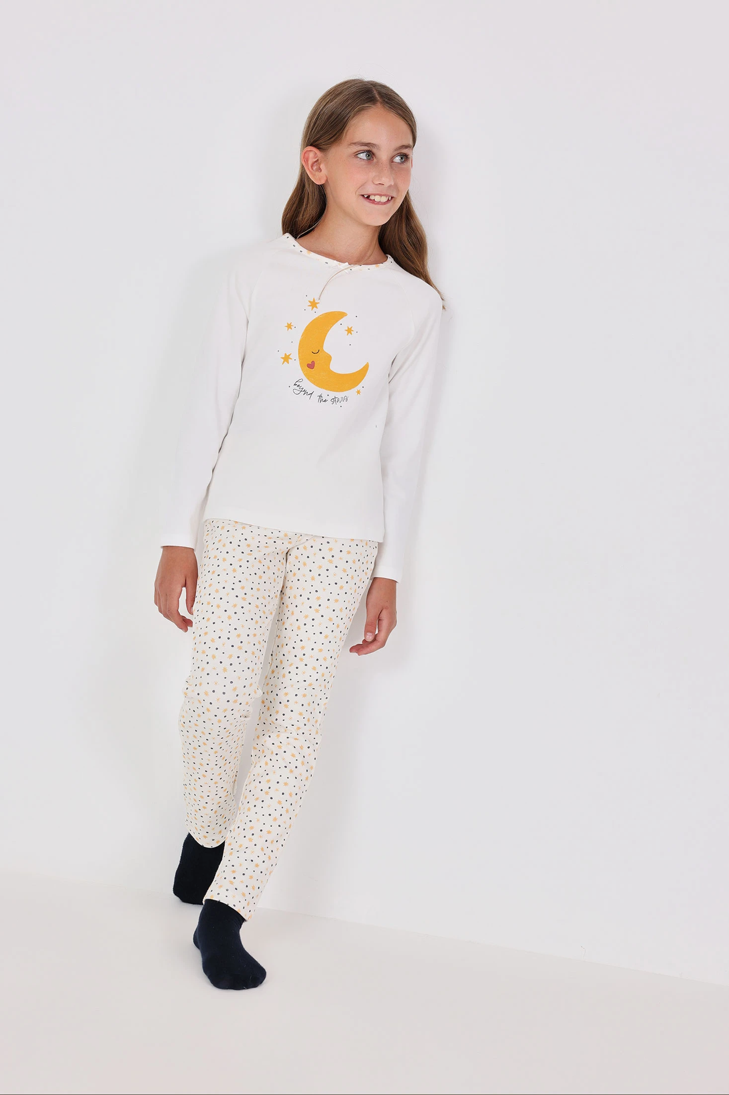 Bedruckter Interlock-Schlafanzug für Mädchen, verziert mit einem bezaubernden Mond- und Sternendesign, perfekt für kalte Winternächte. Hergestellt aus weichem Interlock-Gewebe, bietet er Wärme und Komfort während der Ruhezeit. Das Set enthält ein weißes T-Shirt mit goldenen Details und dem Satz „beyond the stars“, das die mit kleinen Sternen verzierten Hosen ergänzt. Verfügbar in den Größen 2 bis 14 Jahre, ist es eine ideale Wahl für einen bequemen und stilvollen Schlaf.