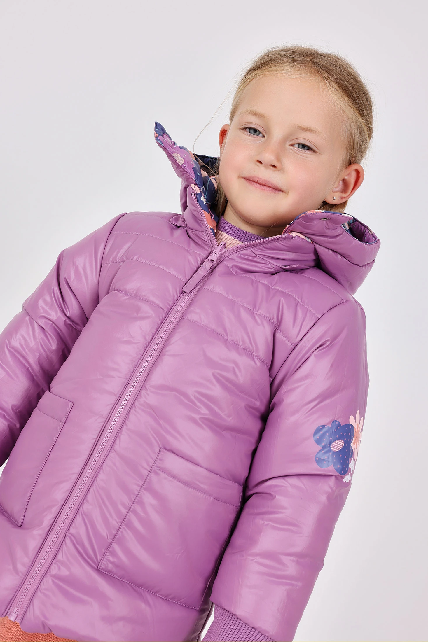 Wendbare Mädchenparka aus technischem Gewebe in Lila mit Blumen