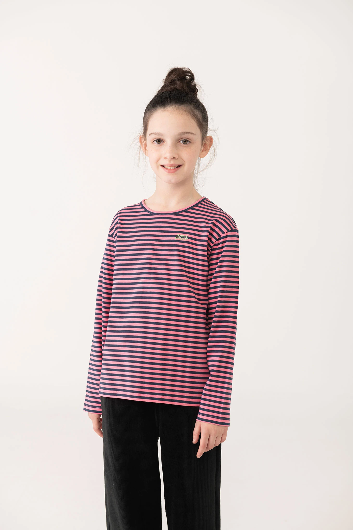 Strick-T-Shirt für Mädchen, entworfen mit einem Streifenmuster in Rosa und Marineblau, perfekt, um Farbe in die Herbst- und Wintertage zu bringen. Hergestellt, um Komfort und Frische zu bieten, verfügt sie über einen Rundhalsausschnitt und kurze Ärmel, ideal für den täglichen Gebrauch. Ein zartes Stickerei-Detail auf der Brust verleiht einen unverwechselbaren Akzent. Erhältlich in den Größen 2 bis 14 Jahre, eignet sie sich hervorragend, um lässige und moderne Looks zu kreieren, wenn sie mit Jeans oder Röcken kombiniert wird.