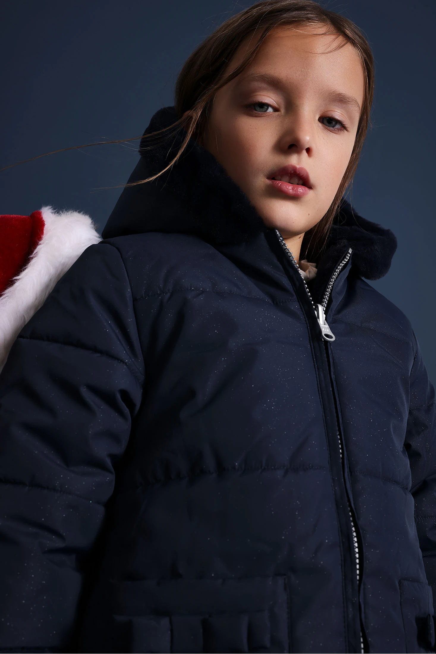 Reversible marineblaue Mädchenparka aus technischem Gewebe