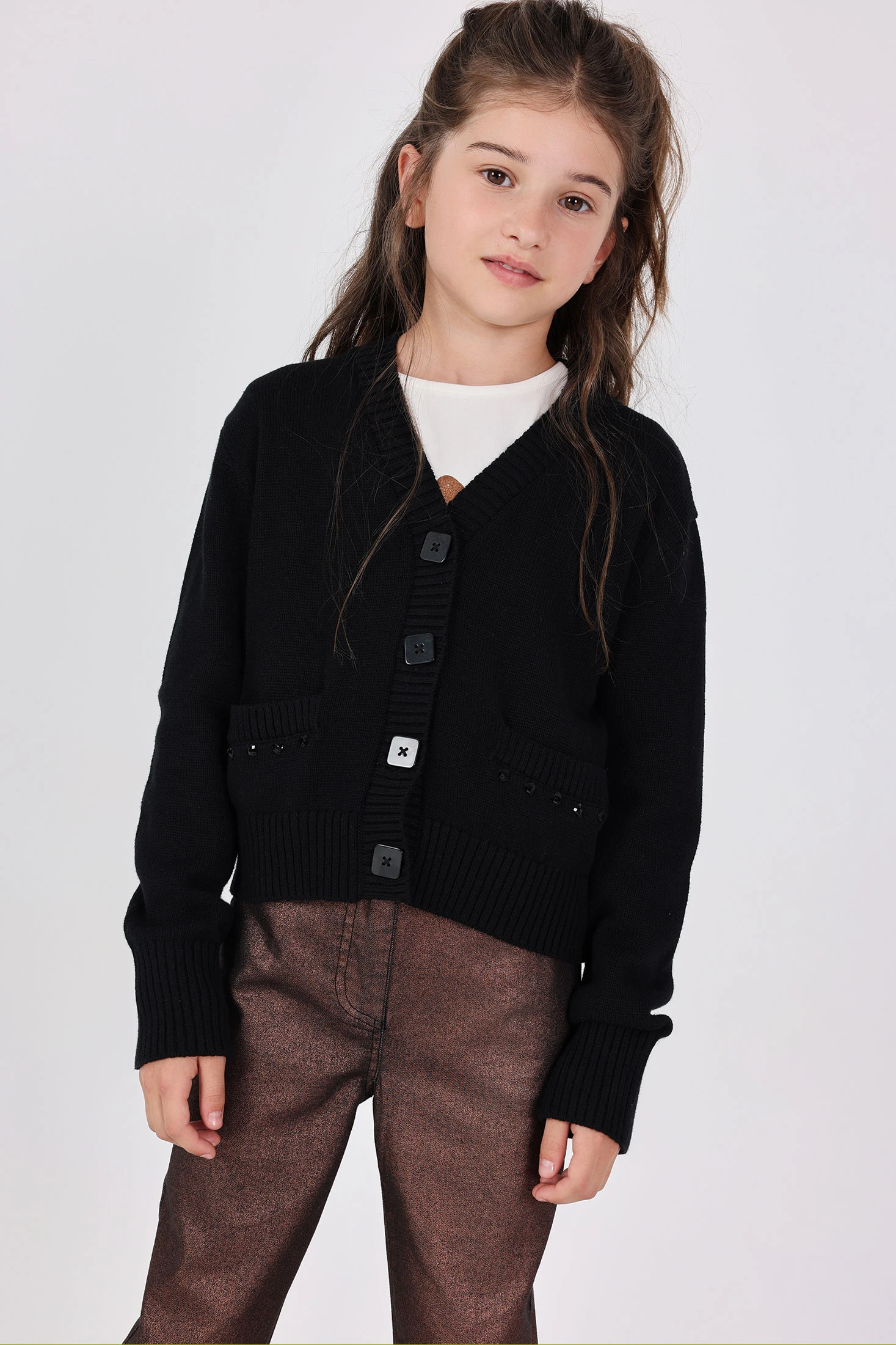 Strickjacke für Mädchen in Schwarz, entworfen, um Wärme und Stil während der kalten Jahreszeiten zu bieten. Klassisches Design mit Rundhalsausschnitt und Knopfverschluss vorne, das jedem Outfit einen eleganten Touch verleiht. Aus weichem und bequemem Stoff gefertigt, ist sie perfekt für den täglichen Gebrauch und gewährleistet Bewegungsfreiheit. Erhältlich in Größen von 2 bis 14 Jahren, passt sie sich verschiedenen Altersgruppen an und bietet eine optimale Passform. Vielseitigkeit, die es ermöglicht, sie leicht mit Kleidern, Hosen und Röcken zu kombinieren, sowohl für legere als auch formelle Anlässe geeignet.