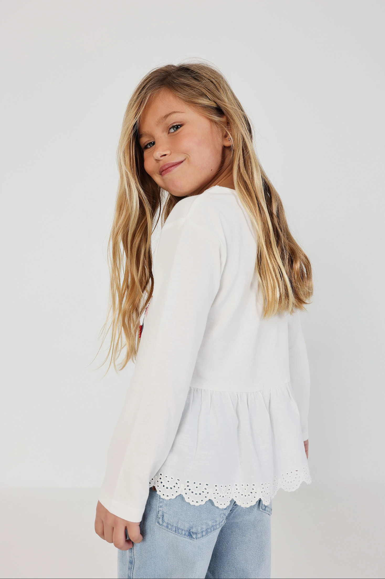 Gestricktes T-Shirt kombiniert mit besticktem Batist auf der Rückseite. In Weiß, mit einem Design, das einen bunten Druck und bestickte Details aufweist. Das T-Shirt hat einen Rundhalsausschnitt und lange Ärmel. Erhältlich in Größen von 12 Monaten bis 10 Jahren, ist es ein vielseitiges Kleidungsstück, das sich leicht mit verschiedenen Kleidungsstilen für einen lässigen und fröhlichen Look kombinieren lässt.